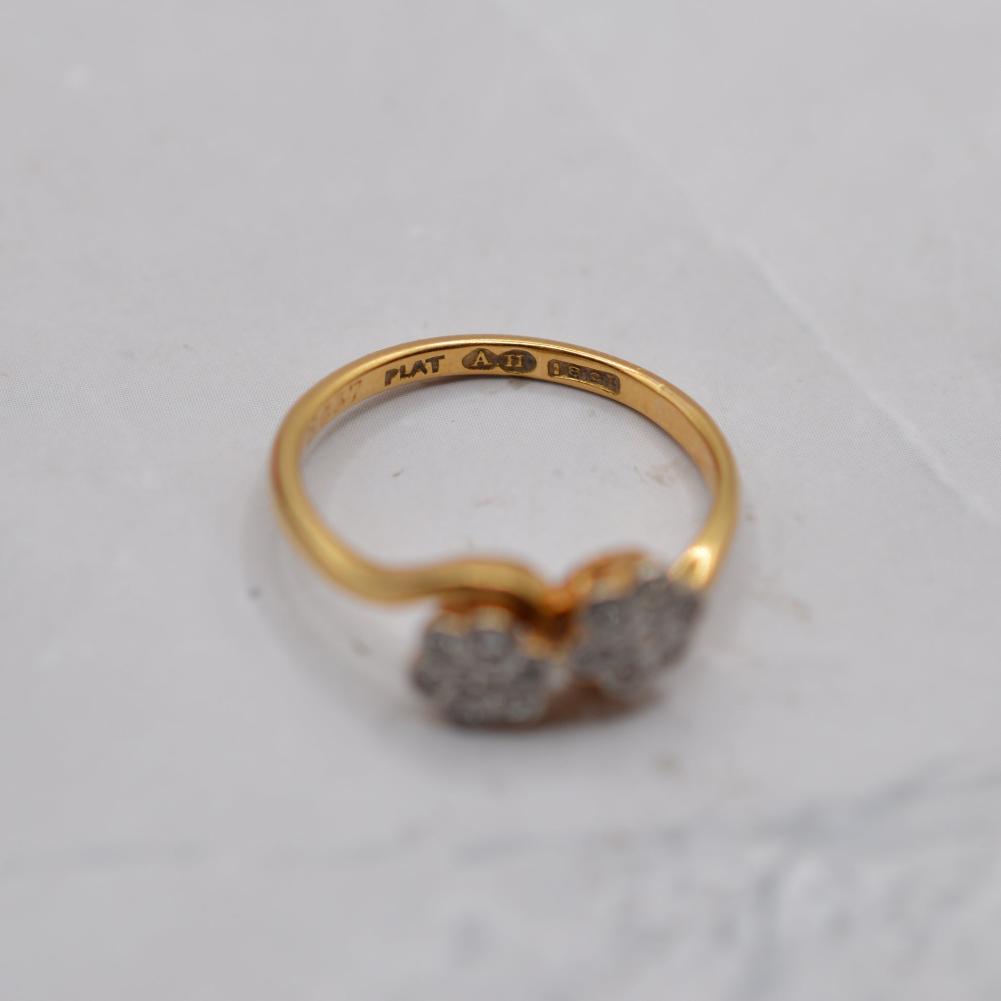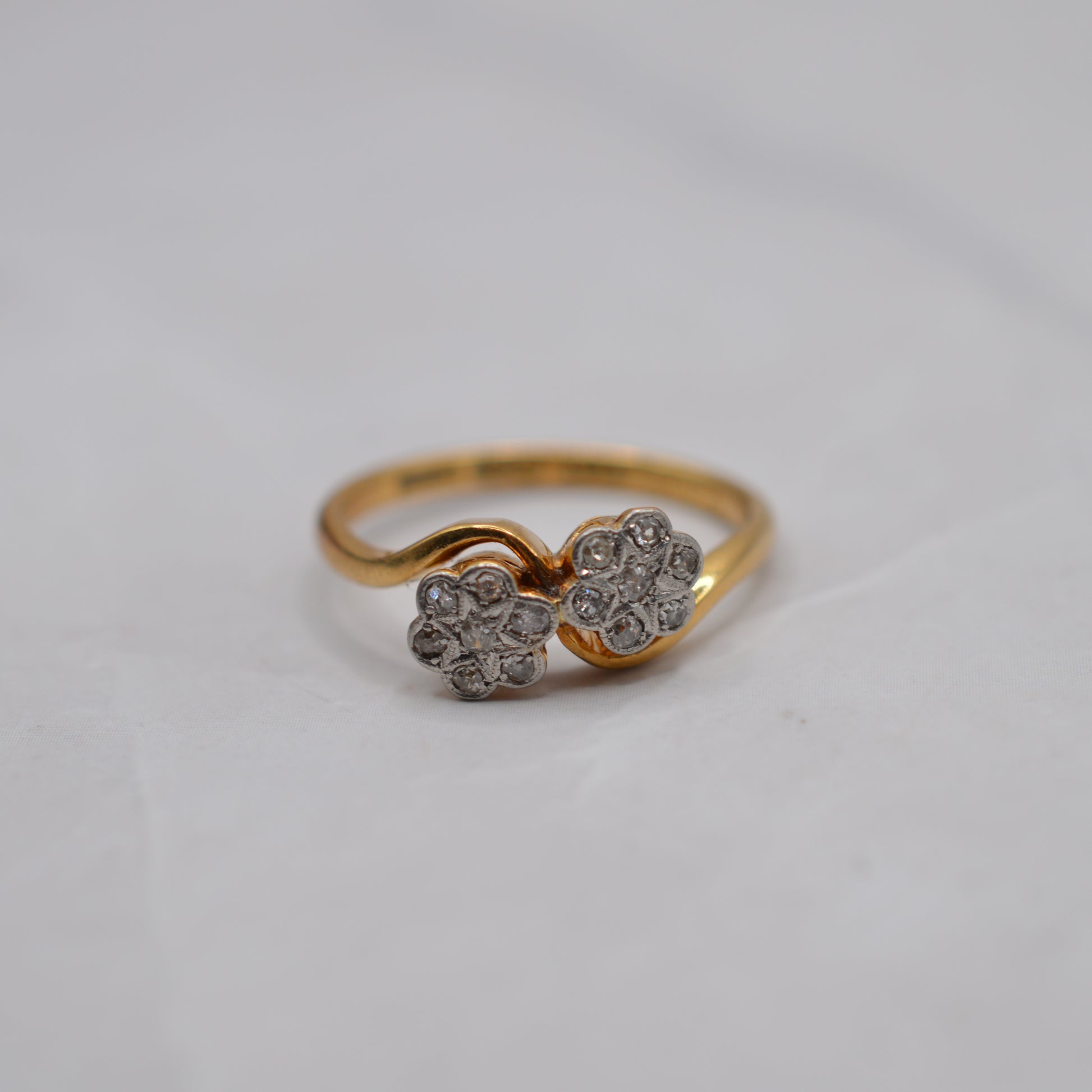 A gorgeous antique 18ct gold and platinum double diamond cluster ring. This charming piece features two petite daisy-style diamond clusters, each centred with a small old-cut diamond and surrounded by six further diamonds. The clusters each measure approximately 6mm each and wrap together beautifully in a crossover, almost 'toi-et-moi' design. The band is crafted in rich buttery yellow gold, while the diamond clusters are set in platinum to enhance sparkle.