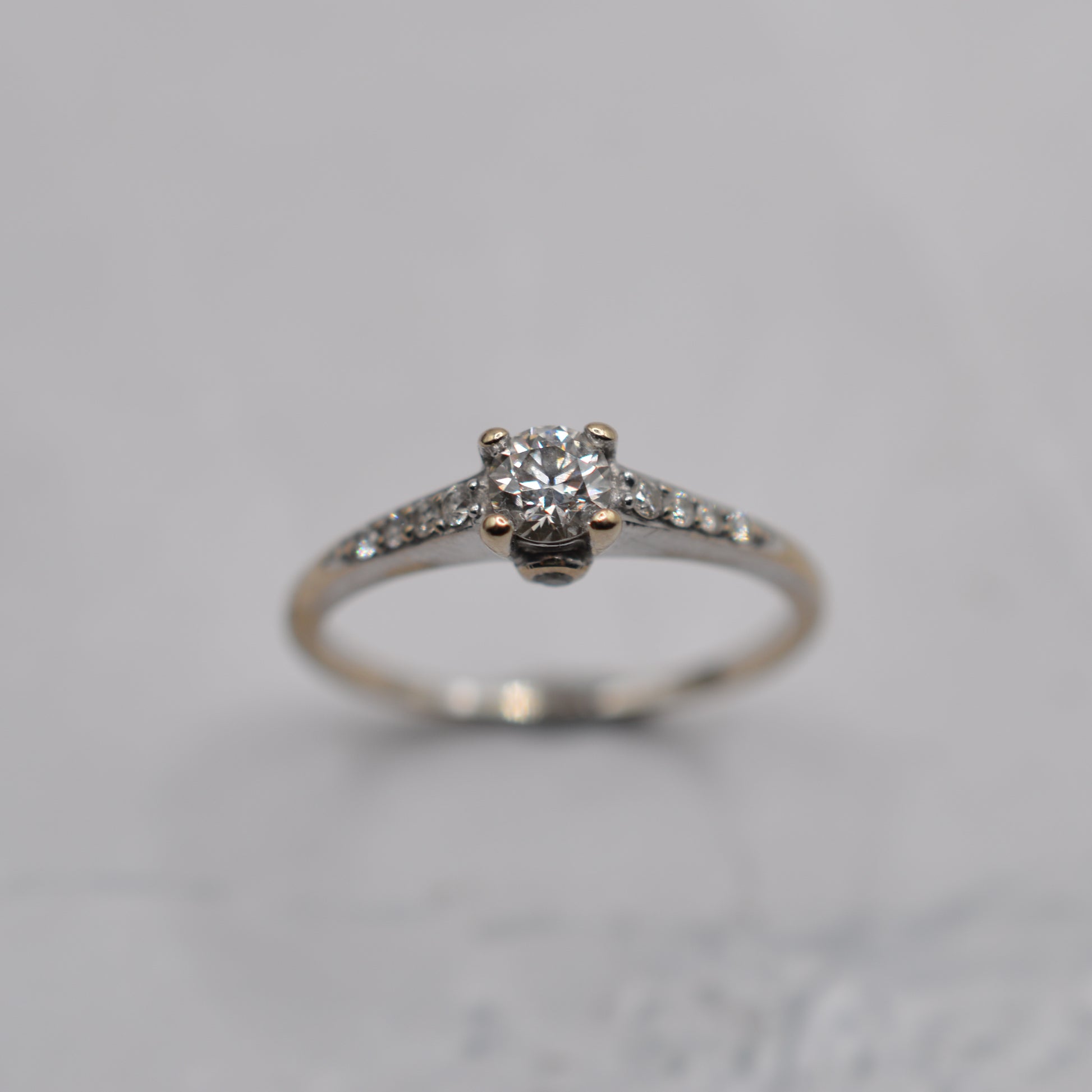 A beautiful 18ct white gold diamond ring. This little treasure features a round brilliant-cut diamond at the centre with lovely clarity and colour, flanked by diamond-set shoulders for extra dazzle; there are also two further small diamonds placed in the gallery for the principal diamond. The band is slim and tapering, making the principal stone really pop. A gorgeous treat for yourself or a loved one!