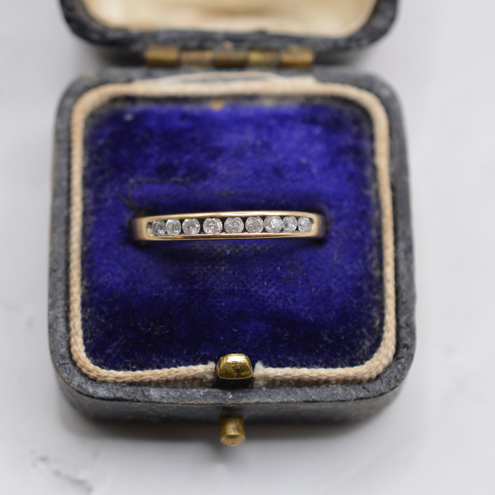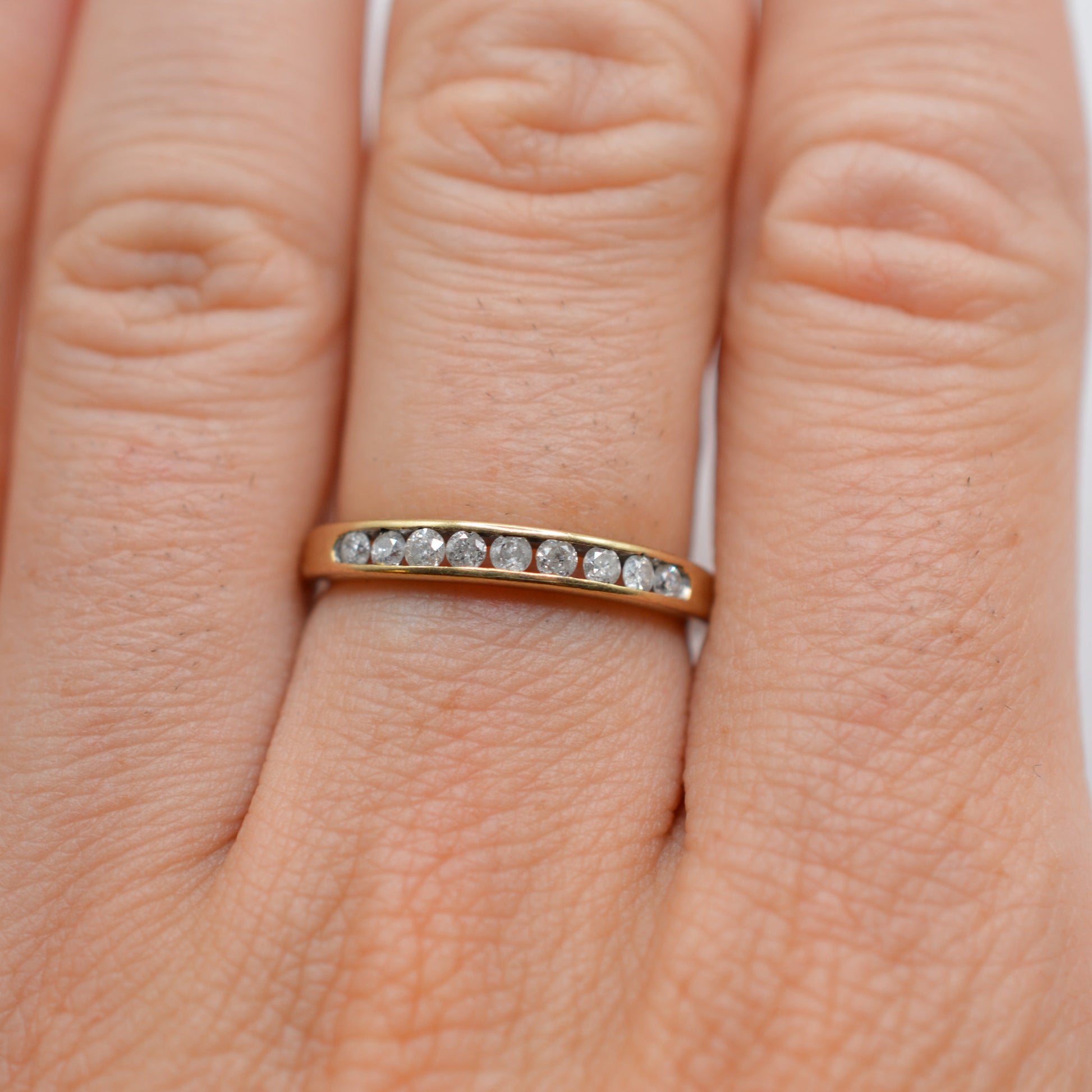 Such a pretty and classic 9ct gold diamond half-eternity ring! This lovely piece features 10 channel-set diamonds across the band, all well-matched, sparkly and totalling 0.25ct in diamond weight. A perfect minimalist standalone ring or works wonderfully as part of a stacking ring set.