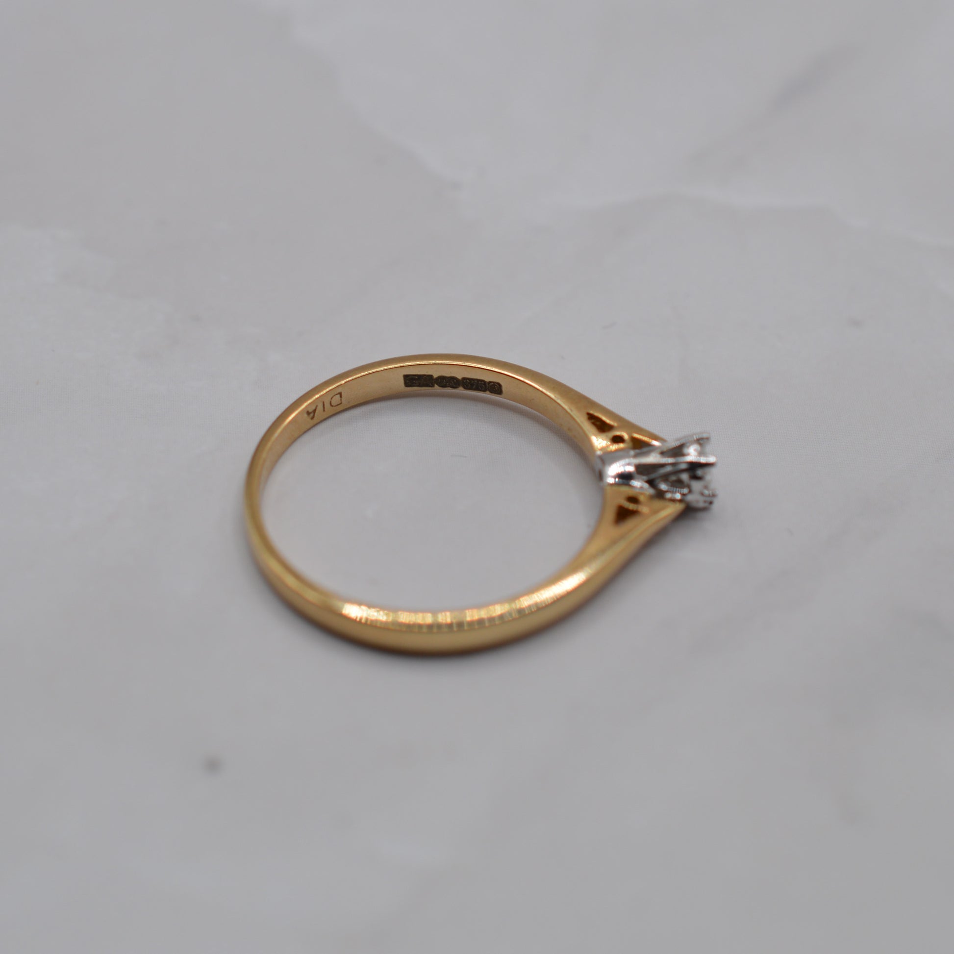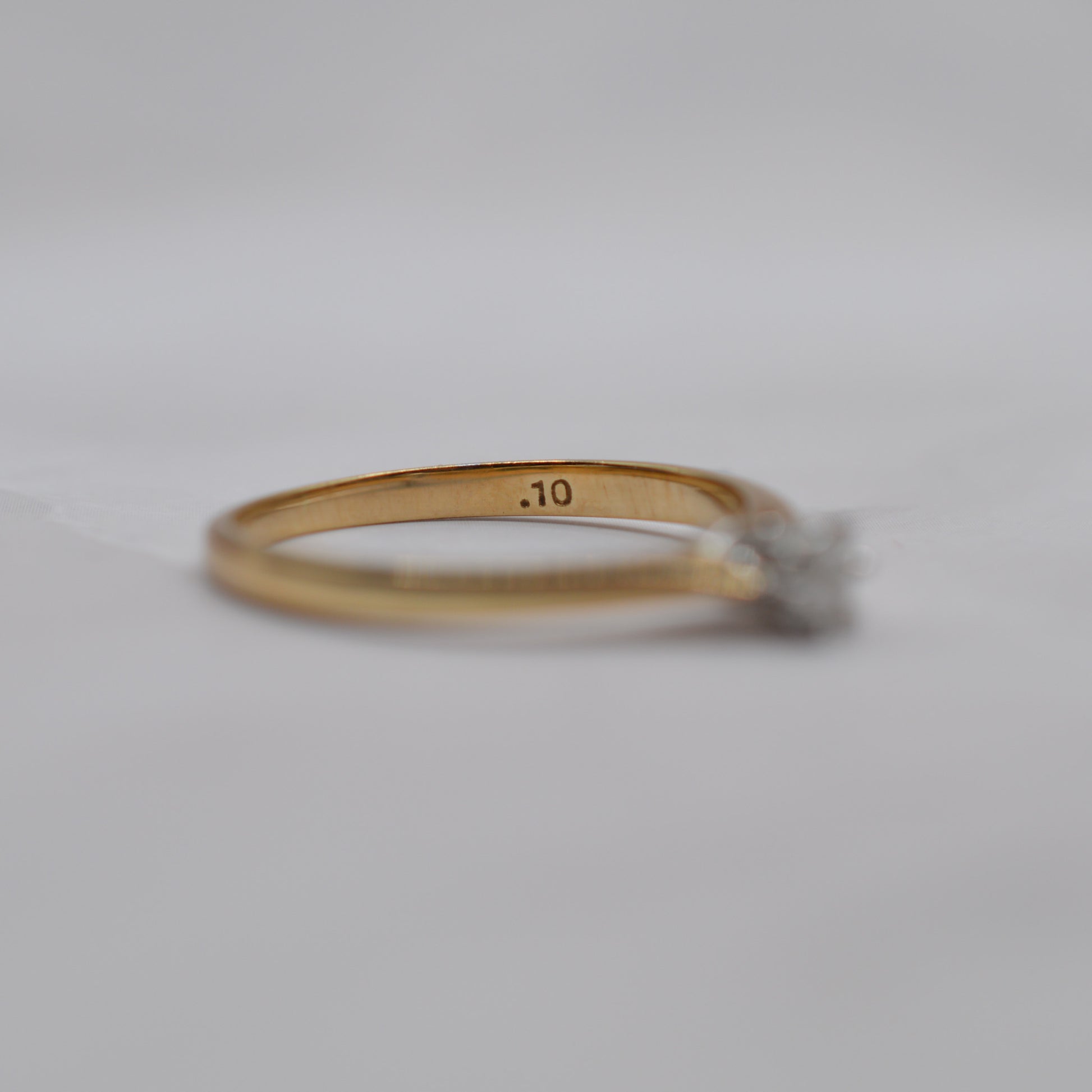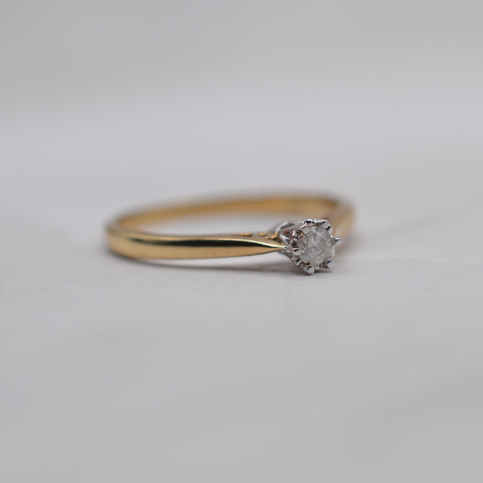 A sweet and classic 9ct gold diamond solitaire ring. This adorable preloved piece features a brilliant-cut diamond (approx. weight 0.10ct), held in a raised prong setting that lets the stone sparkle beautifully. A lovely minimalist piece, perfect as a promise ring, stacking staple or everyday treasure.