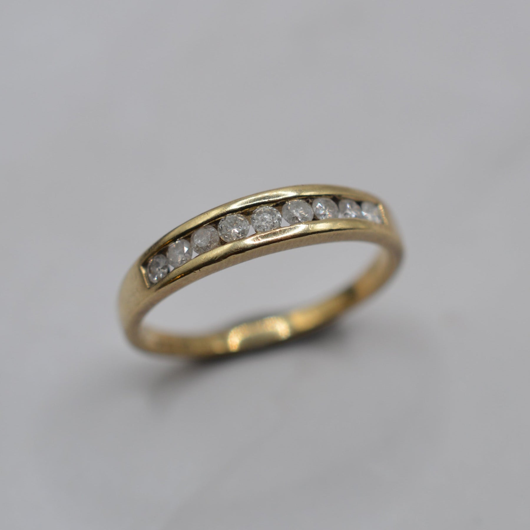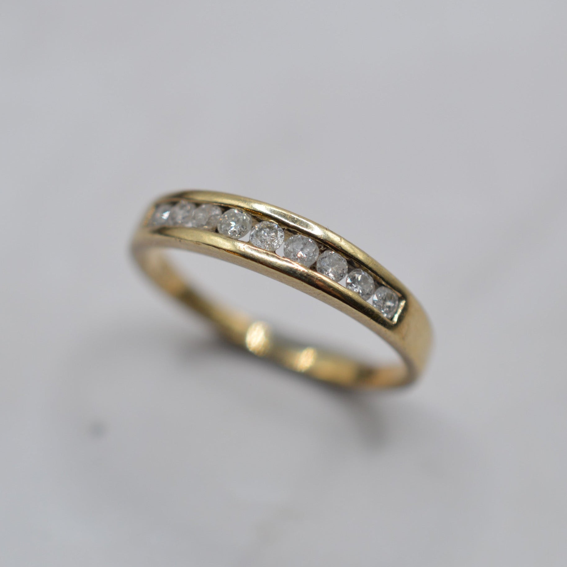 A delightful 9ct gold diamond half-eternity ring. This preloved sparkly piece features nine channel-set diamonds across the band, totalling approx. 0.25ct, all set in a thick and polished yellow gold band. A perfect minimalist ring with a little dazzle, ideal worn alone or as part of a stacking ring set.