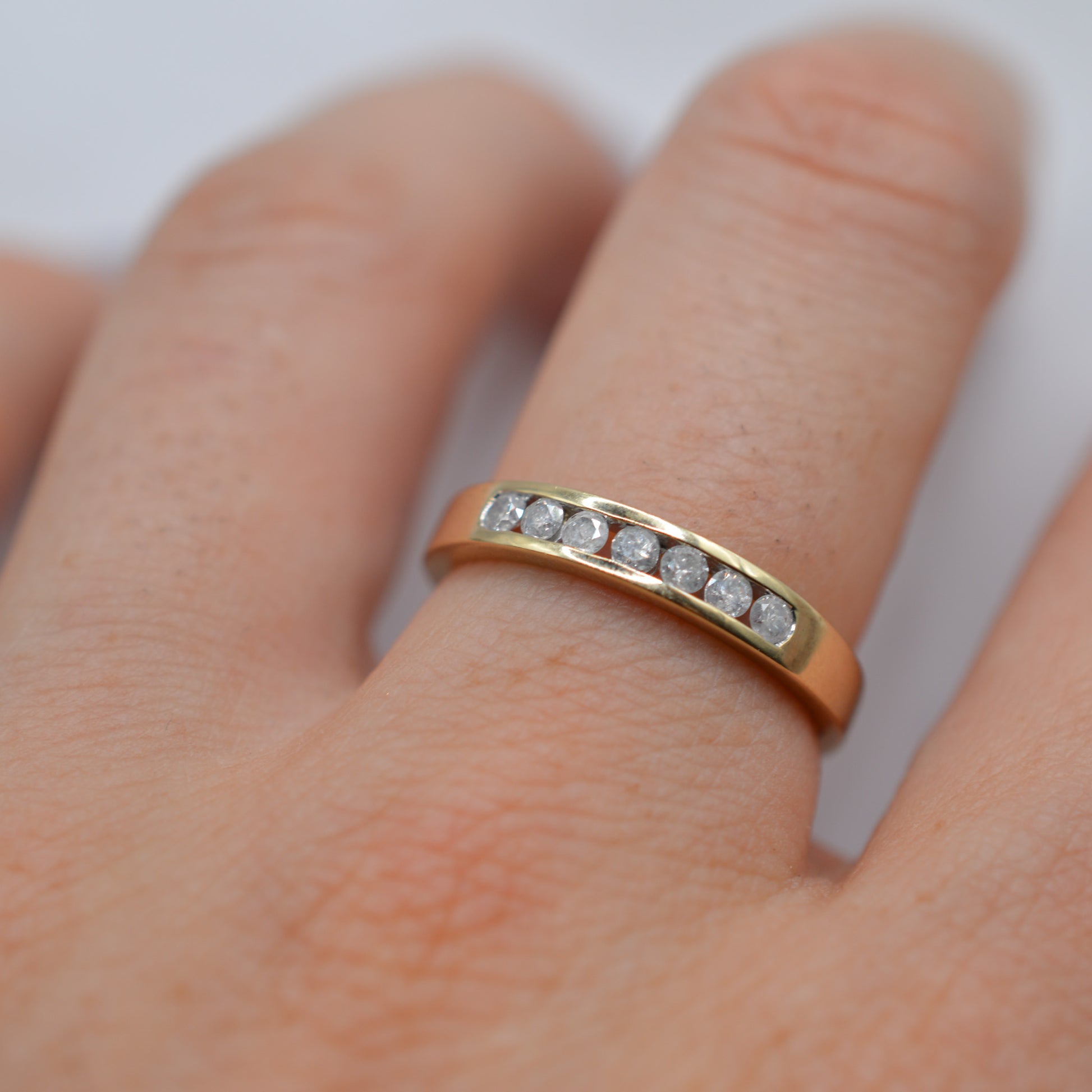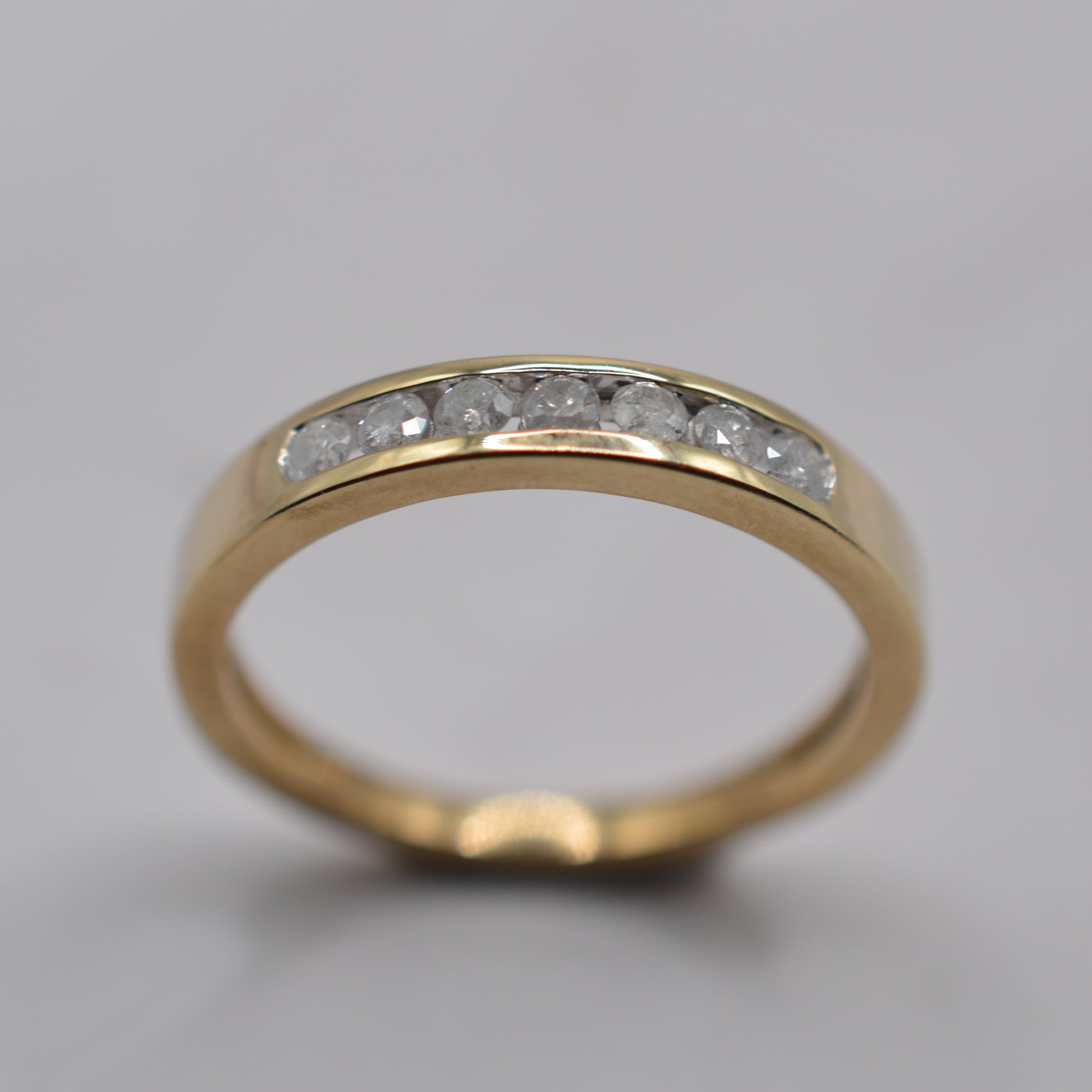A very pretty and sparkly 9ct gold diamond half-eternity ring. This lovely preloved piece features a row of seven bright, brilliant-cut diamonds, channel-set in a shiny yellow gold band. A timeless and elegant design that works perfectly as a minimalist standalone ring or stacked with others.