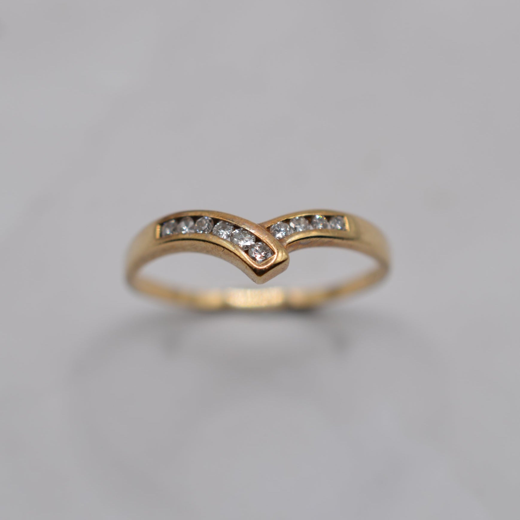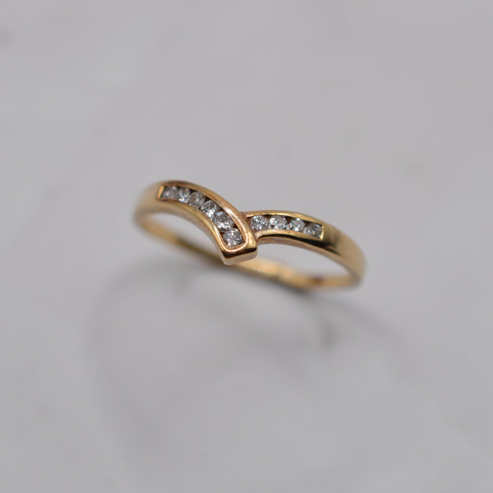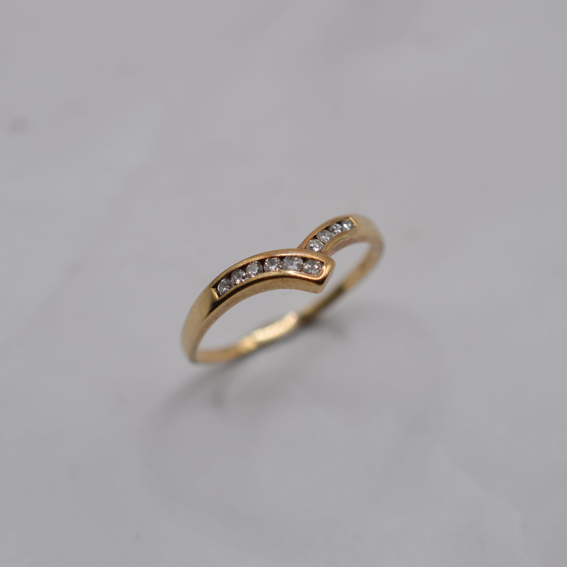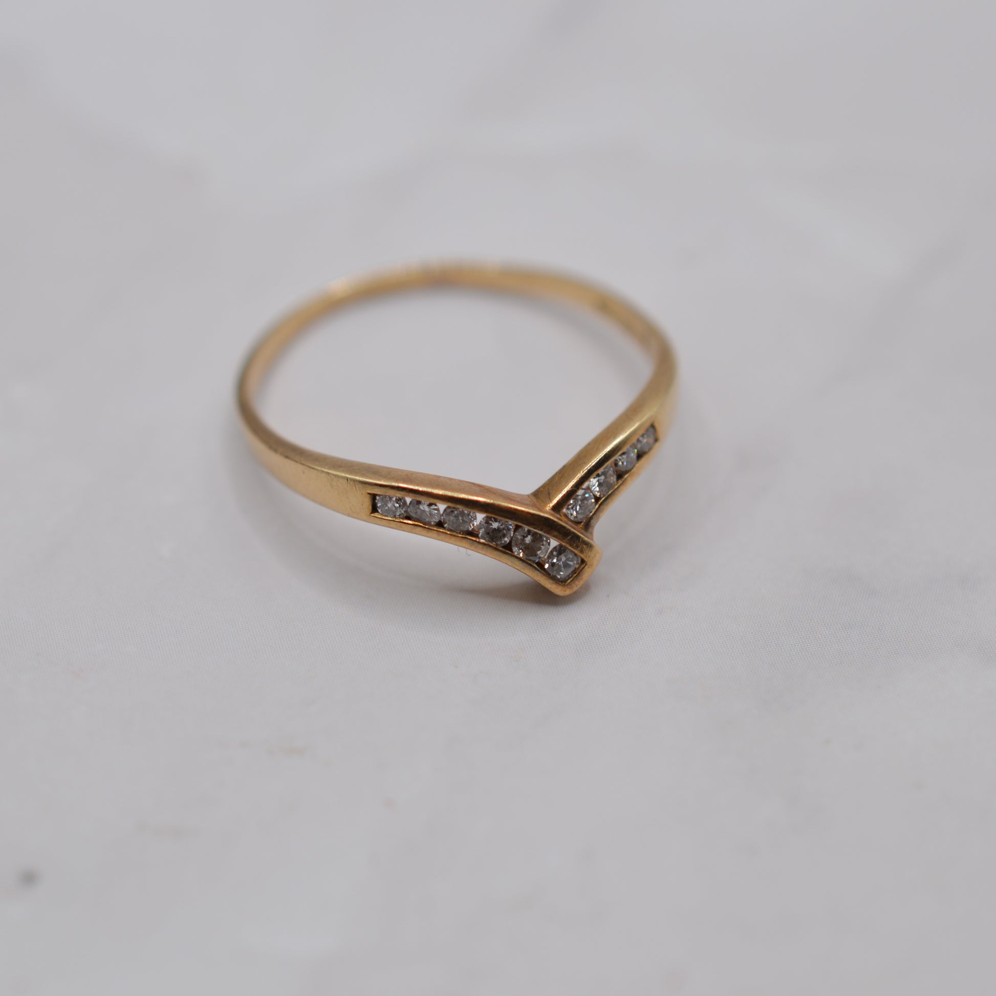 A rather beautiful 9ct gold wishbone diamond ring! This charming 1980s piece features an asymmetric wishbone design, with one side of the V delicately overlapping the other. Set into the curve are ten channel-set sparkling, brilliant-cut diamonds, adding a pop of sparkle and luxury. A sweet, versatile ring that looks lovely worn alone or stacked with others.