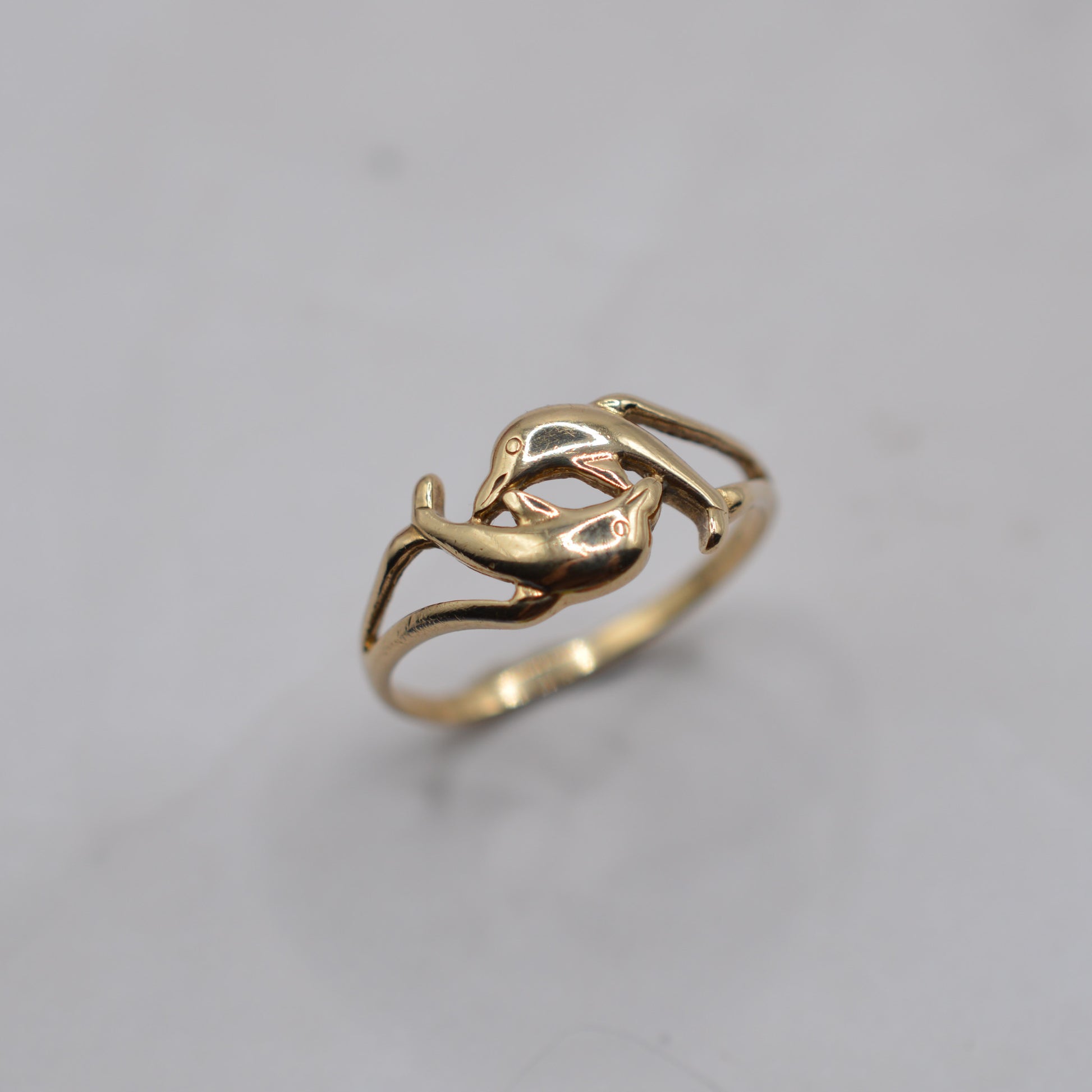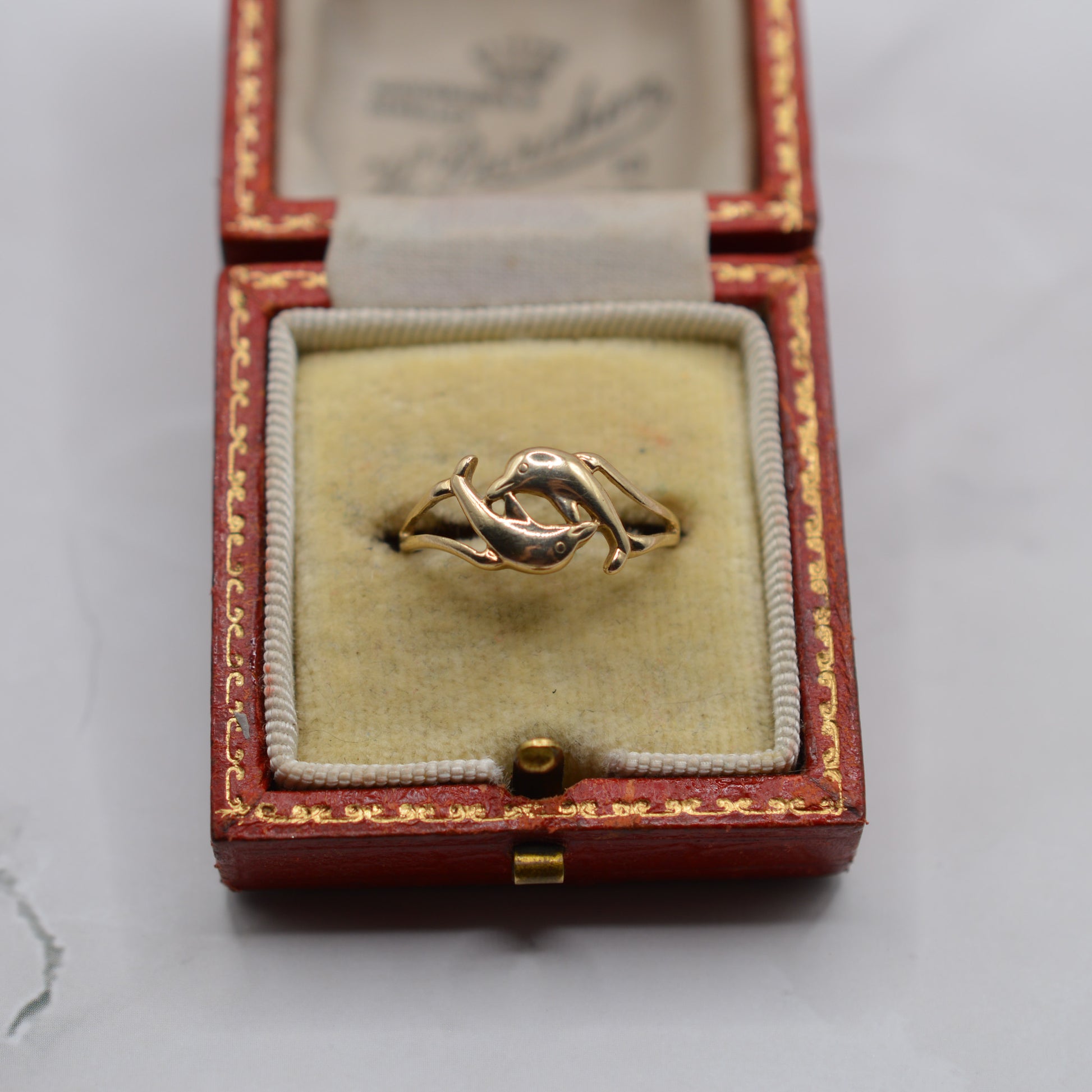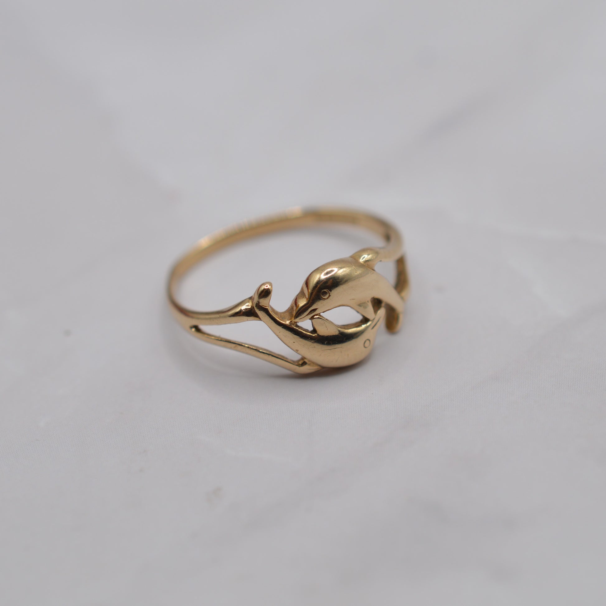 A rather sweet and charming 9ct yellow gold dolphin ring. This adorable design features two dolphins (one facing up, one upside down) tucked together between two split shoulders in a yellow gold band. A perfect everyday choice for animal lovers, ocean enthusiasts, or anyone who just adores dolphins!
