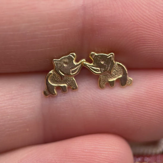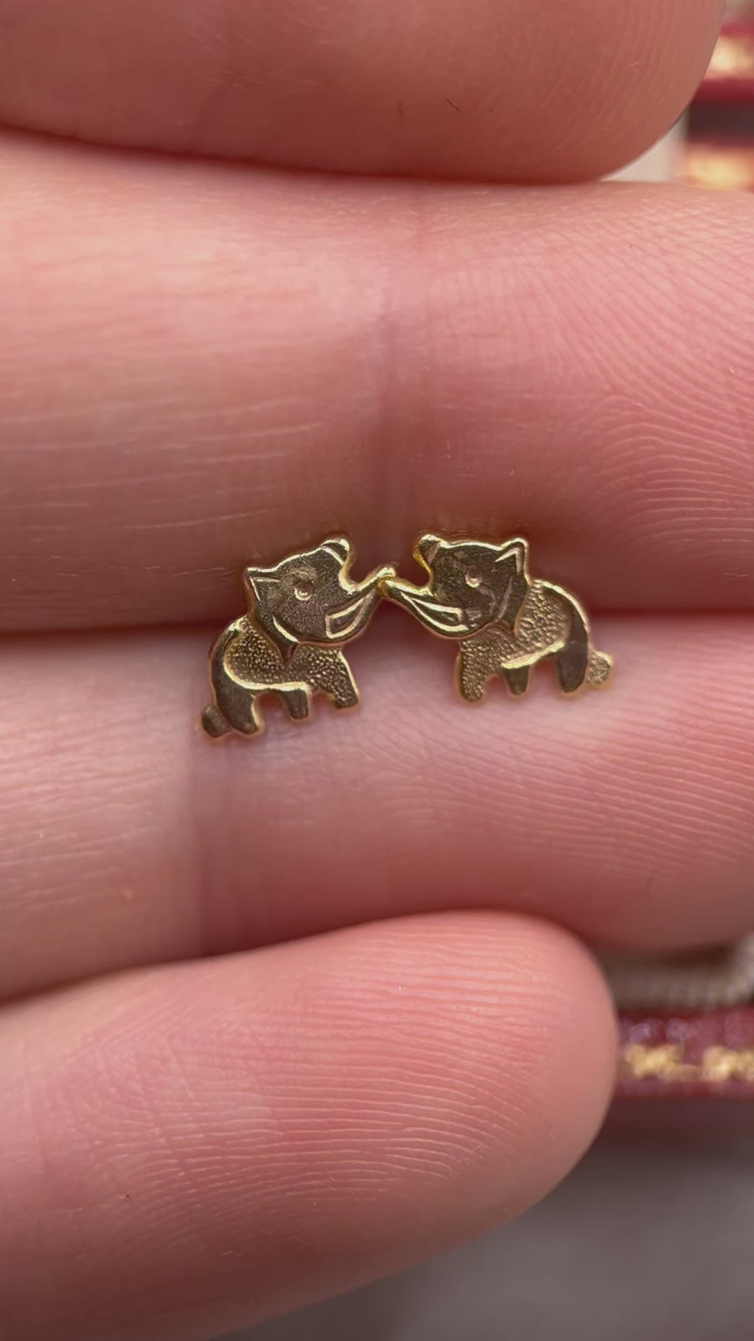 A delightful pair of vintage 9ct gold elephant stud earrings! Each earring features an adorable elephant design with a textured, planished effect on the body, adding a touch of whimsy and charm. Perfect for animal lovers!