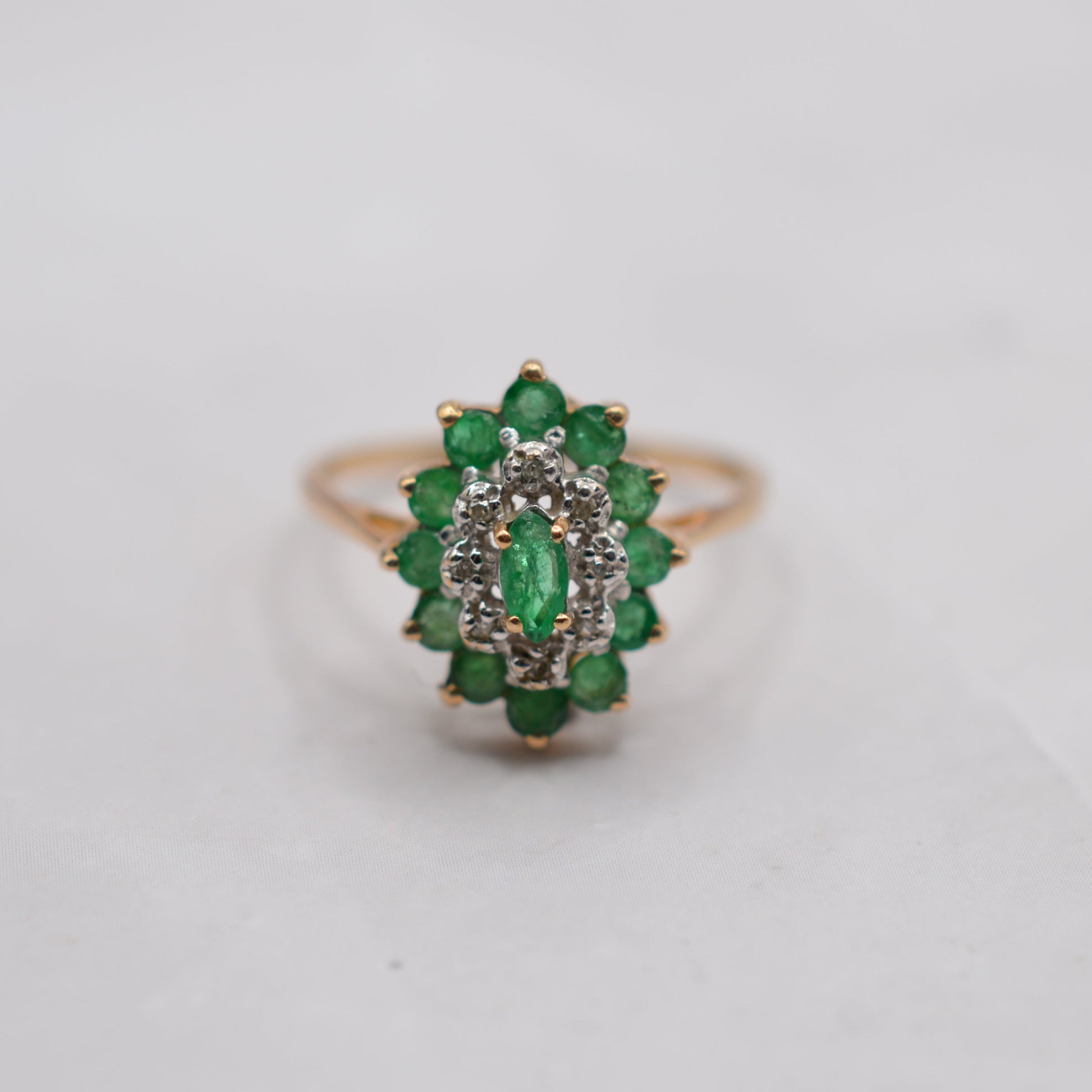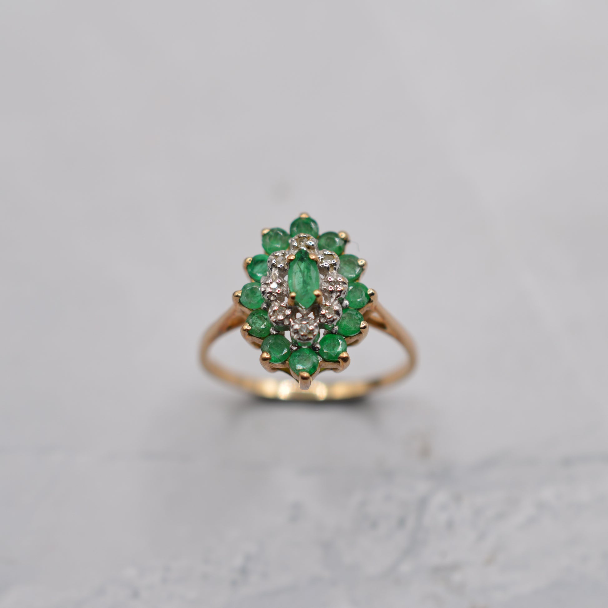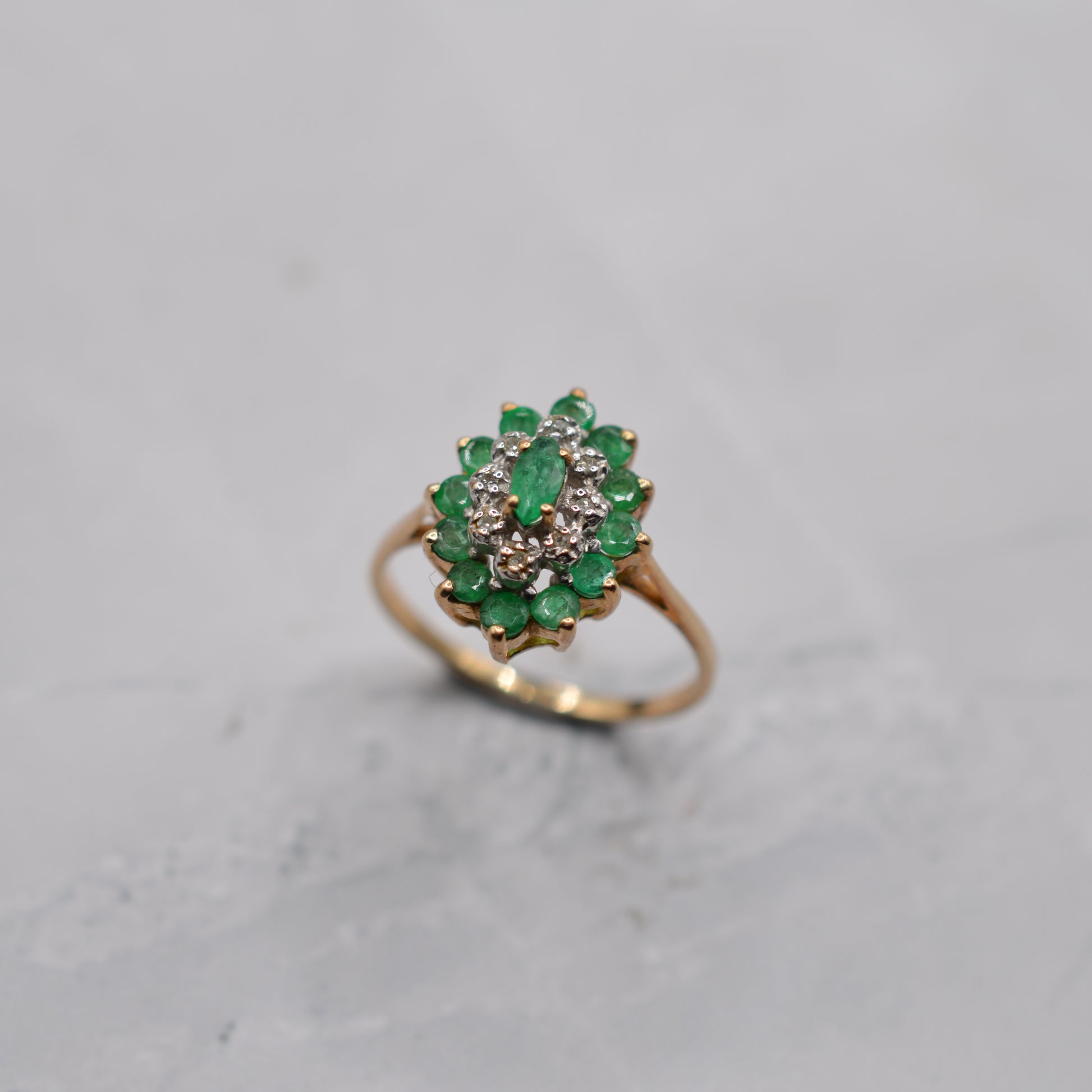 1980s 9ct Gold Emerald & Diamond Marquise Cluster Ring