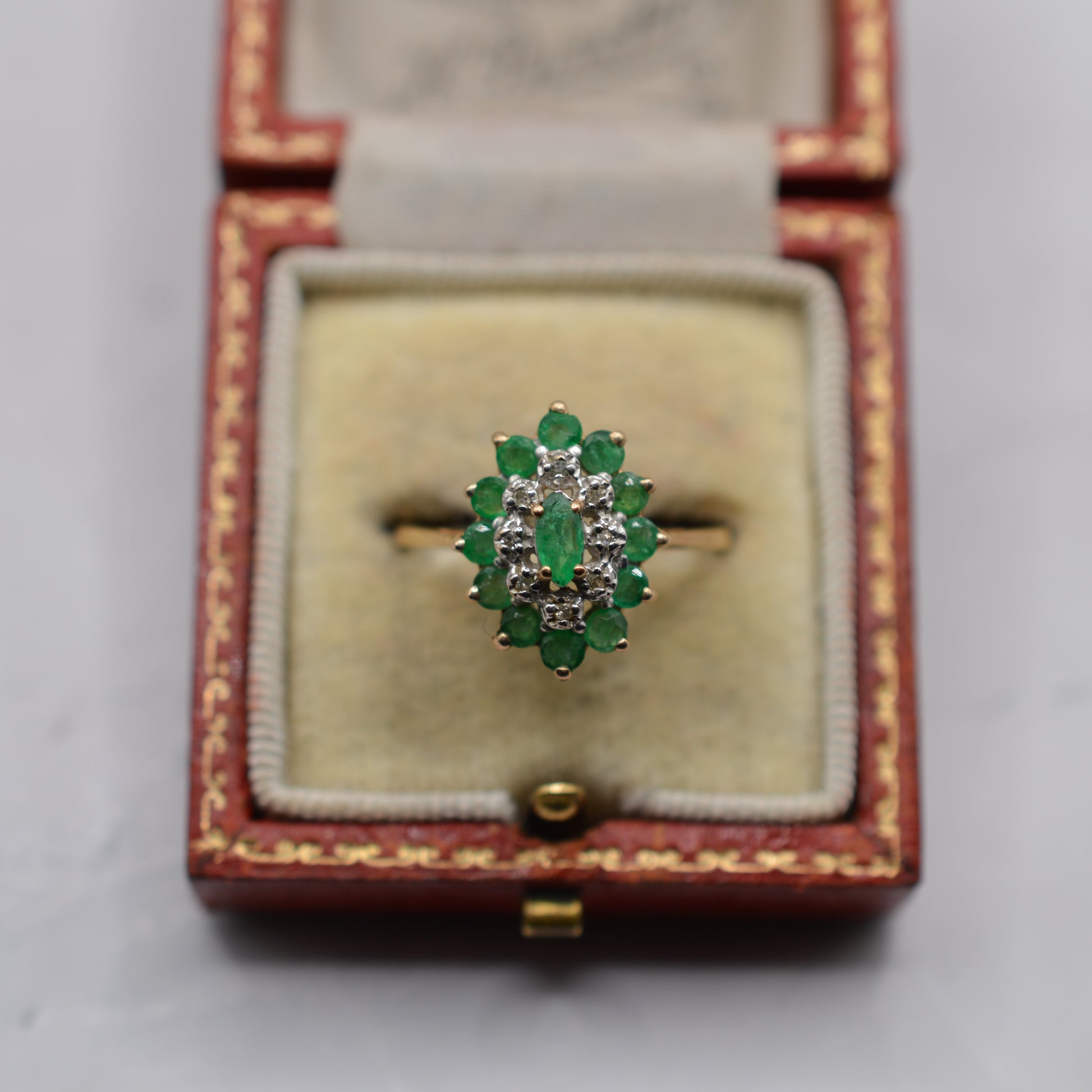 A beeeautiful 1980s 9ct gold emerald and diamond marquise cluster ring. This lovely vintage piece features a marquise-cut emerald at the centre, framed by a small surround of dainty diamond chips, and finished with an outer halo of rich meadow-green round-cut emeralds. The cluster is large and eye-catching, with the marquise shape giving a beautiful, flattering fit across the finger. A classic, timeless design, perfect for the emerald lovers among us!