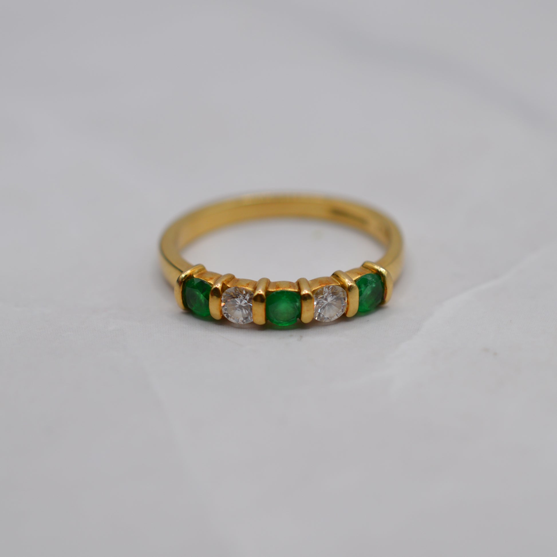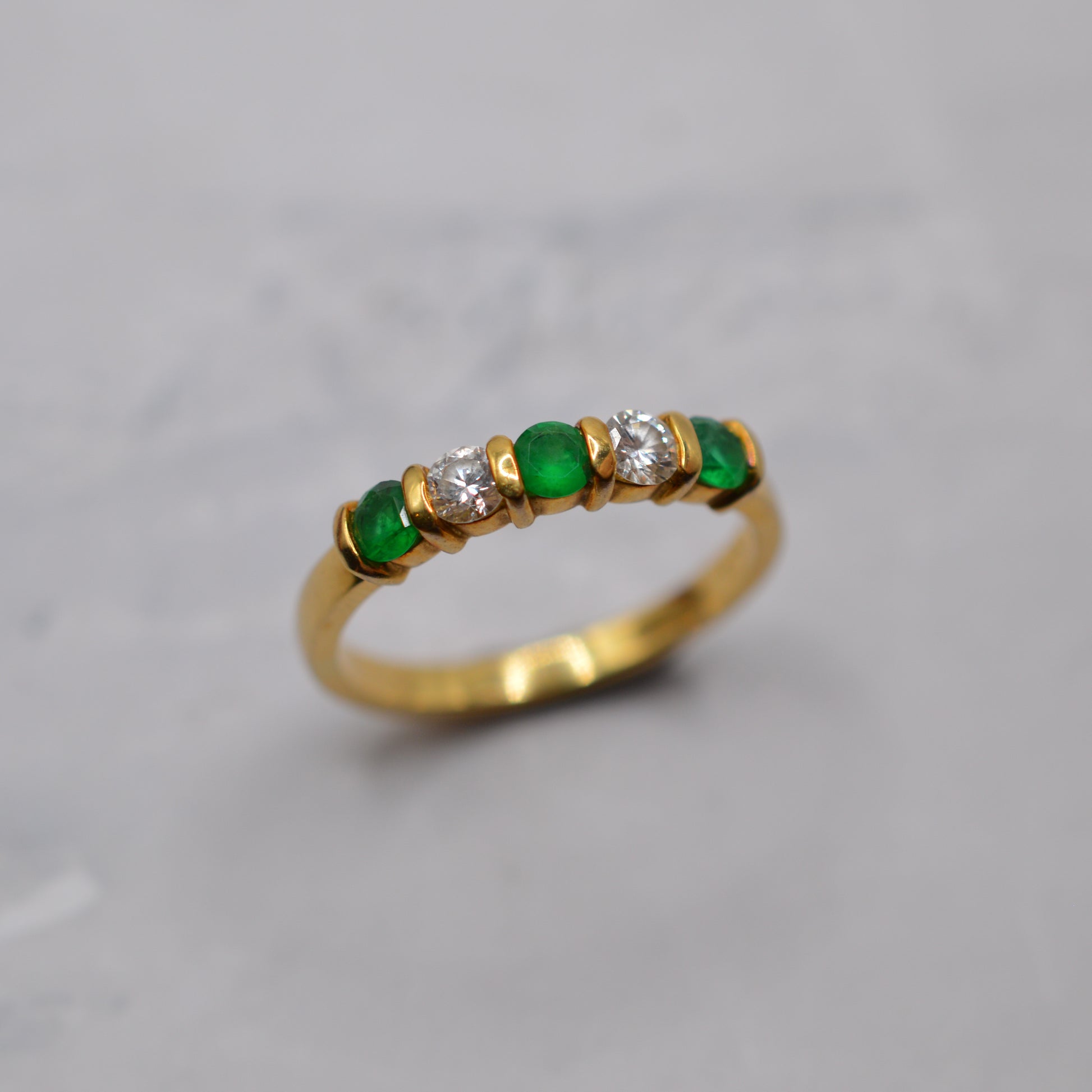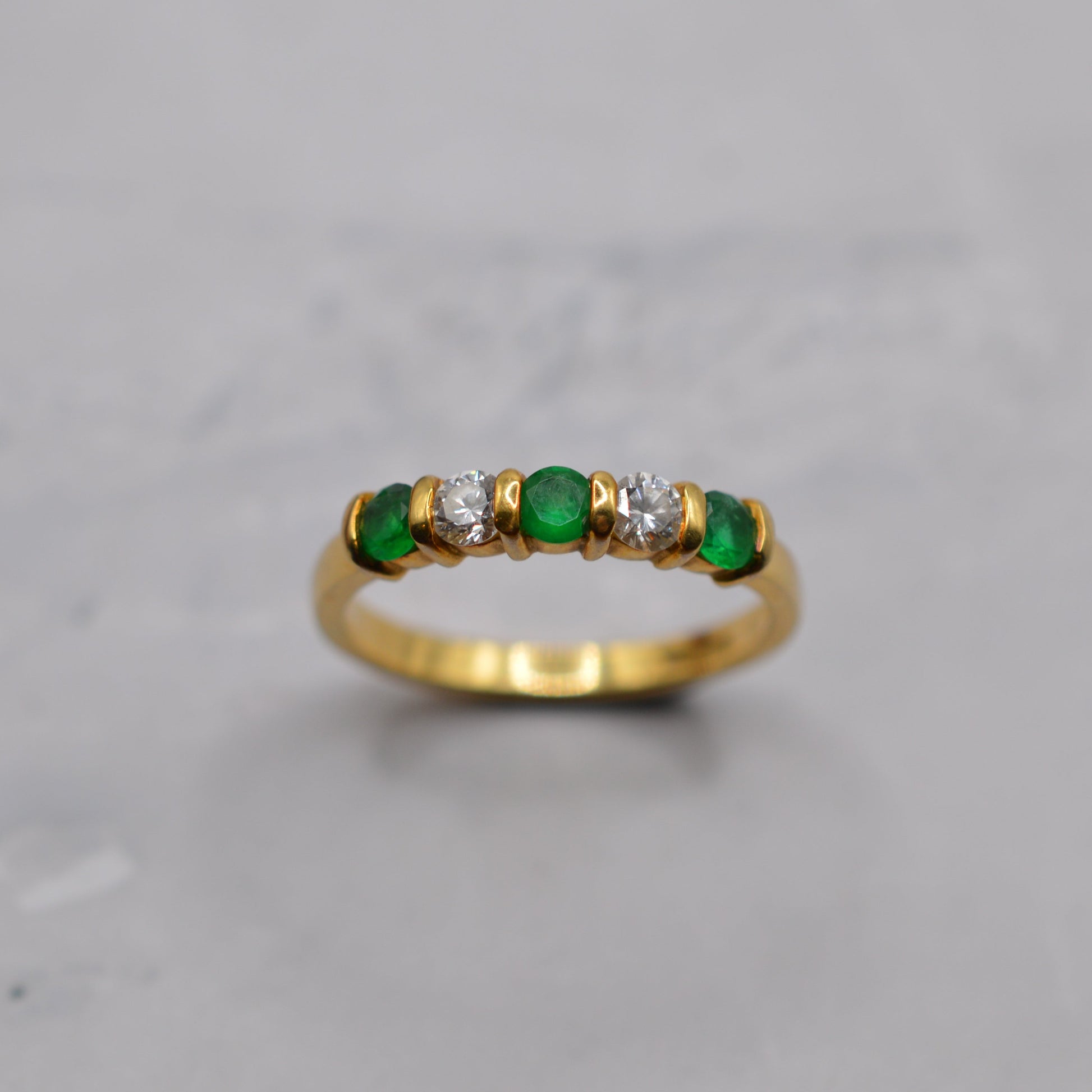 A stunning 18ct gold emerald and diamond five-stone ring. This beautiful 1990s piece features an elegant alternating row of rich green emeralds and sparkling brilliant-cut diamonds set across the band. The emeralds display a wonderfully lush green colour, perfectly complemented by the bright sparkle of the diamonds, with the stones set into a smooth buttery gold band with gorgeous spacers between them. A lovely ring that would make a perfect anniversary gift, engagement ring, May birthstone piece, or simply a special treat for yourself!