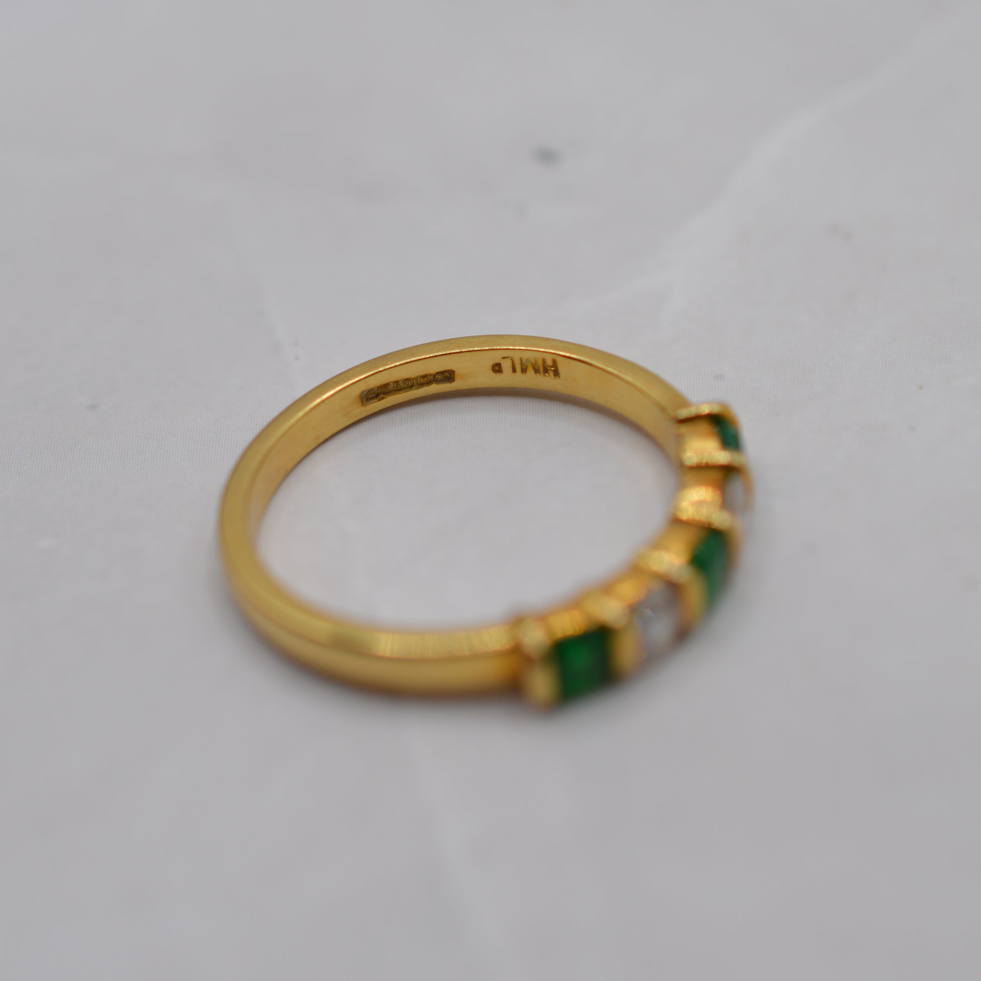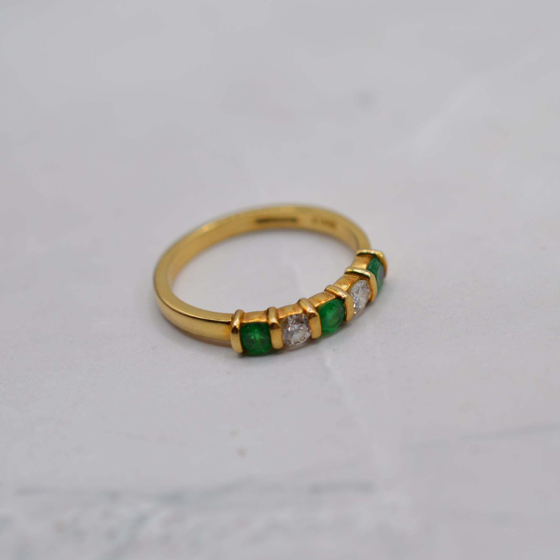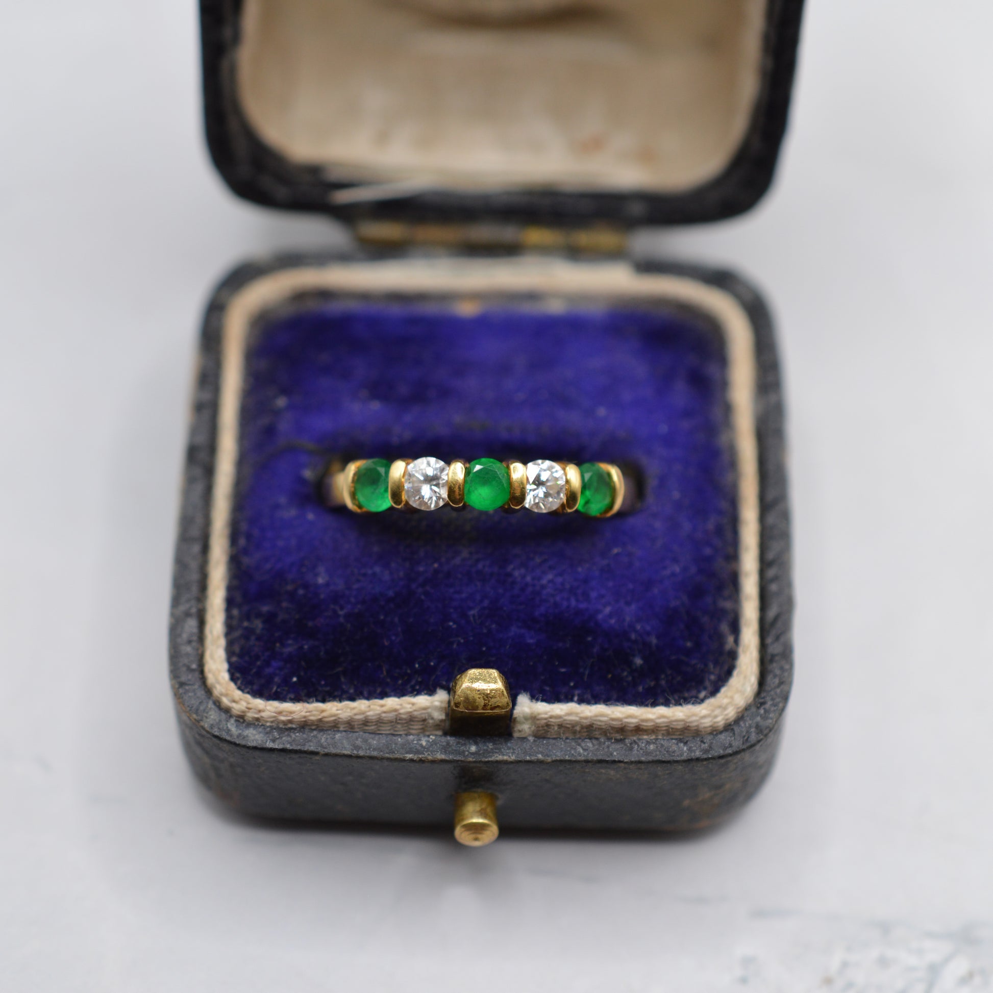 A stunning 18ct gold emerald and diamond five-stone ring. This beautiful 1990s piece features an elegant alternating row of rich green emeralds and sparkling brilliant-cut diamonds set across the band. The emeralds display a wonderfully lush green colour, perfectly complemented by the bright sparkle of the diamonds, with the stones set into a smooth buttery gold band with gorgeous spacers between them. A lovely ring that would make a perfect anniversary gift, engagement ring, May birthstone piece, or simply a special treat for yourself!