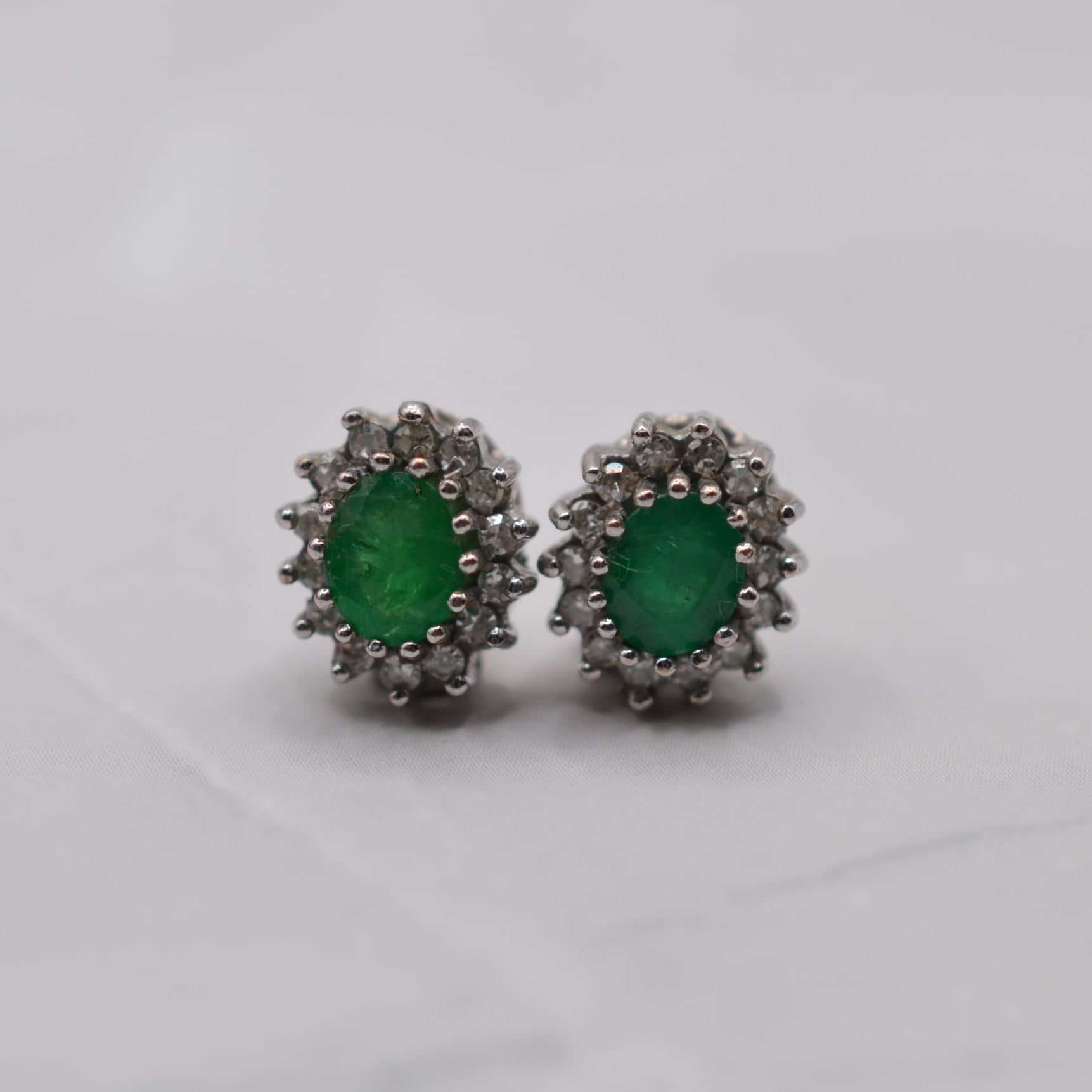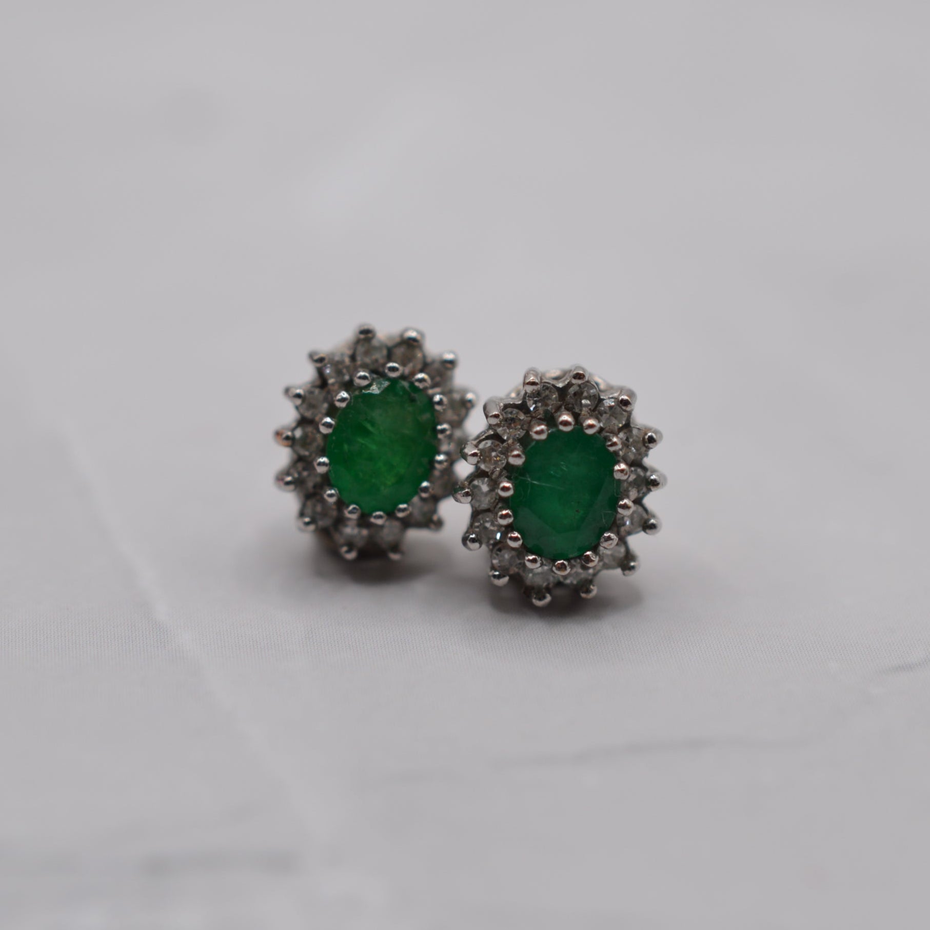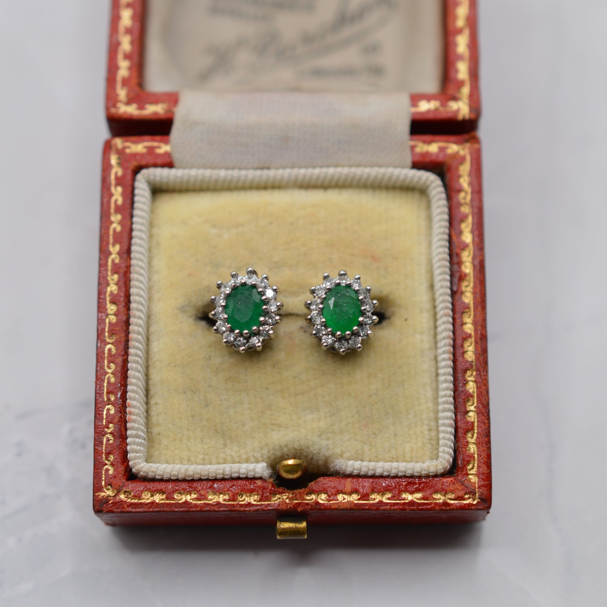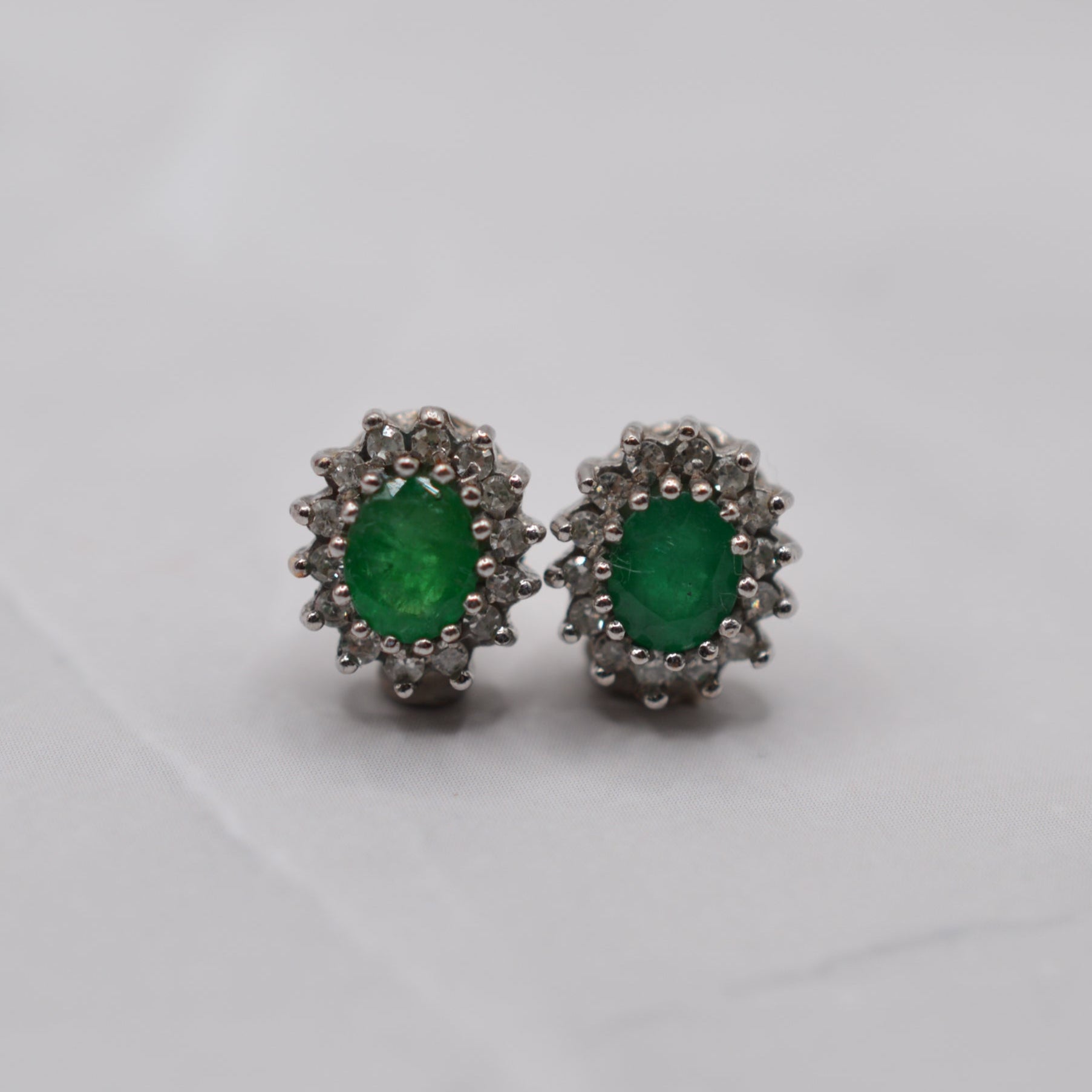 A very pretty pair of 9ct gold emerald & diamond cluster earrings from the 1990s. Each stud features an oval emerald in a vibrant shade of green, framed by a halo of 14 sparkling single-cut diamonds. Classic and elegant, these earrings are wonderfully versatile, being perfect for special occasions or adding everyday sparkle.