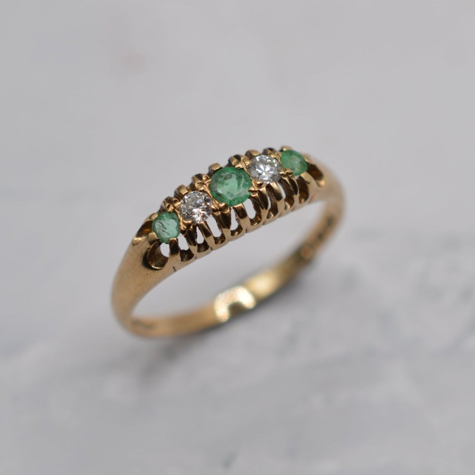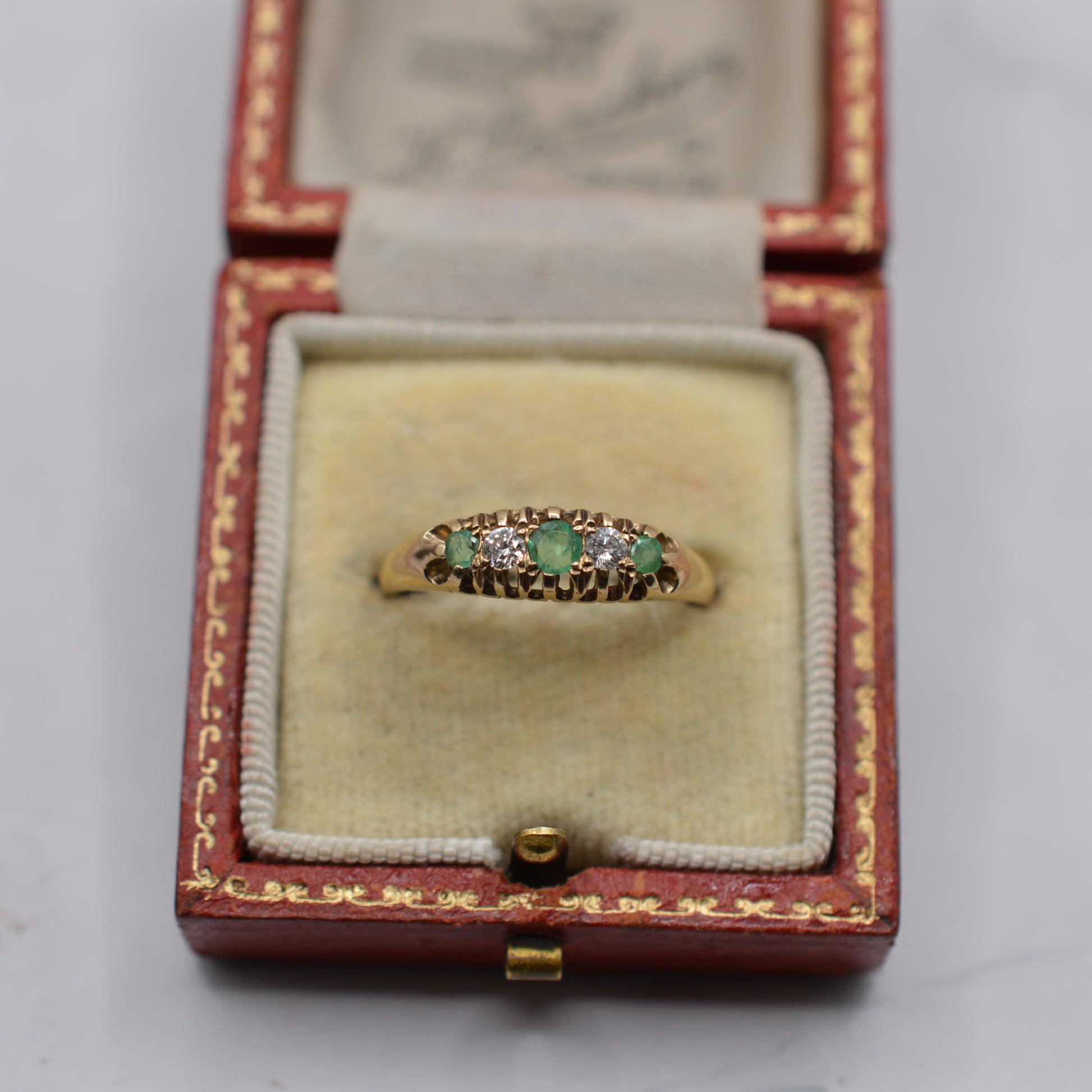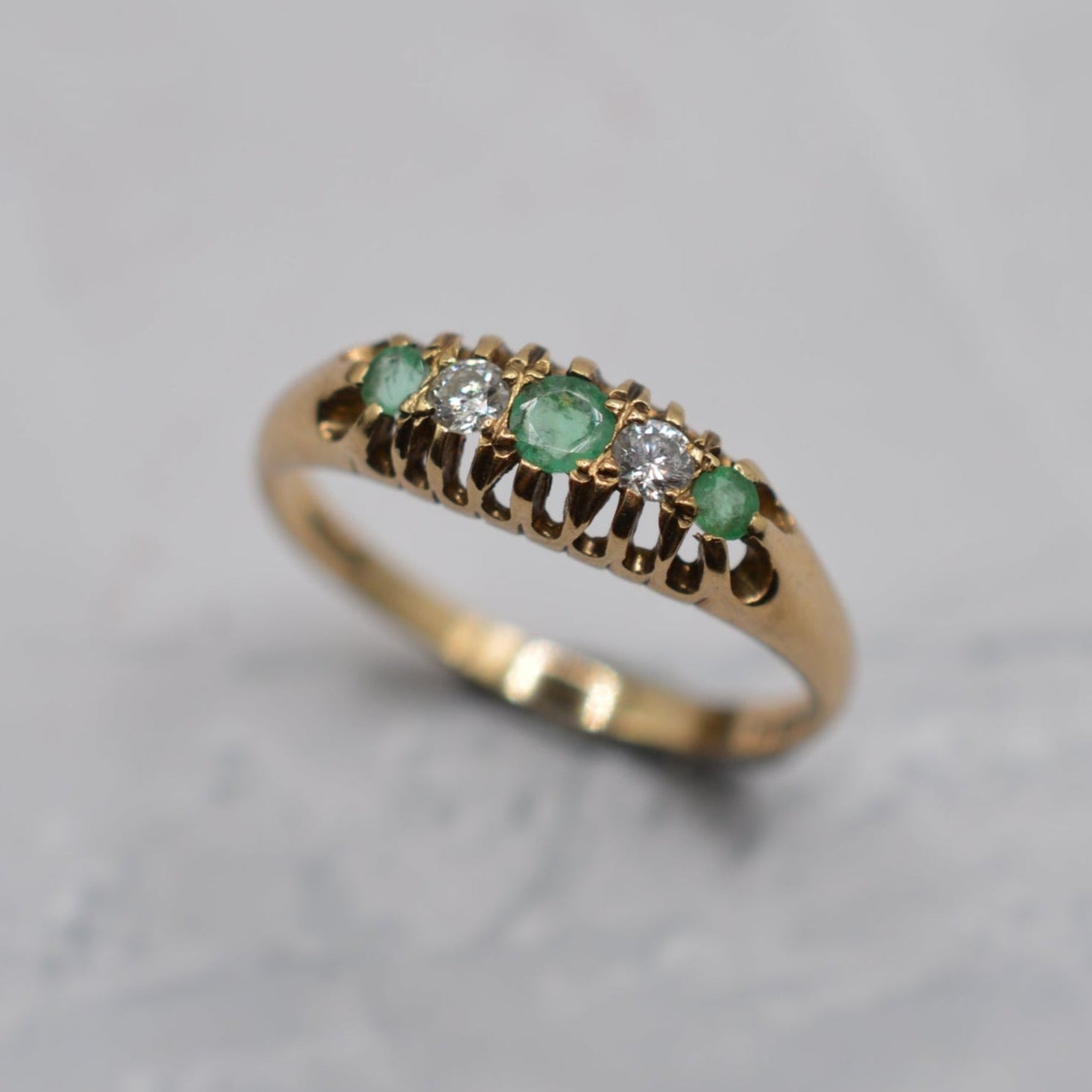 An utterly beeeeautiful vintage 9ct gold emerald and diamond five-stone ring. This gorgeous ring is designed in a classic Victorian style, with an alternating row of three lush green emeralds and two sparkling brilliant-cut diamonds. The gemstones are gypsy-set into a beautiful luminous yellow gold band and are well-matched and proportionate. Such a pretty and luxurious piece!