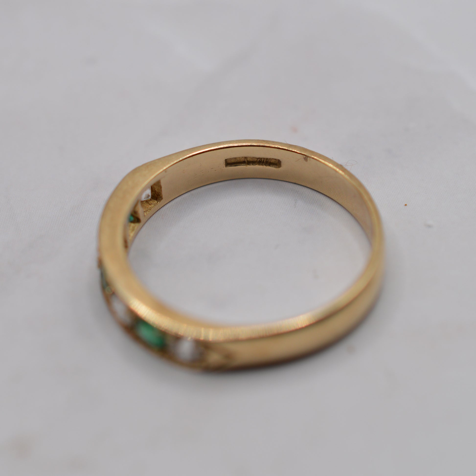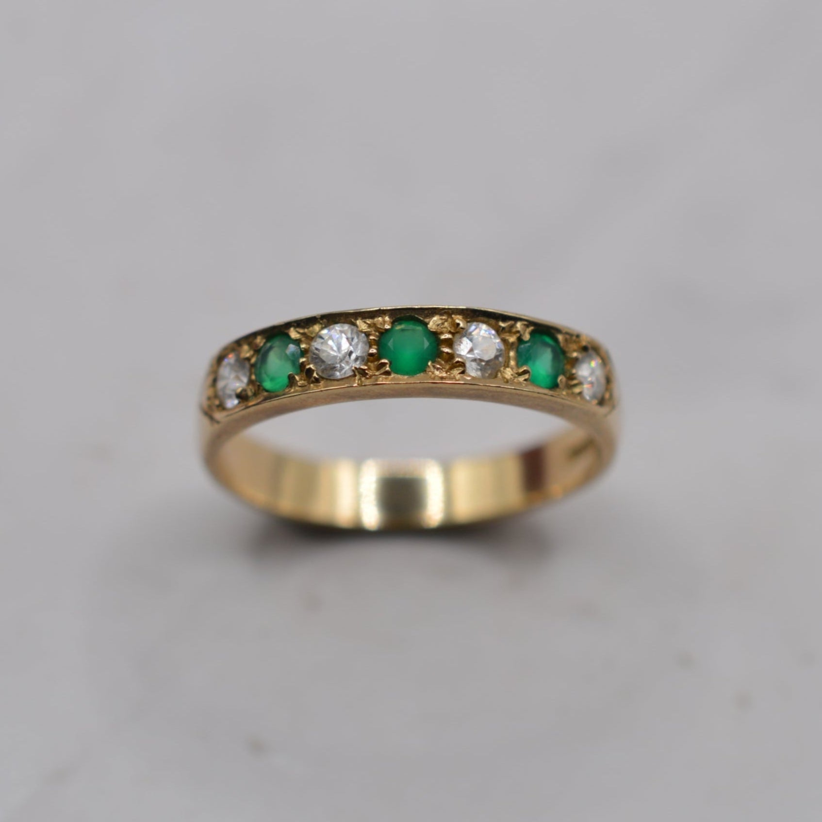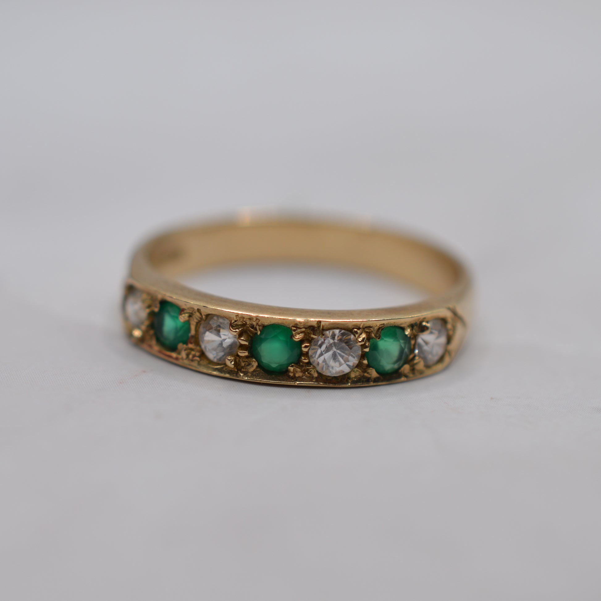 A rather pretty and sparkly 9ct gold half-eternity ring! This lovely design features an alternating row of lush green emeralds and bright white cubic zirconia, a colourful and sparkly collection of stones that are set in a thick, shiny yellow gold band. It's a versatile ring that works beautifully on its own as a statement piece or stacked alongside other rings for a chunkier look.