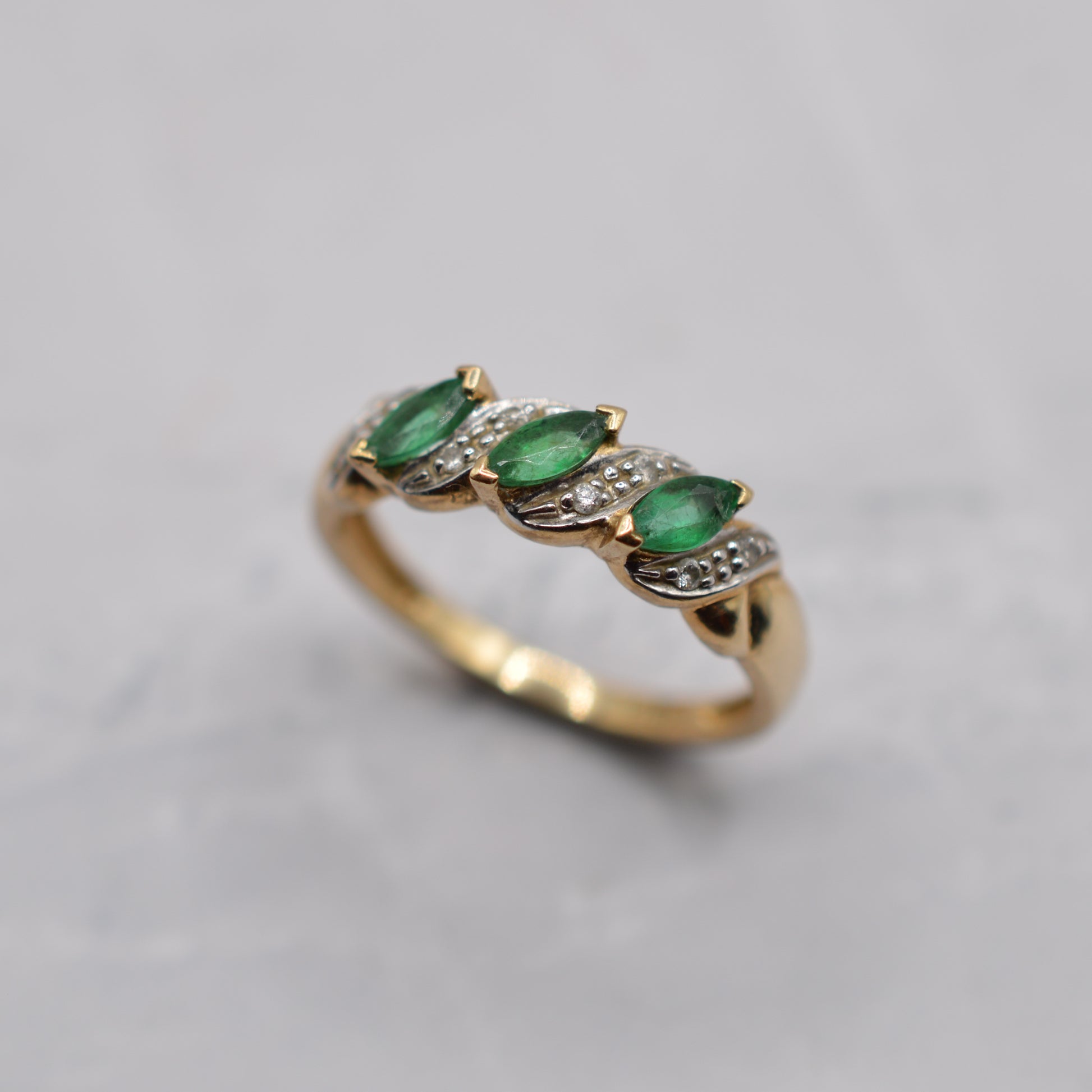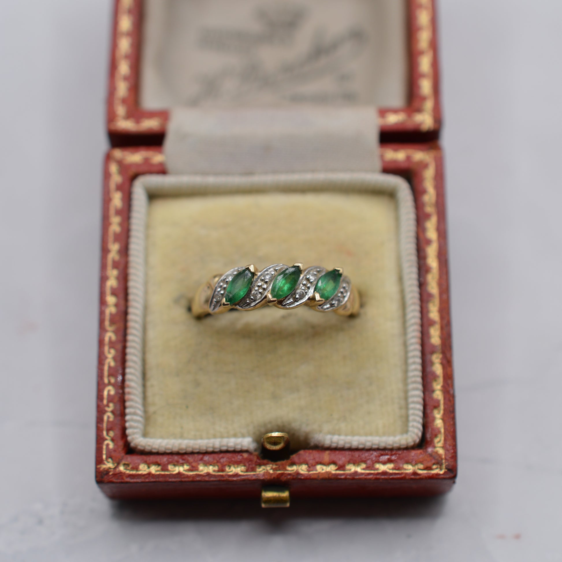 A rather sweet 9ct gold emerald & diamond half-eternity ring! This lovely piece features three marquise-cut emeralds in a gorgeous and rich shade of green, accented by tiny sparkling diamond chips for an added sparkle. The emeralds have typical natural inclusions but have beautiful colour and are well-matched and bright.