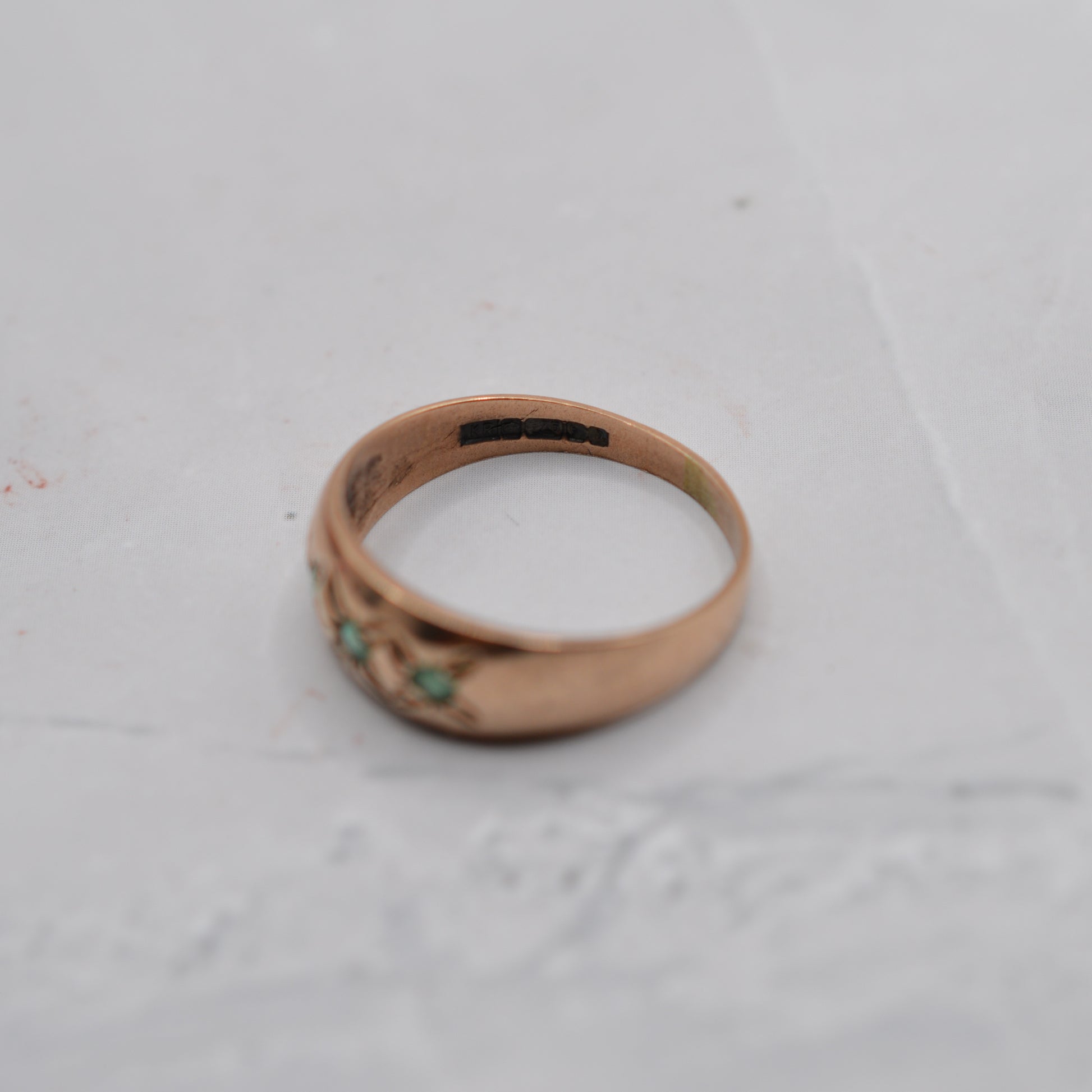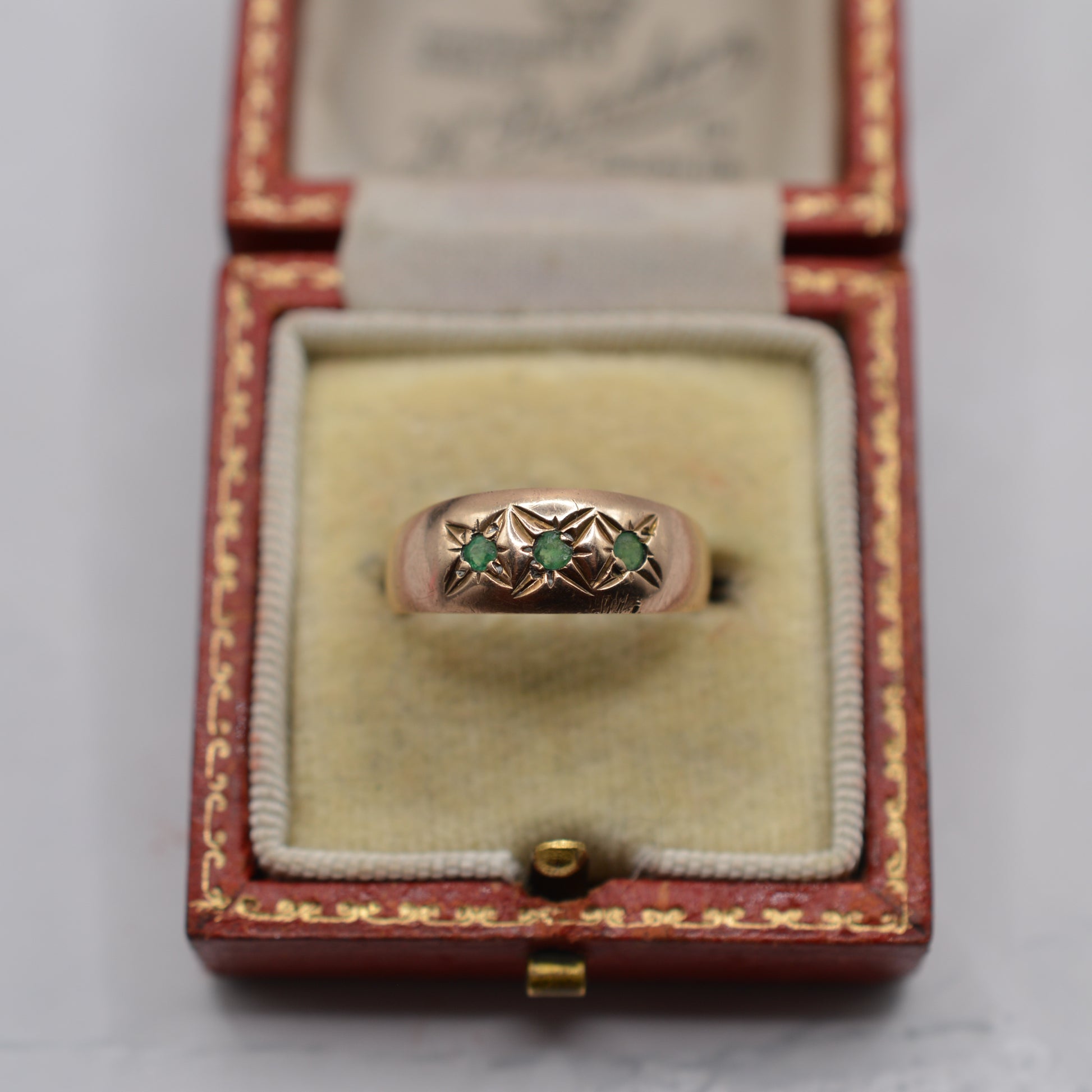 A rather pretty 1990s 9ct gold emerald gypsy ring! This delightful piece features three round emeralds star-set into a chunky yellow gold band, with the emeralds each measuring approx. 1.5mm in diameter and adding a dash of gorgeous green sparkle. Gypsy rings are always popular, but emeralds are less commonly seen in this style -- making this ring a particularly charming and unusual piece for you to treasure!
