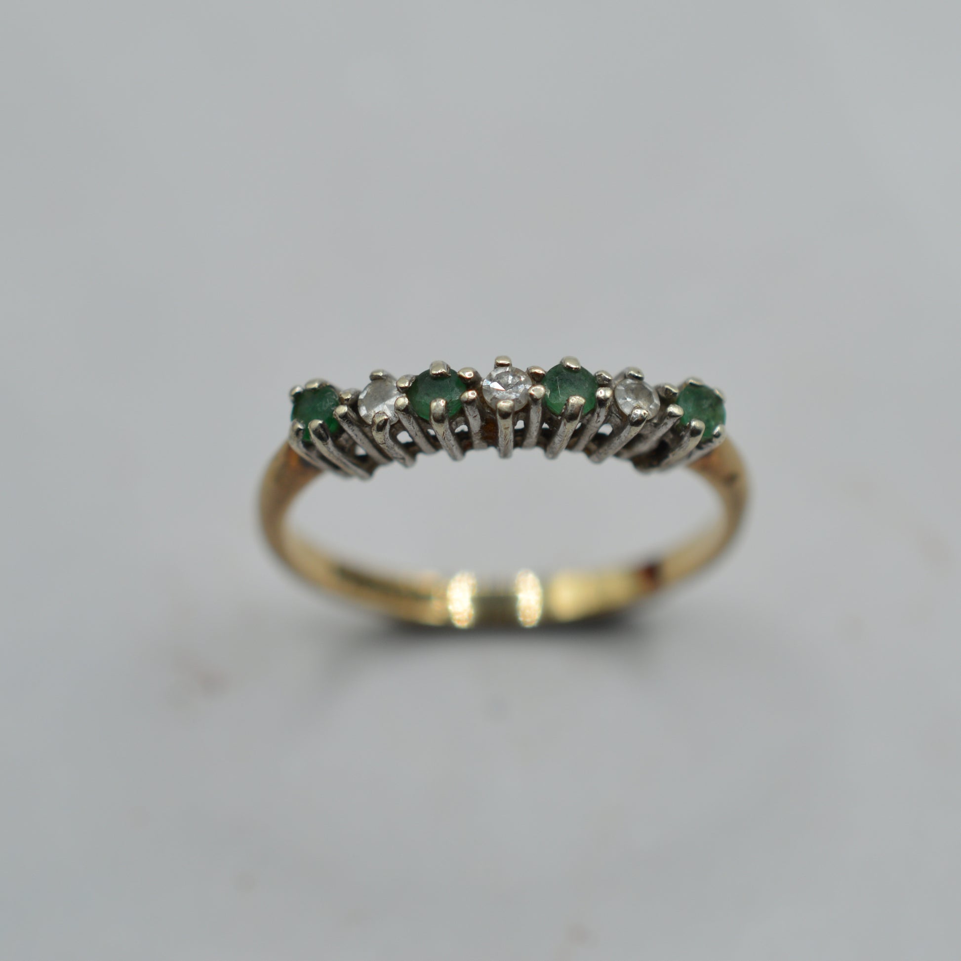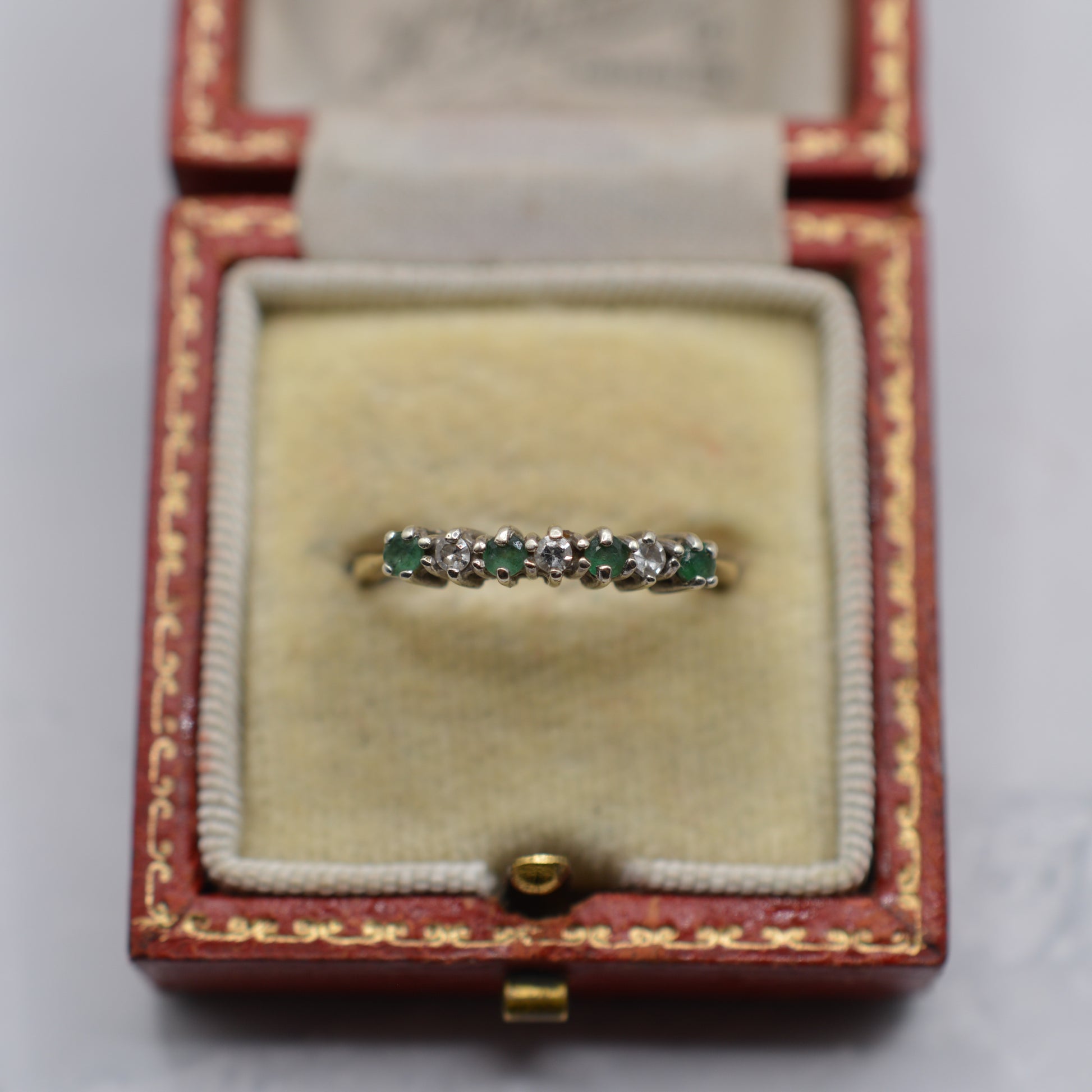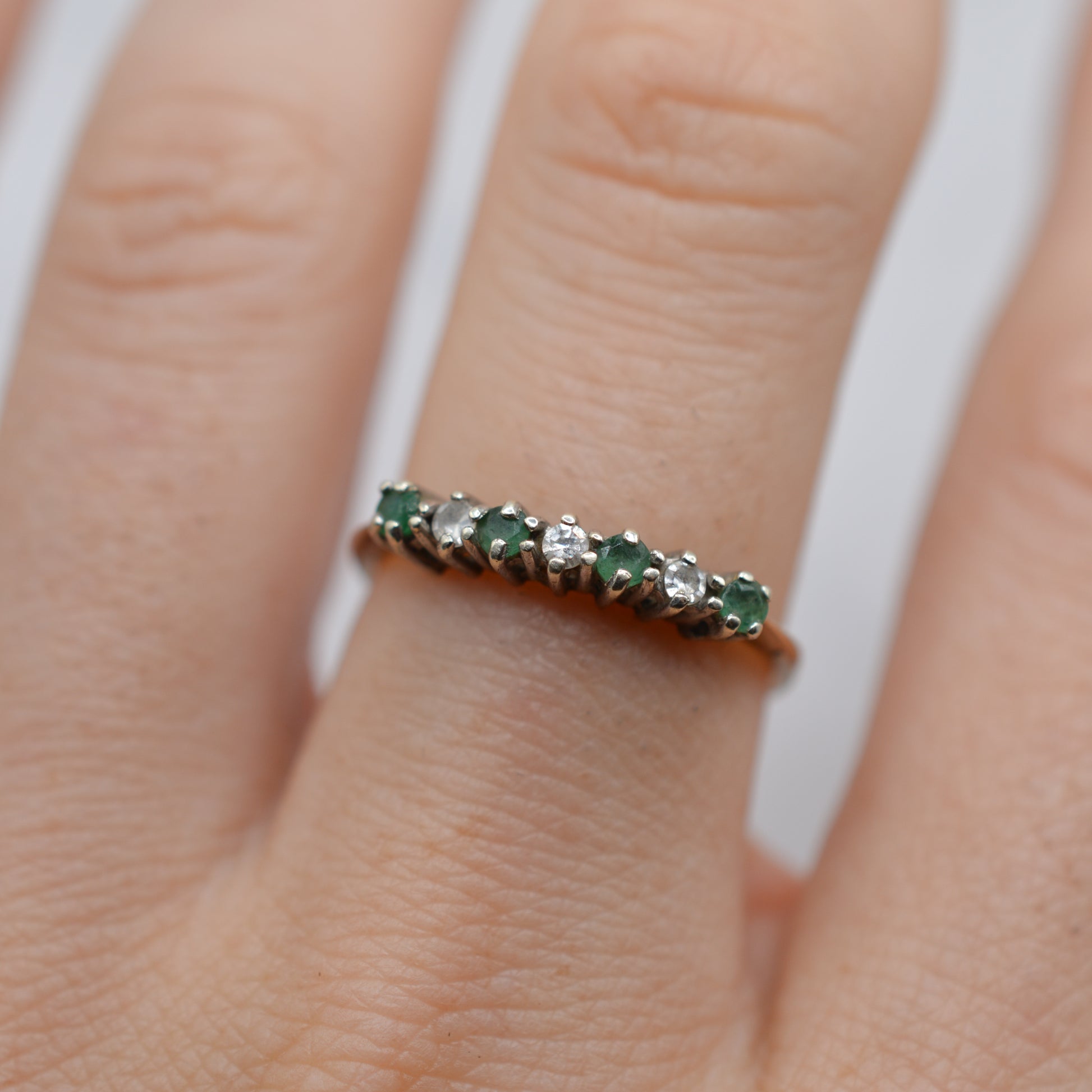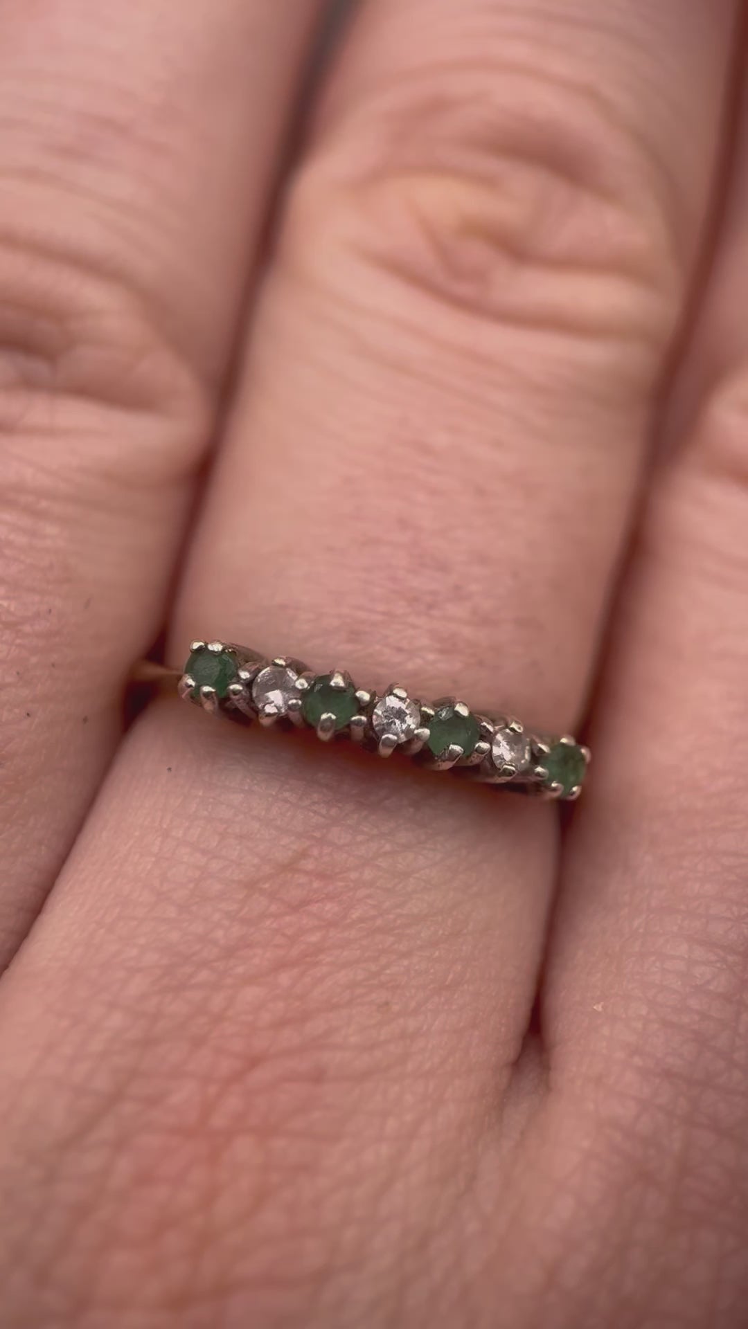 A beautiful 1980s vintage 9ct gold half-eternity ring! This elegant piece features a sparkling sequence of seven gemstones, alternating between vibrant green emeralds and brilliant diamonds. Perfect as a minimalist standalone piece or as a glamorous addition to a stacking set.