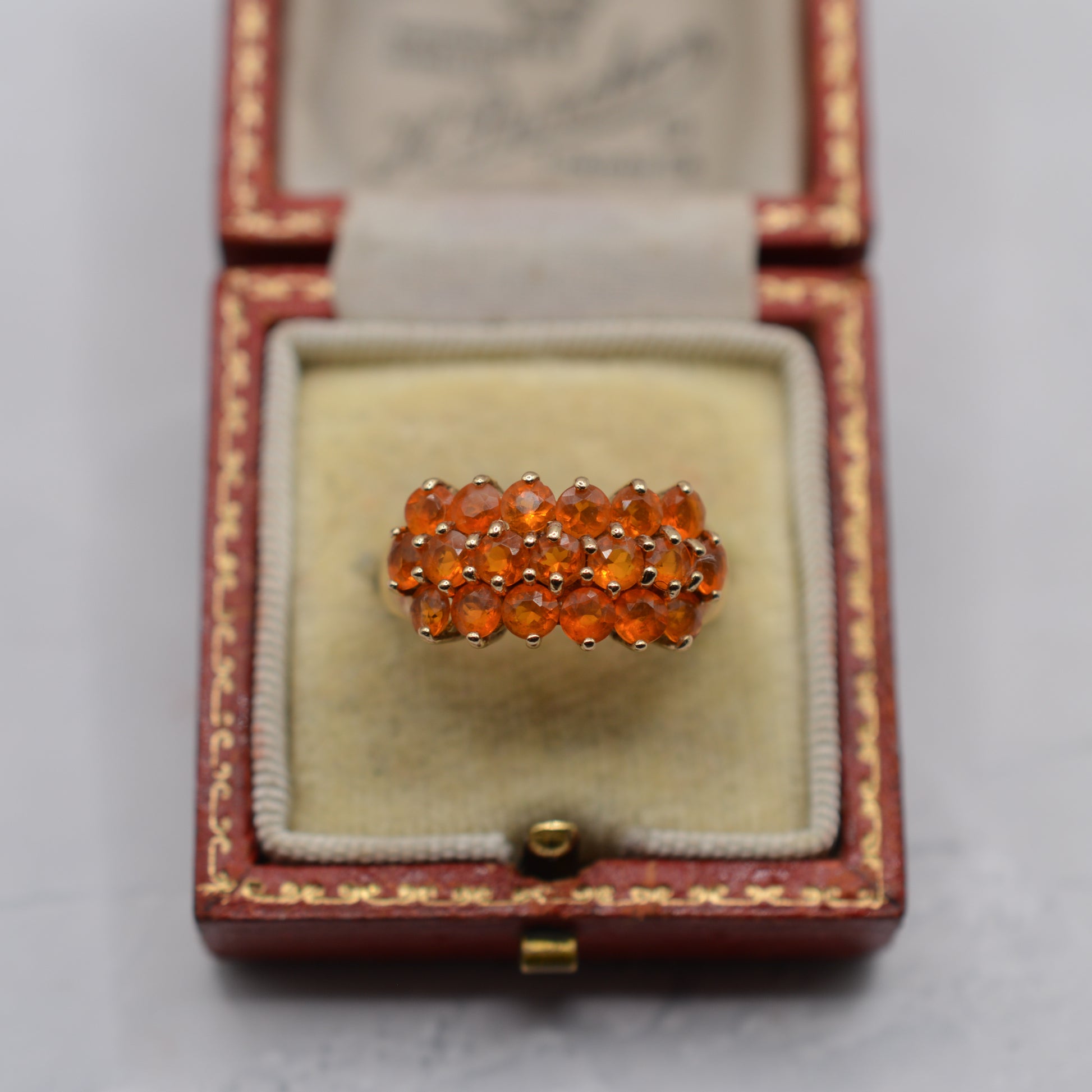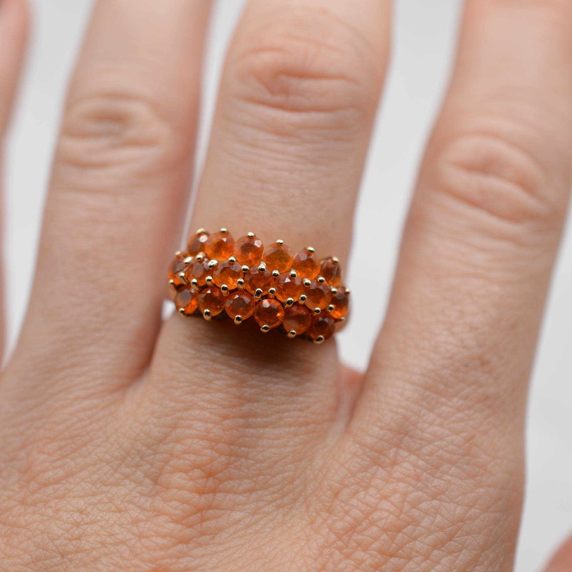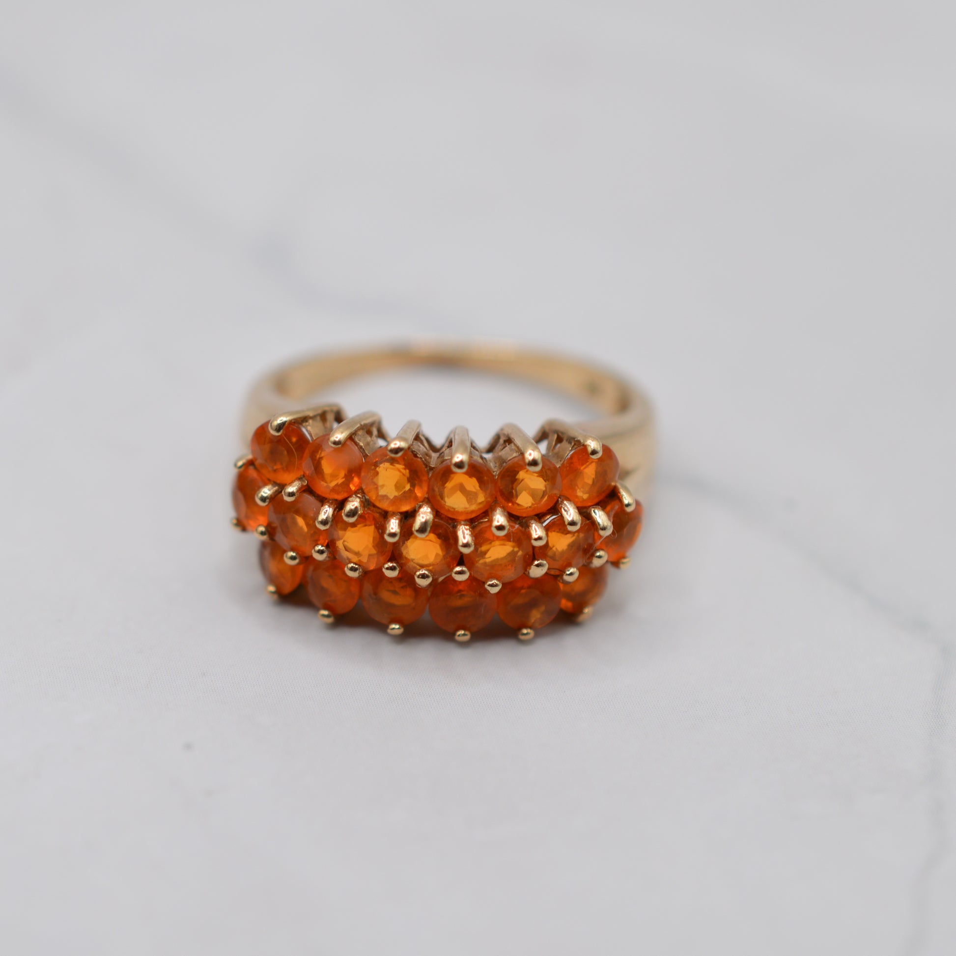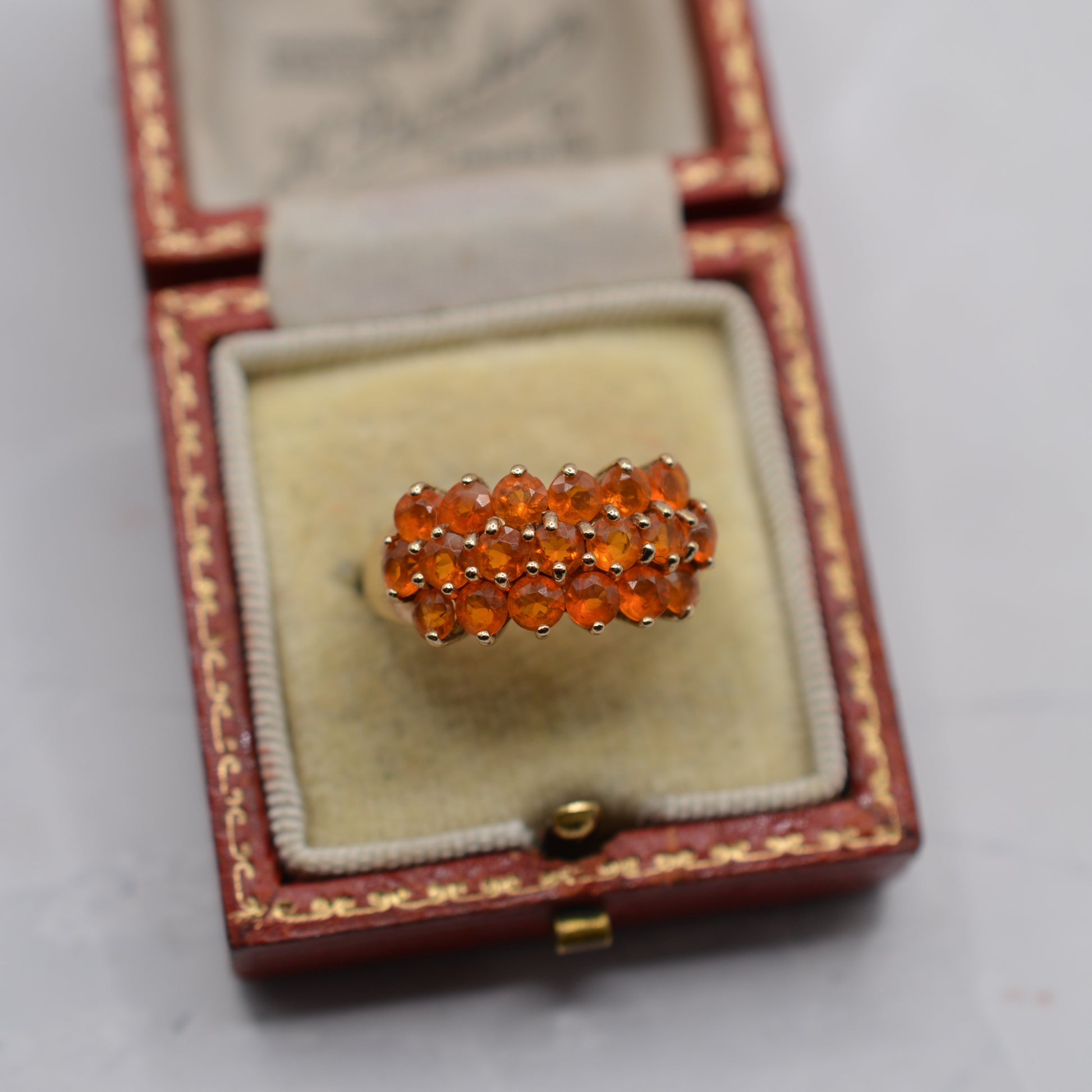 Such a gorgeous and chunky 9ct gold fire opal cluster ring! This stunning Y2K piece features three rows of round fire opals in rich burnt-orange tones, arranged in a substantial cluster measuring approx. 20mm x 9mm. A truly fabulous and luxurious statement ring that gives a burst of colour to any outfit.