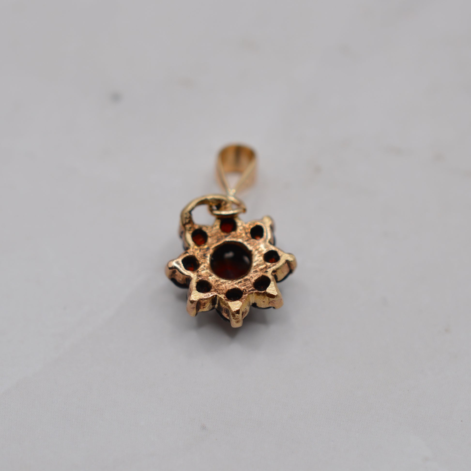 A rather sweet vintage 9ct gold garnet cluster, newly renovated into a pendant/charm! Originally a 1970s cluster ring with a damaged band, the piece has been lovingly repurposed by my jeweller mother into a fresh little pendant with a gold bale attached. The design features a central garnet surrounded by smaller round garnets in a rich, dark shade of red, forming a pretty flowerhead cluster approx. 10mm across (excluding the bale). It can be worn as a dainty pendant on a chain or adapted with a jump ring for use as a charm on a bracelet. A lovely way to give new life to a vintage treasure.