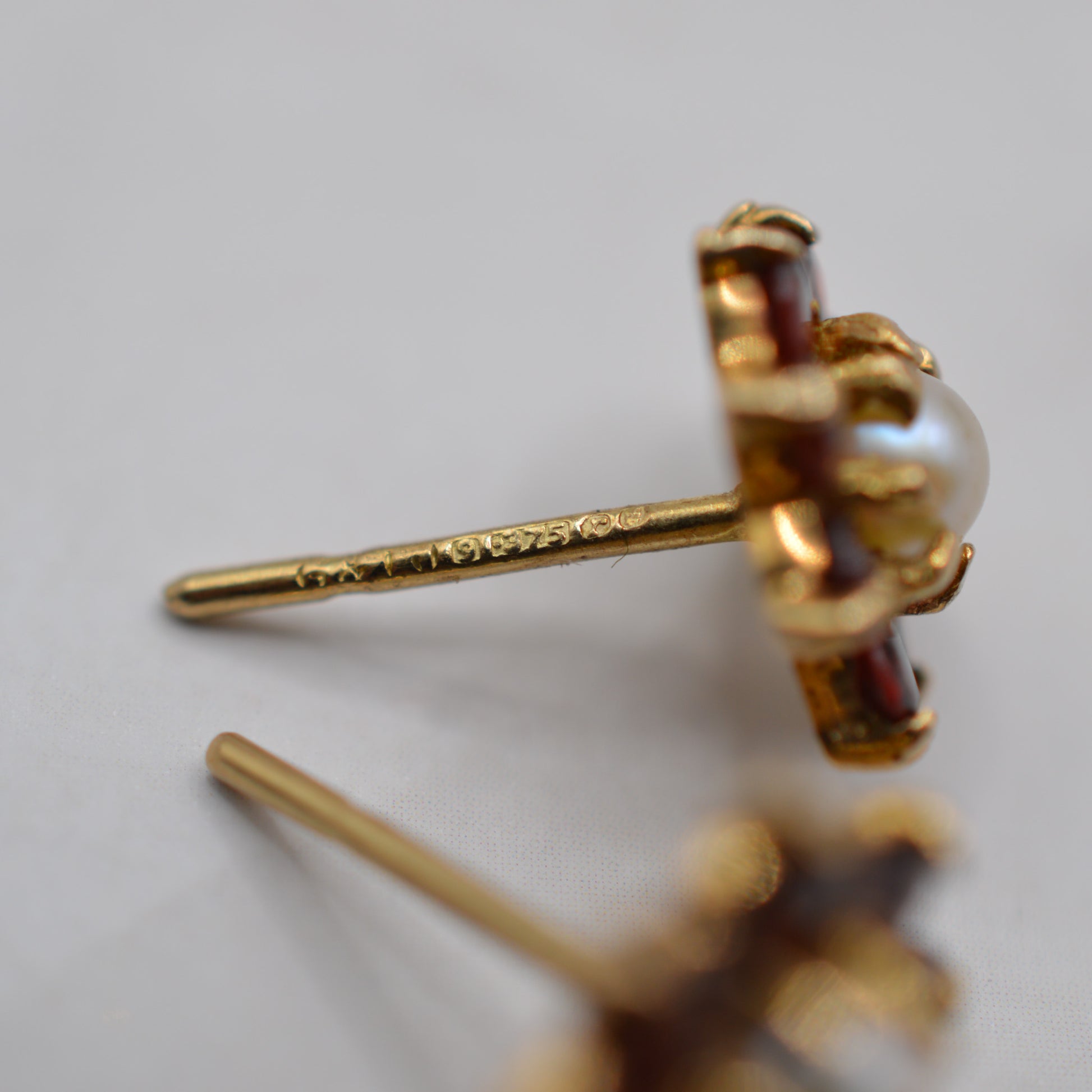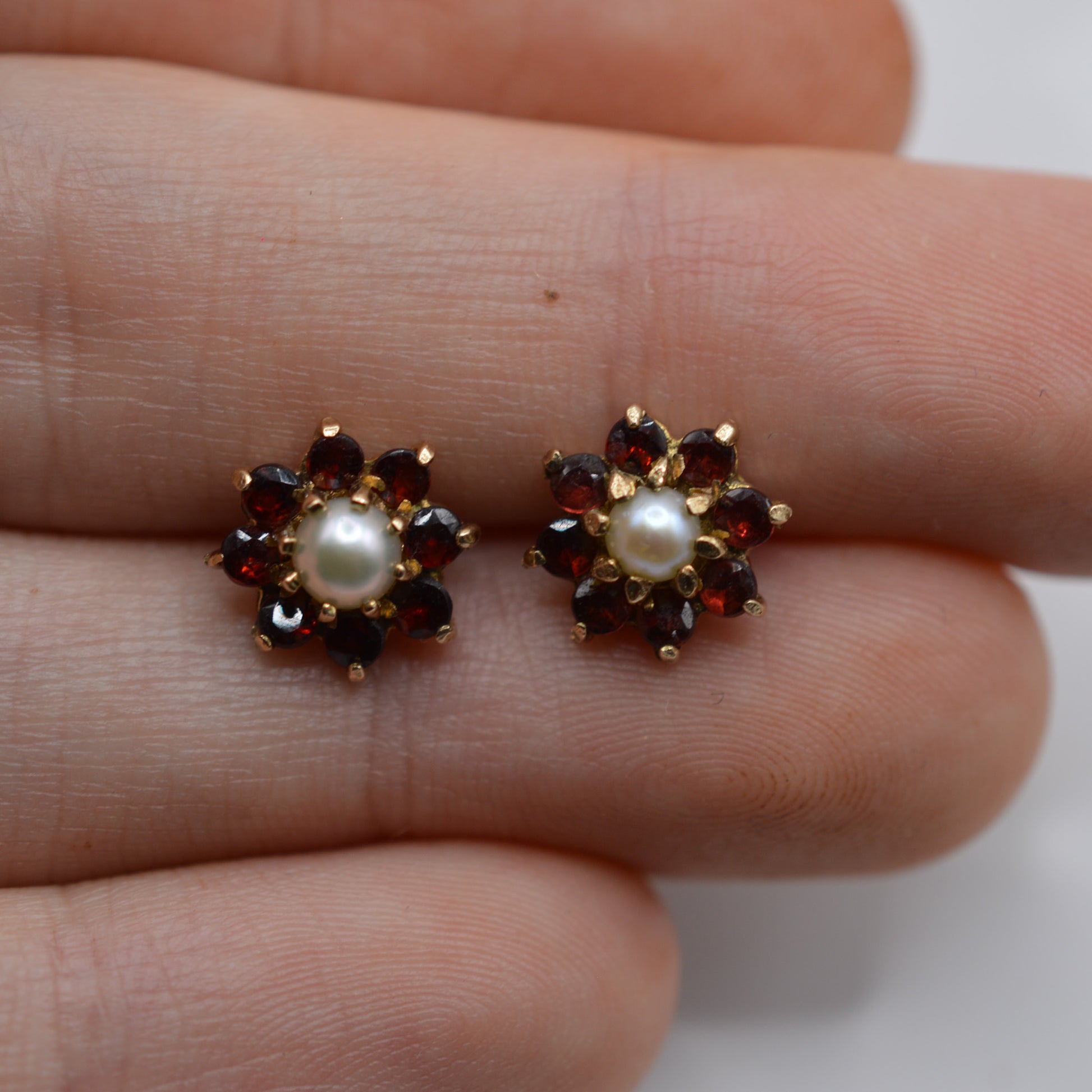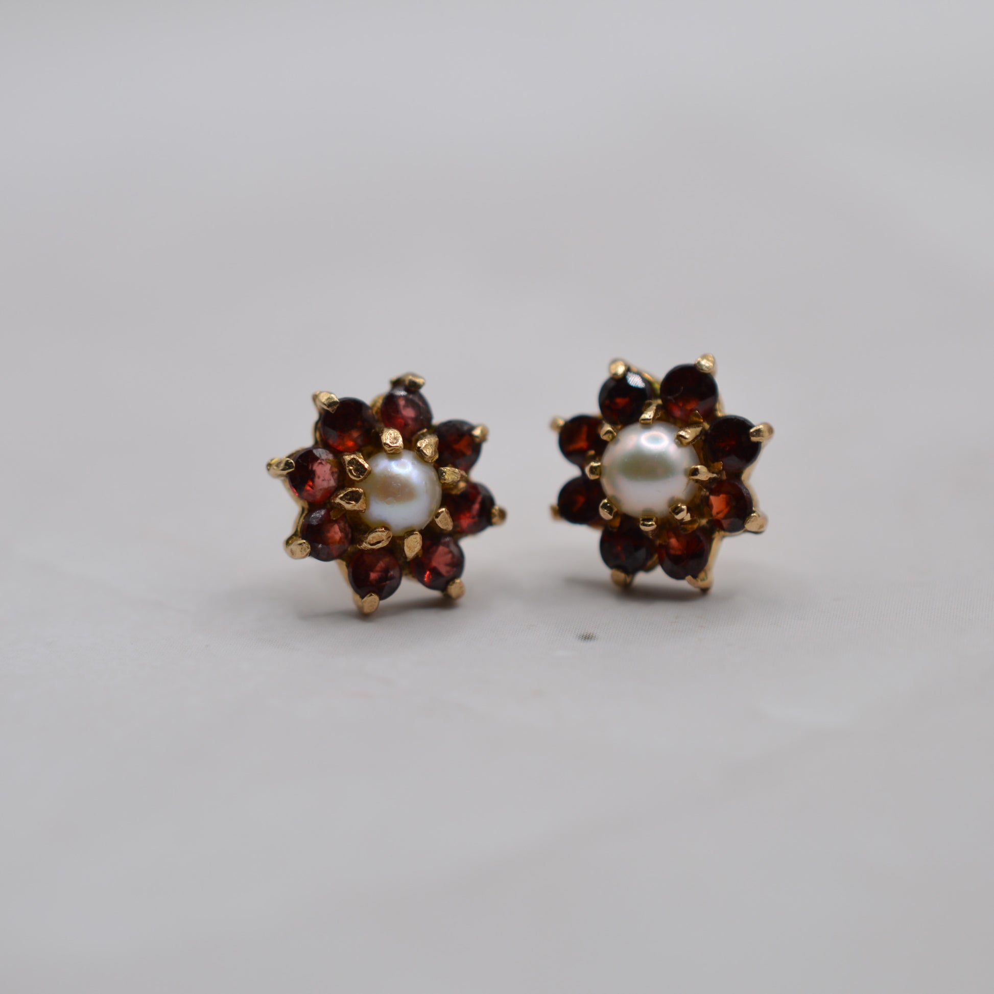1970s Vintage 9ct Gold Pearl & Garnet Cluster Stud Earrings