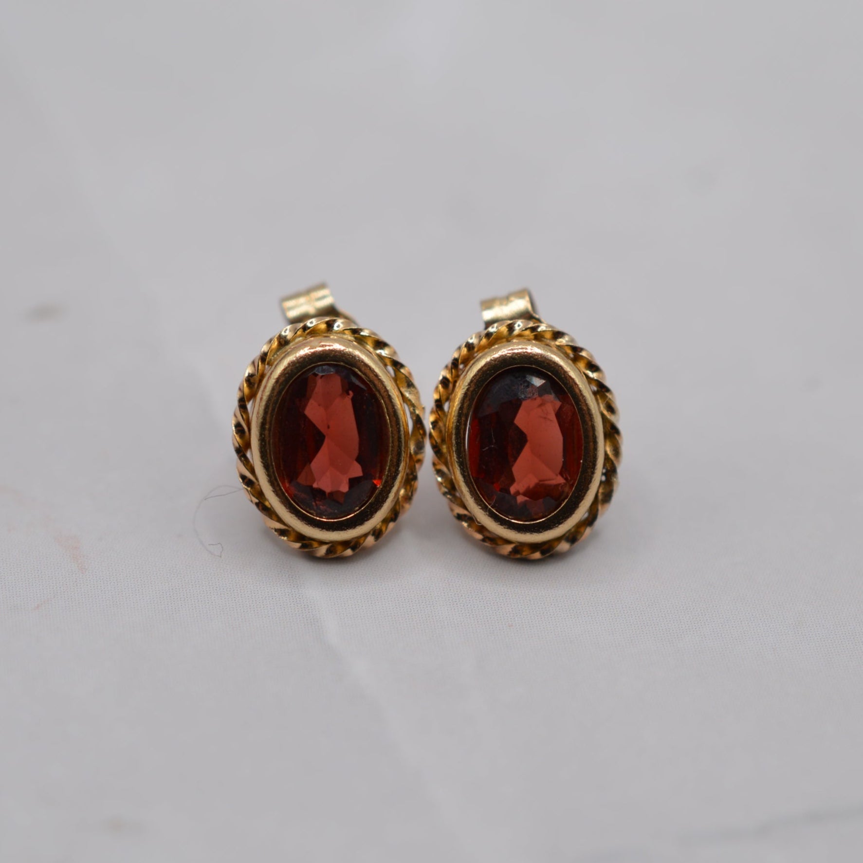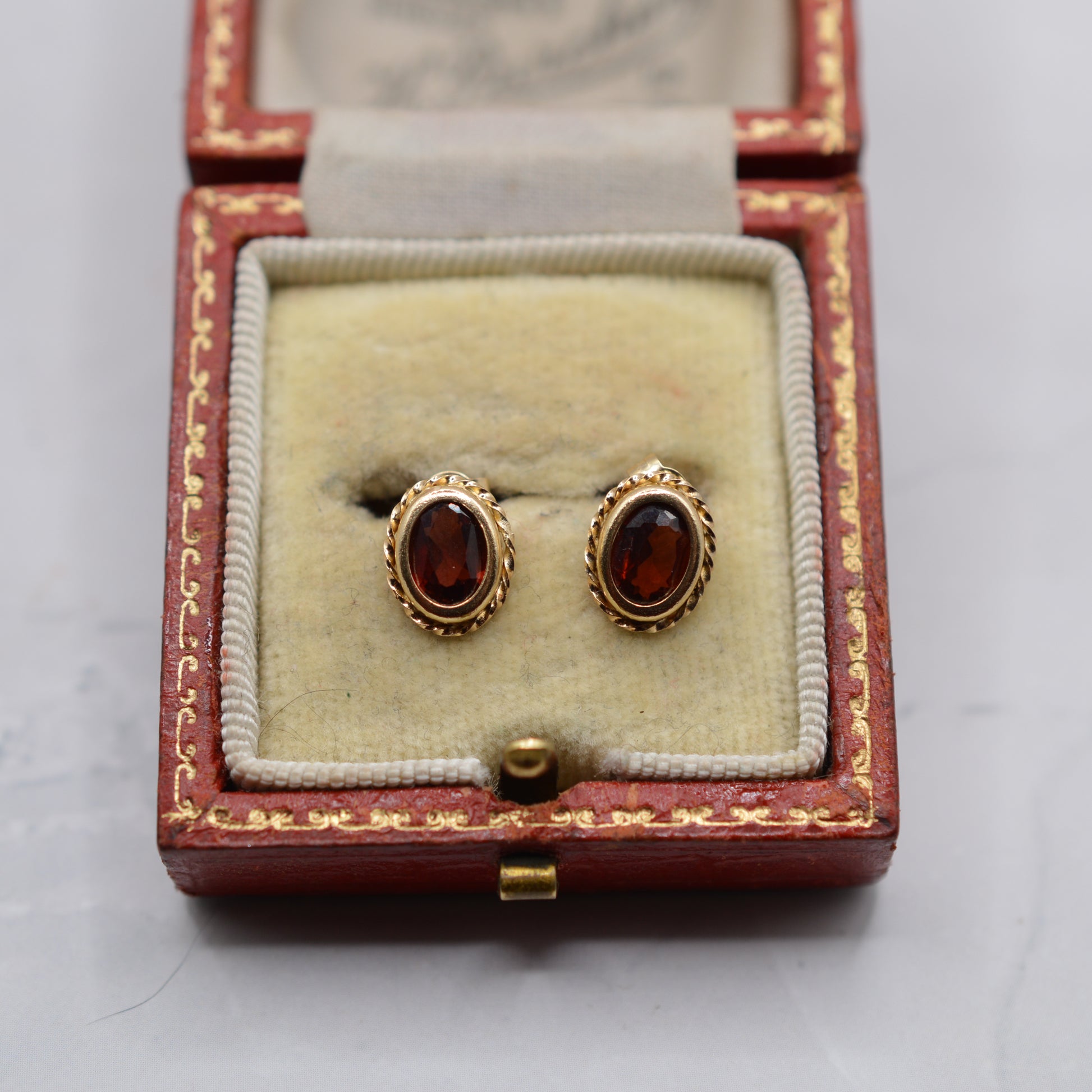A sweet little pair of 9ct gold garnet studs! Each earring features an oval-cut garnet in a fiery, glowing shade of red, bezel-set and framed by a pretty rope-twist border. A dainty pair that are gorgeous for everyday wear or make a lovely romantic gift.