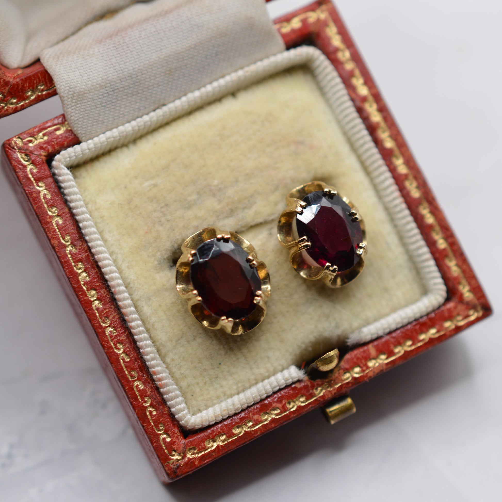 A gorgeous pair of 9ct gold garnet stud earrings from the 1990s. Each earring is set with an oval-cut garnet in a rich crimson red (likely rhodolite garnet), claw-set in a classic buttercup-style mount inspired by Victorian designs.