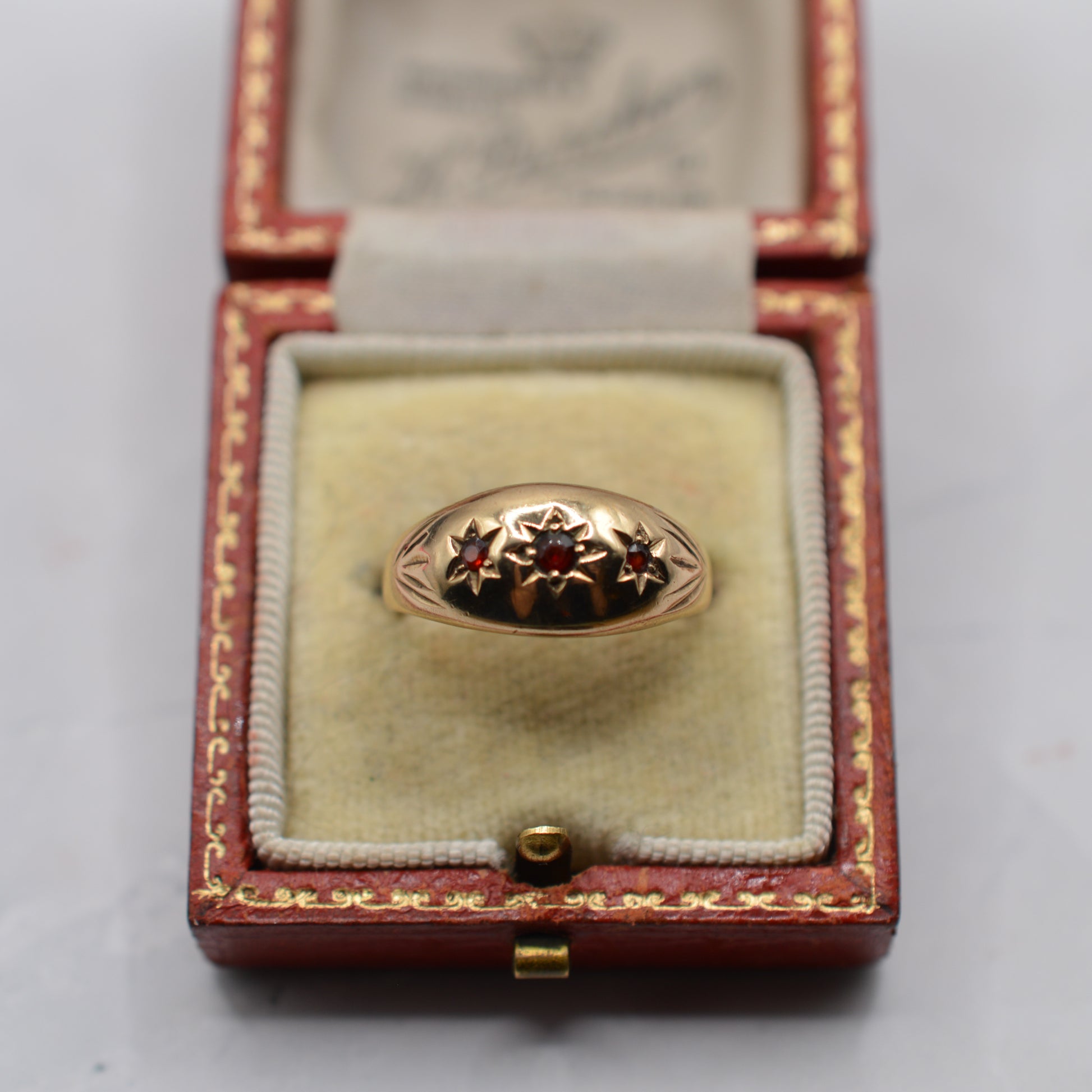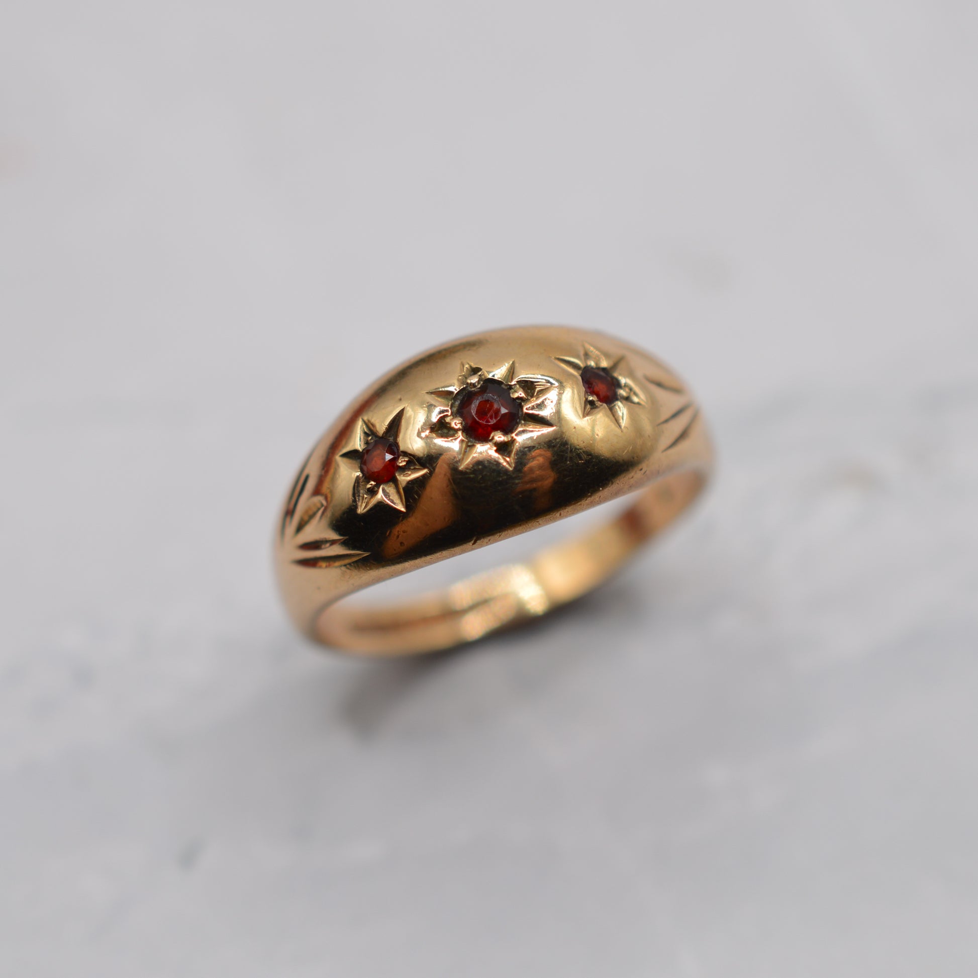 A rather delicious and chunky vintage 9ct gold garnet gypsy ring! Dated to 1967, this gorgeous treasure features three deep-red round garnets, star-set into a smooth, domed yellow gold band. It's a substantial piece measuring approx. 8mm at its widest point and crafted in rich buttery yellow gold. A classic and ever-popular design that gets grabbed quickly - don't miss out!