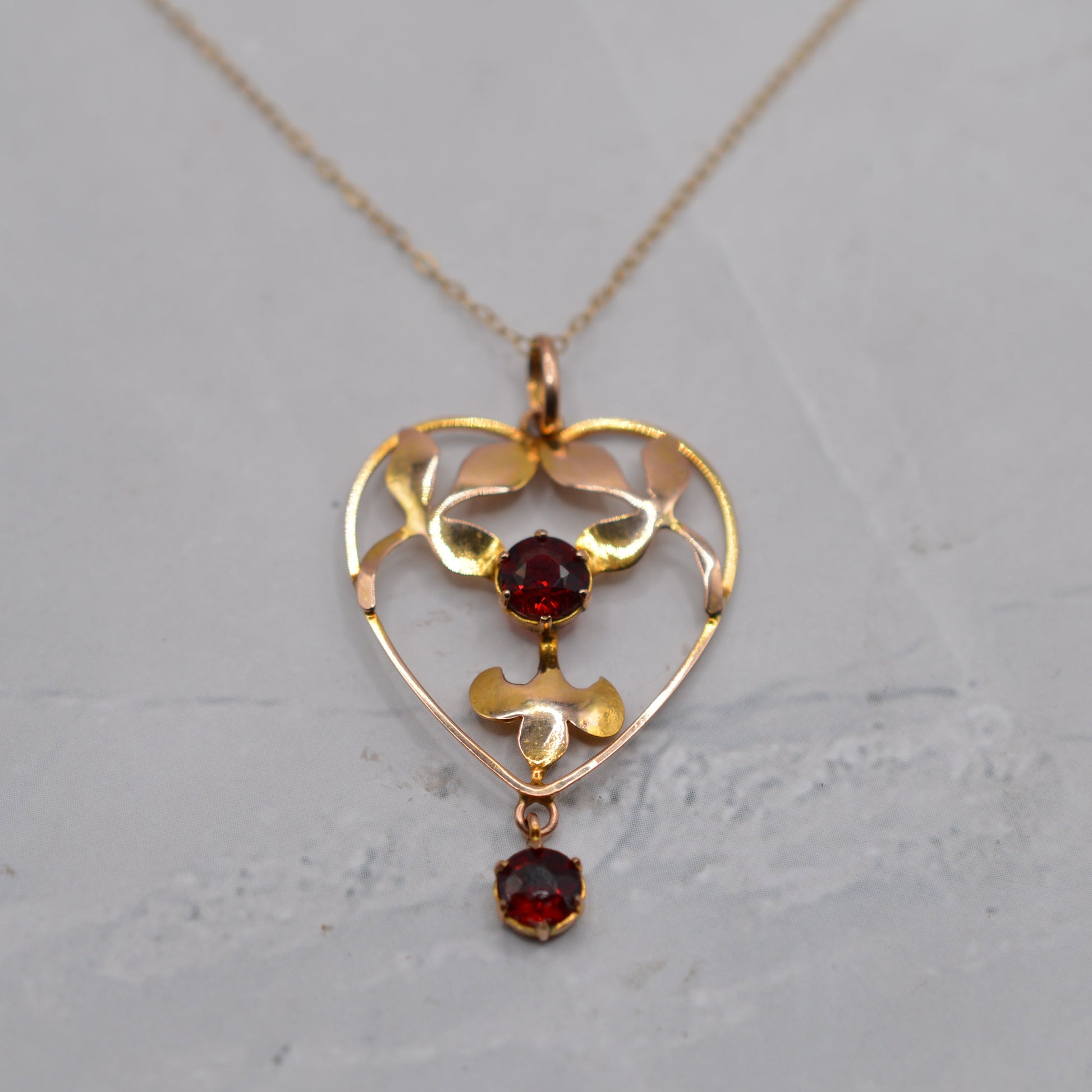 An adorable antique 9ct gold garnet heart pendant necklace. Dating to the Art Nouveau period, this lovely lavalier pendant necklace is formed as an openwork heart, beautifully decorated with foliate-inspired detailing and set with both a rich red garnet at the centre and a further garnet suspended below. The pendant is a lovely eye-catching size (approx. 37mm x 24mm) and is suspended from a 16" fine trace-link chain.