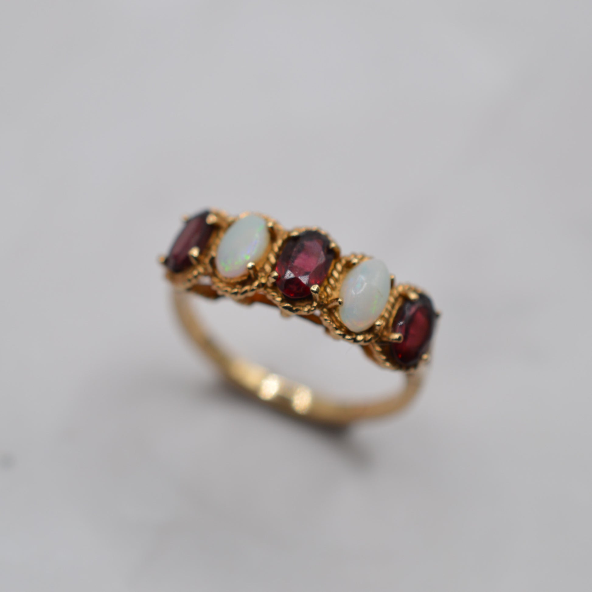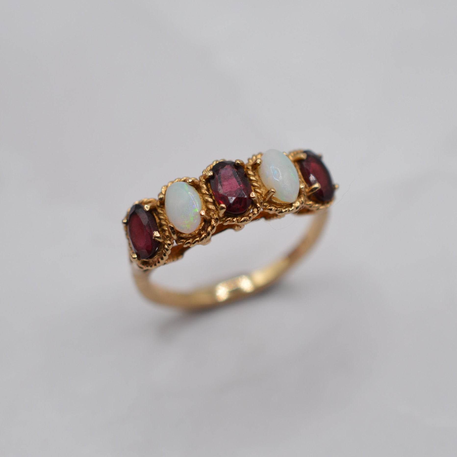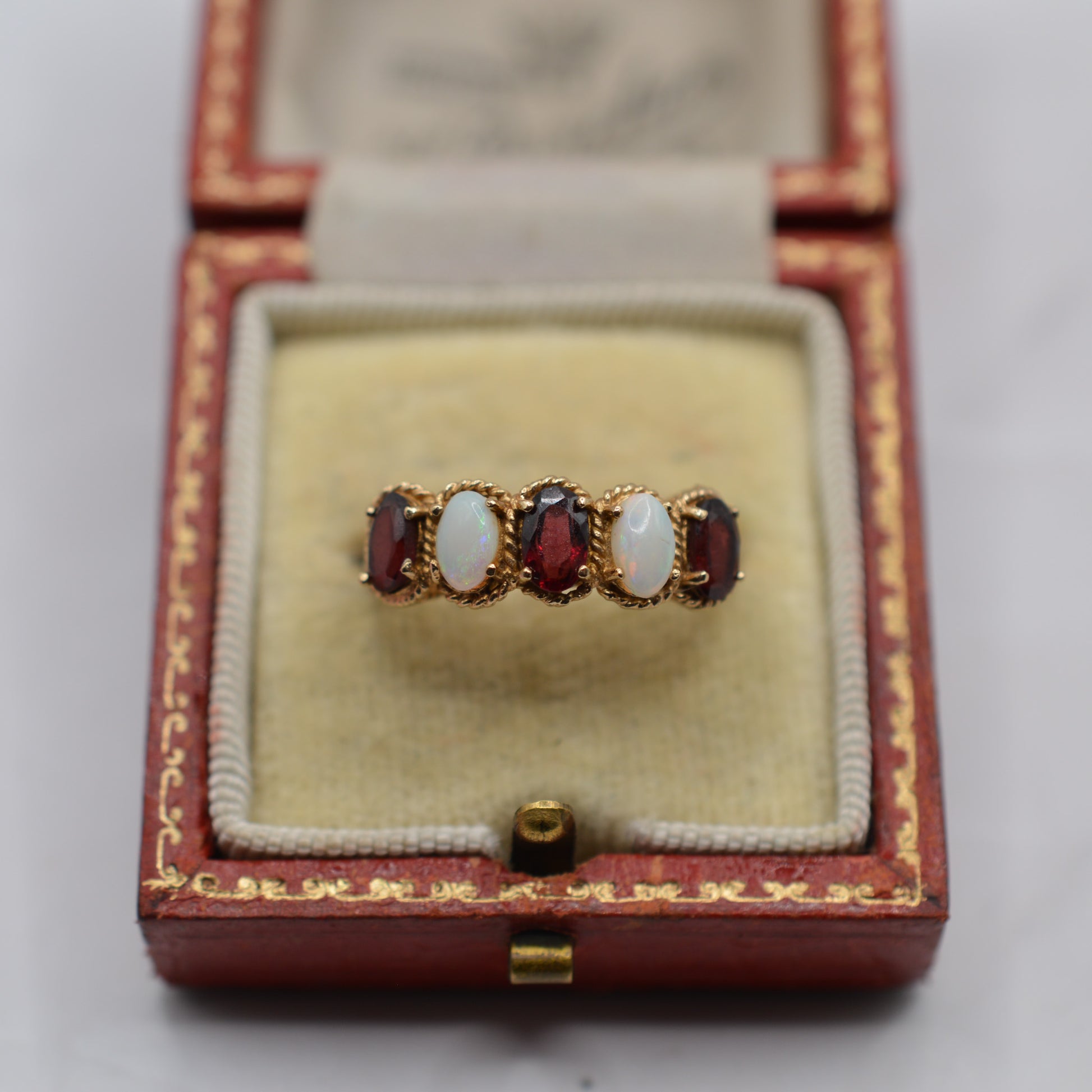 An utterly beautiful 1970s 9ct gold opal and garnet five-stone ring! This lovely vintage treasure features a stunning arrangement of alternating oval-shaped opals and garnets. The opals offer a delightful colour play with flecks of greens and blues, while the garnets provide a warm, red sparkle. Each gemstone measures approx. 5mm x 3mm and is framed by a lovely rope-twist border that adds an extra touch of luxury. A fabulous and unique ring!