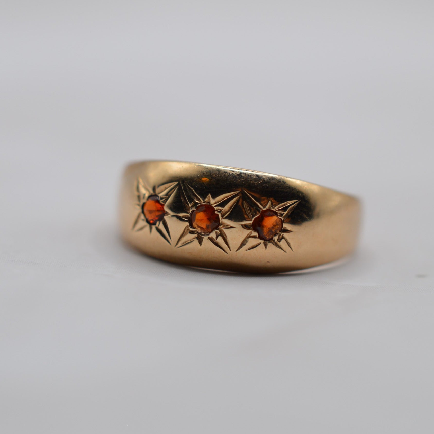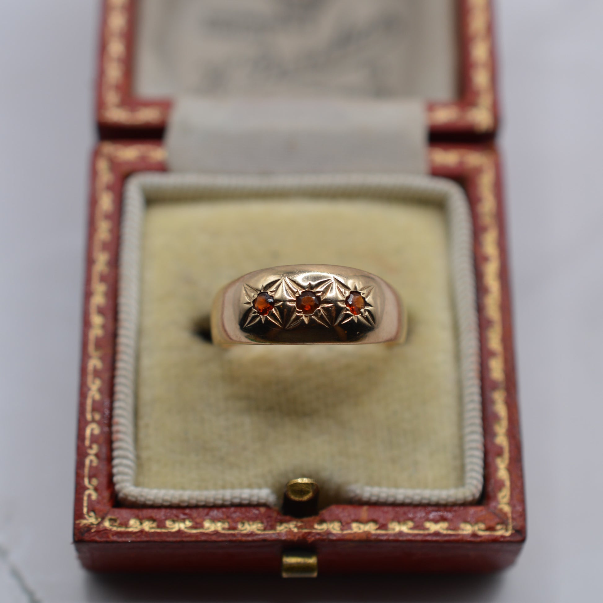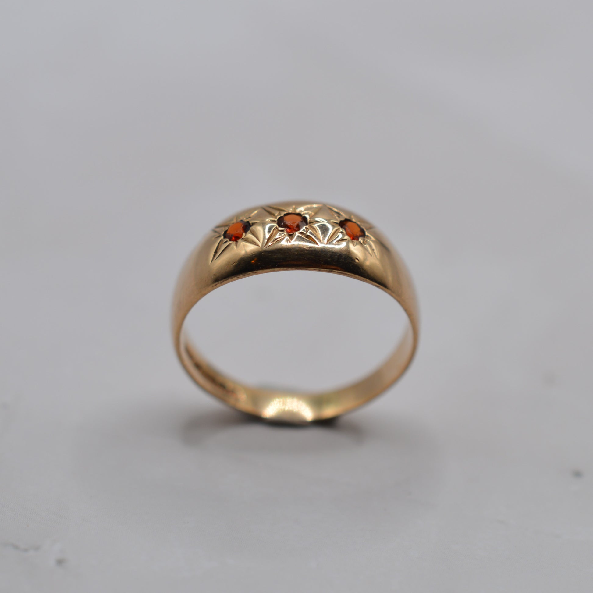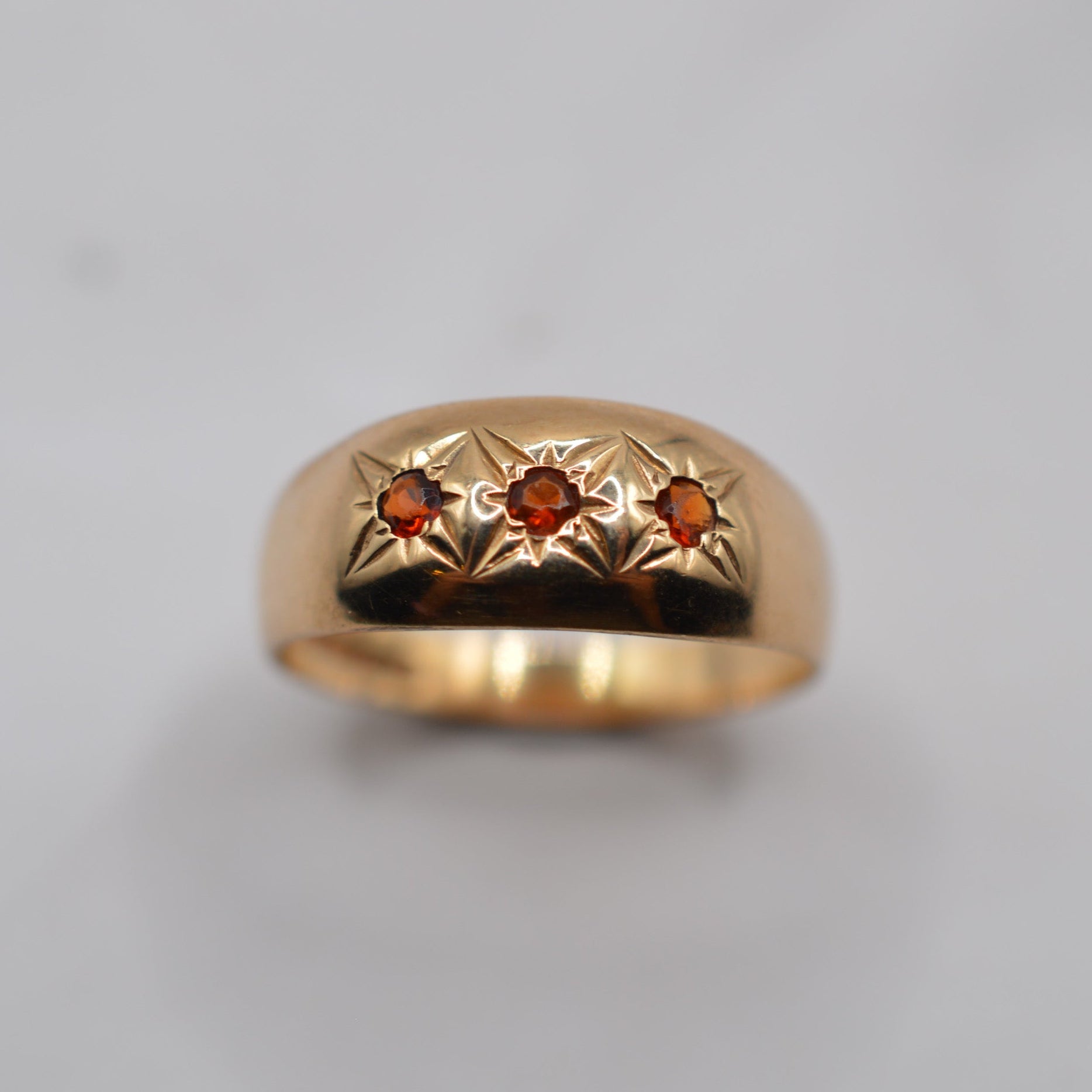 A rather lovely vintage 9ct gold garnet gypsy ring. This gorgeous chunky 1970s piece features three small deep-red garnets star-set into a high-dome yellow gold band. The band is chunky, polished, and smooth, making it feel luxurious and substantial. A classic gypsy-style trilogy ring that’s perfect worn alone or stacked with your favourites. Such a popular and wearable vintage style!