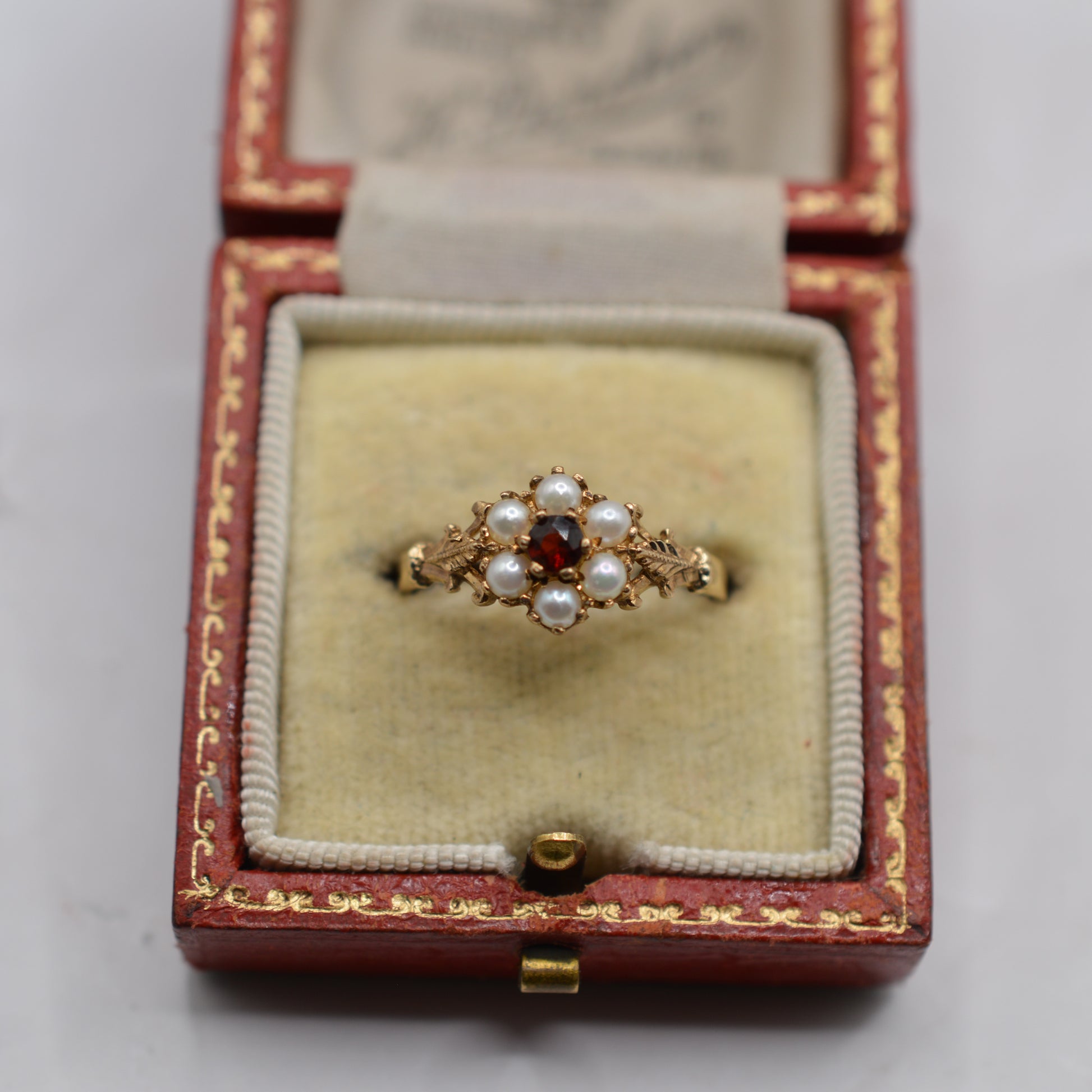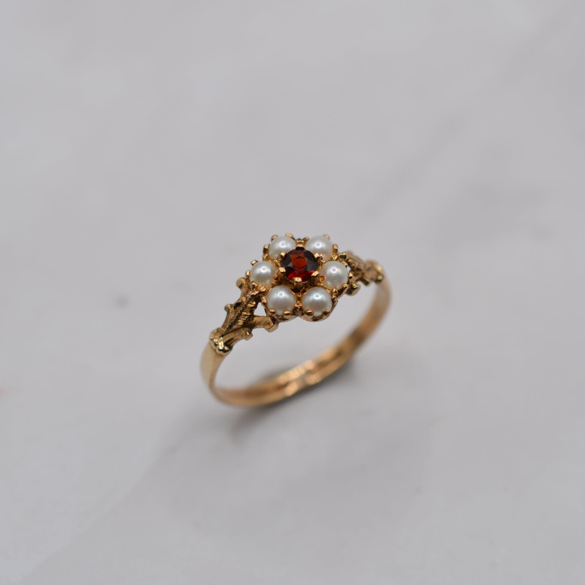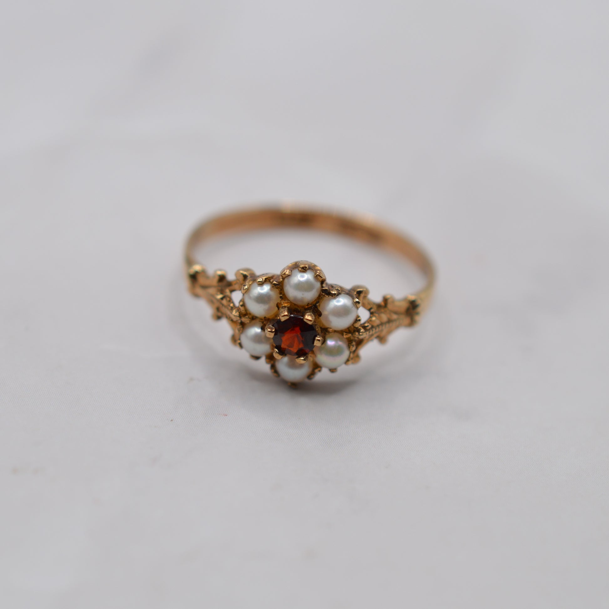 Such an adoooorable little 9ct gold pearl & garnet floral cluster ring! This charming 1990s piece features a central round garnet in a fiery shade of red, surrounded by six lustrous white pearls to form a daisy-style flower. The shoulders are enhanced with pretty carved leaf details, adding a whimsical, cottagecore vibe. The cluster measures approx. 9mm, making this a dainty yet adorable design -- perfect for everyday wear or as a sweet gift.