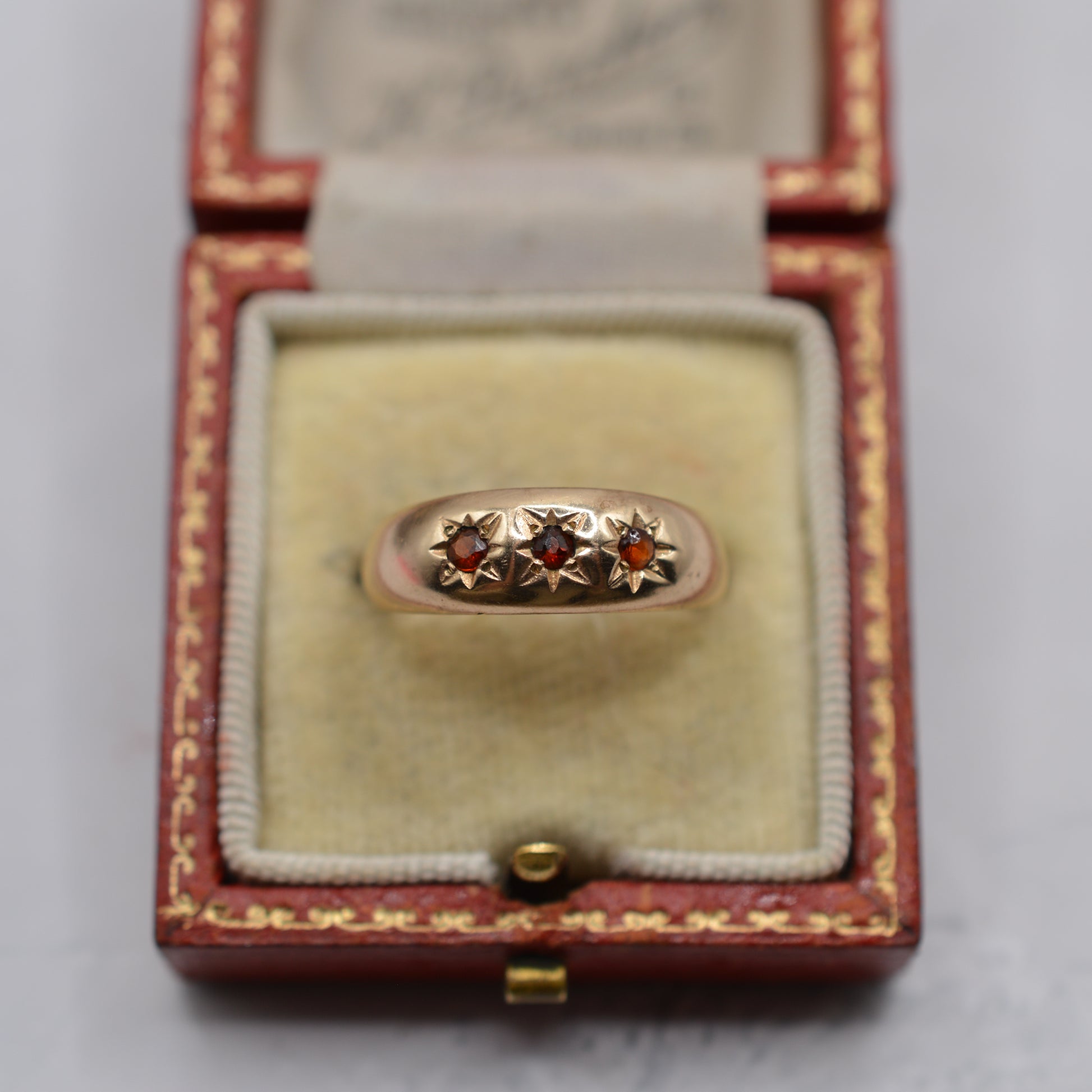 A rather gorgeous vintage 9ct gold garnet gypsy ring! This classic 1980s piece features three round garnets in a rich, glowing shade of red, star-set into a buttery yellow gold band. The band measures approx. 6mm at its widest point, giving it an eye-catching presence on the hand. These gypsy trilogy rings are always super popular and are perfect for stacking or wearing as a standout piece on their own.