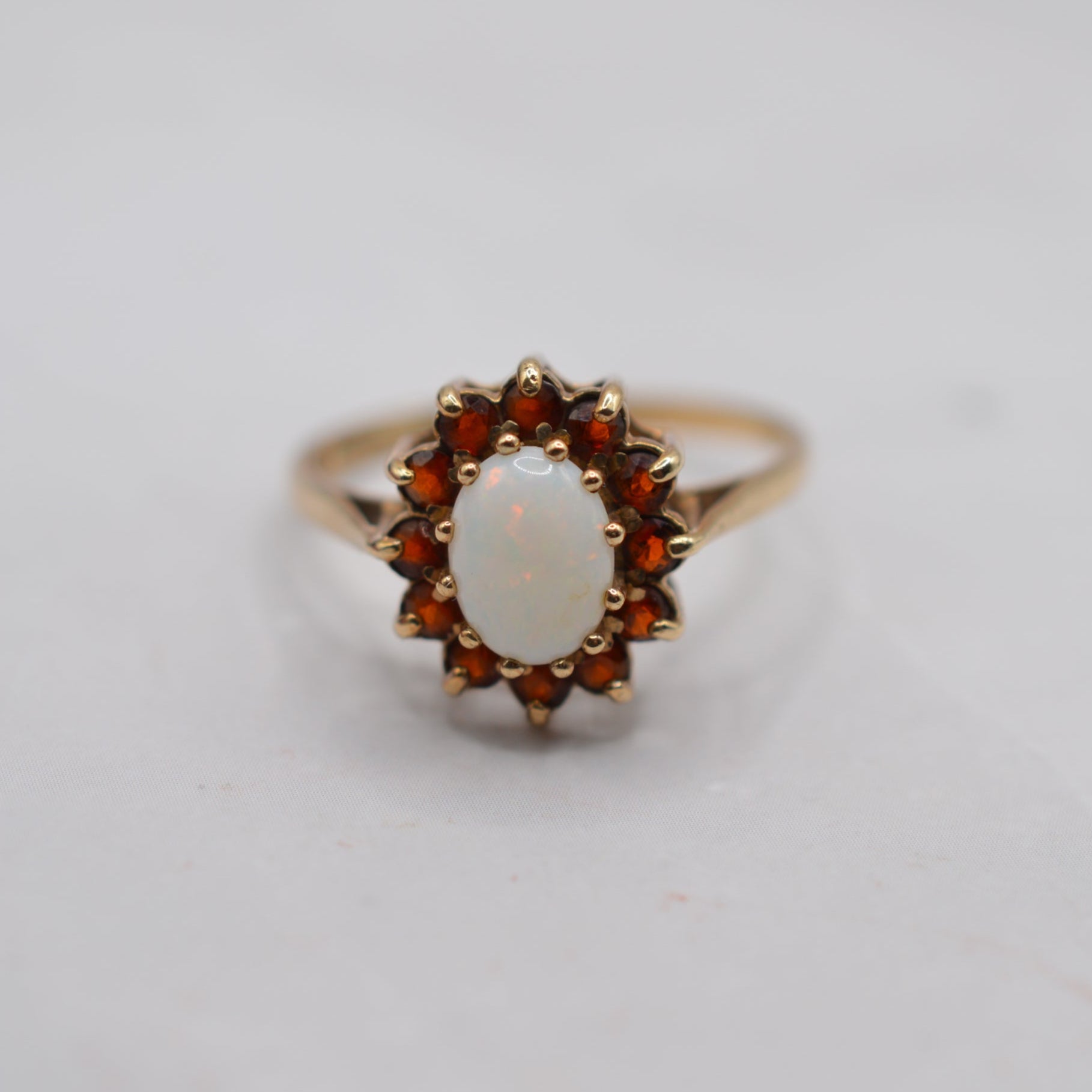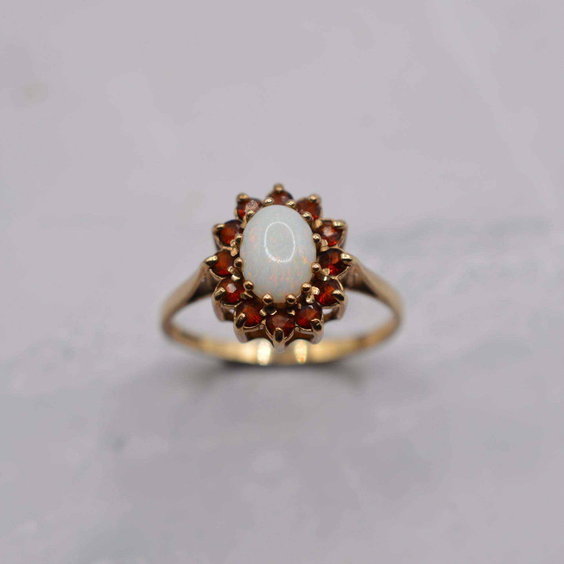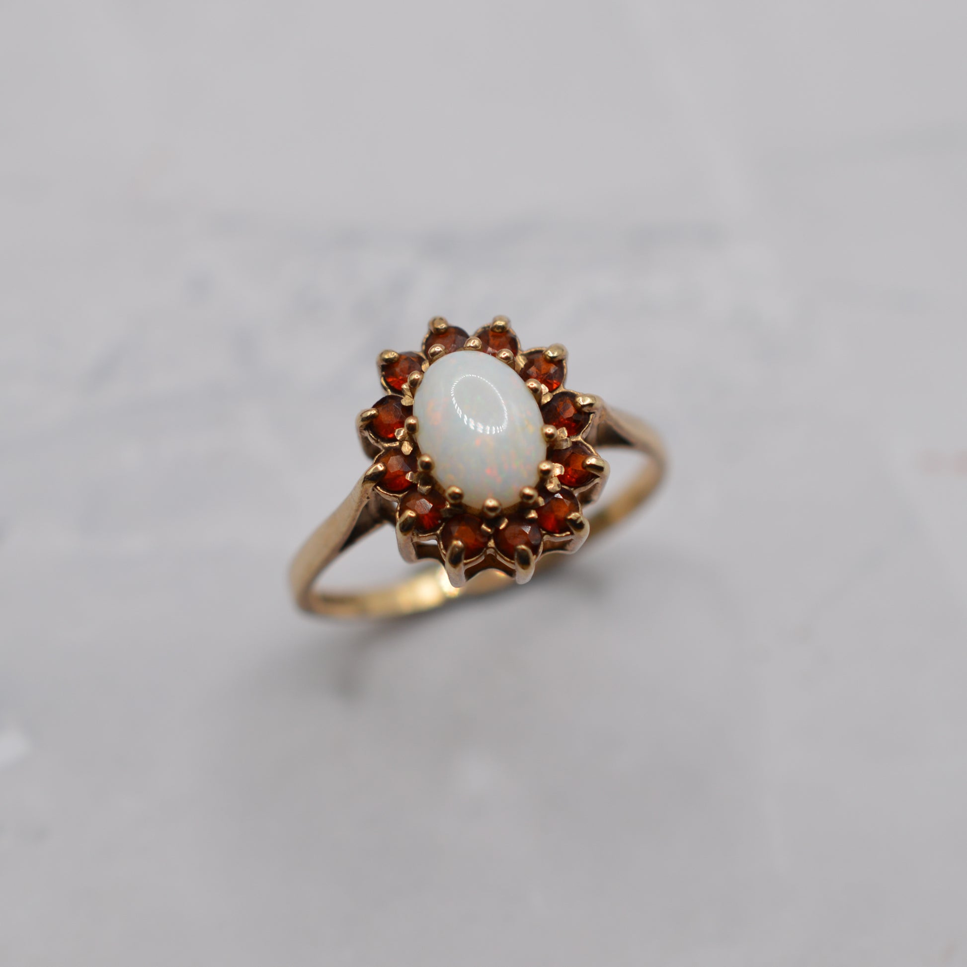 A delightful 9ct gold cluster ring from the 1980s. This lovely vintage piece features an oval-shaped opal at the centre, displaying subtle twinkles of pink, green, and blue. The opal is surrounded by a halo of round garnets in a rich, glowing shade of red, giving lovely contrast and warmth A sweet and elegant cluster ring for any occasion!