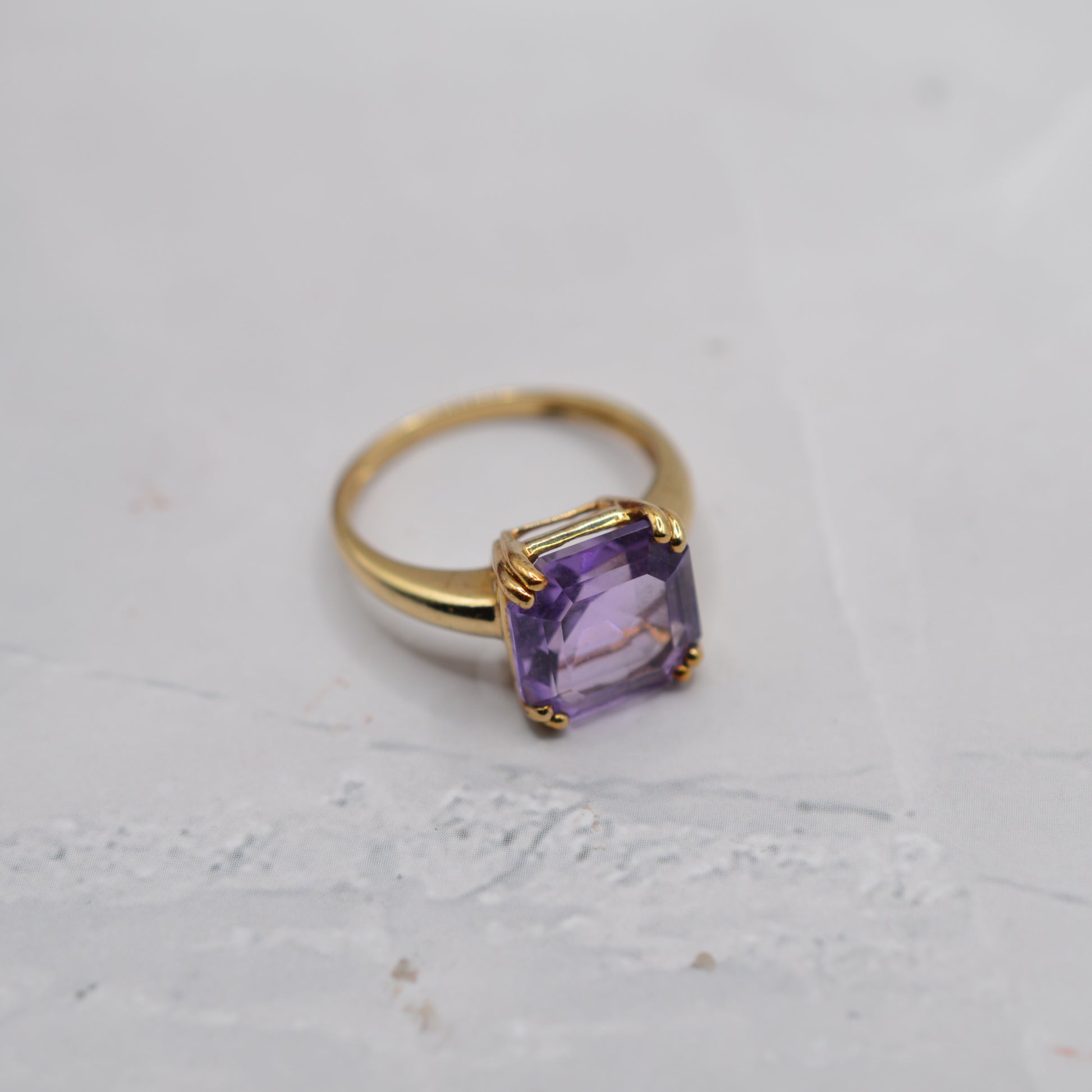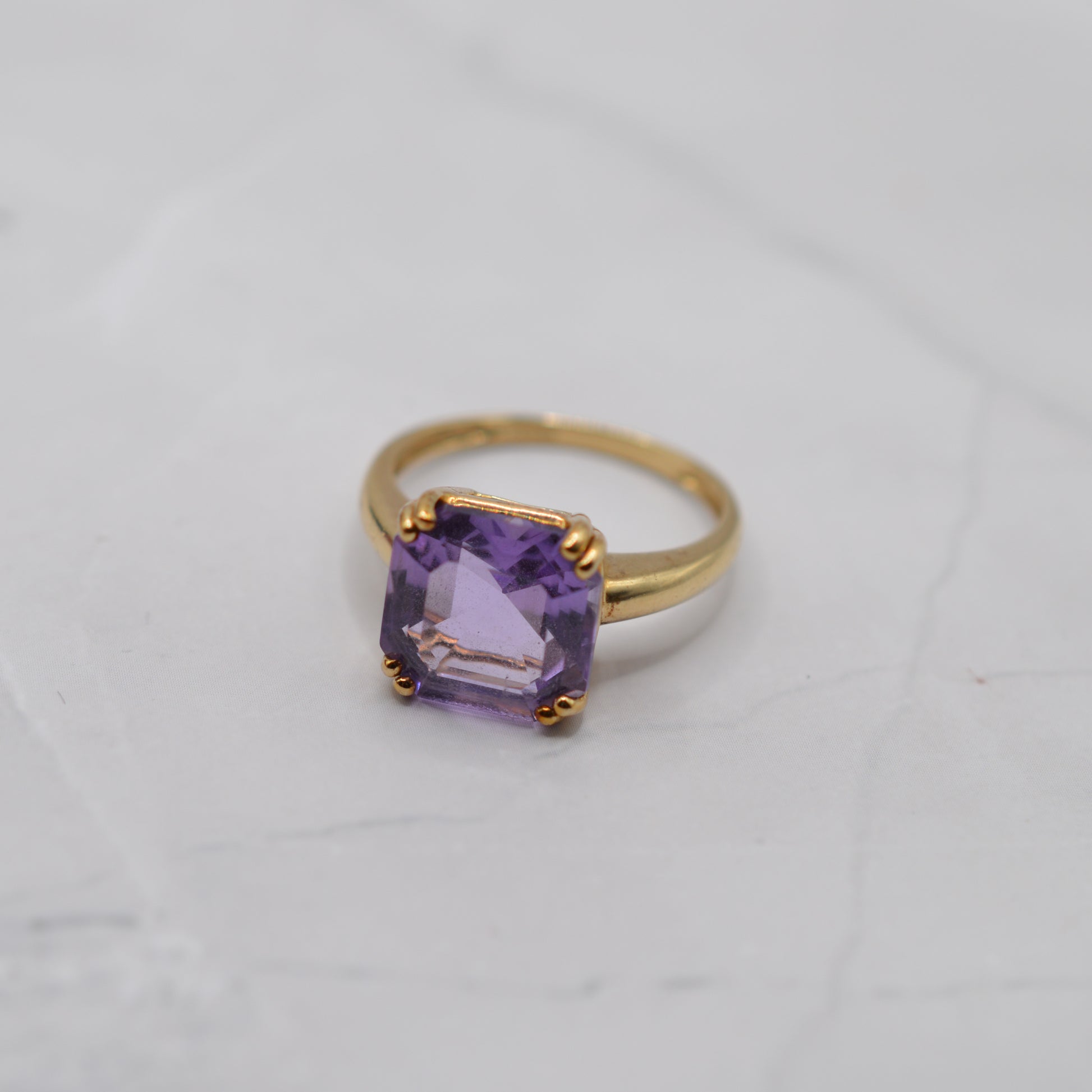 A rather beautiful Y2K-era 9ct gold amethyst solitaire ring. This bold design features a large square-cut amethyst in a gorgeous mid-purple shade with lovely clarity, claw-set in a thick buttery yellow gold band. The stone is substantial and eye-catching, measuring approx. 12mm across, and makes a wonderful cocktail ring for lovers of amethysts, chunky jewellery and/or square-cut gemstones!