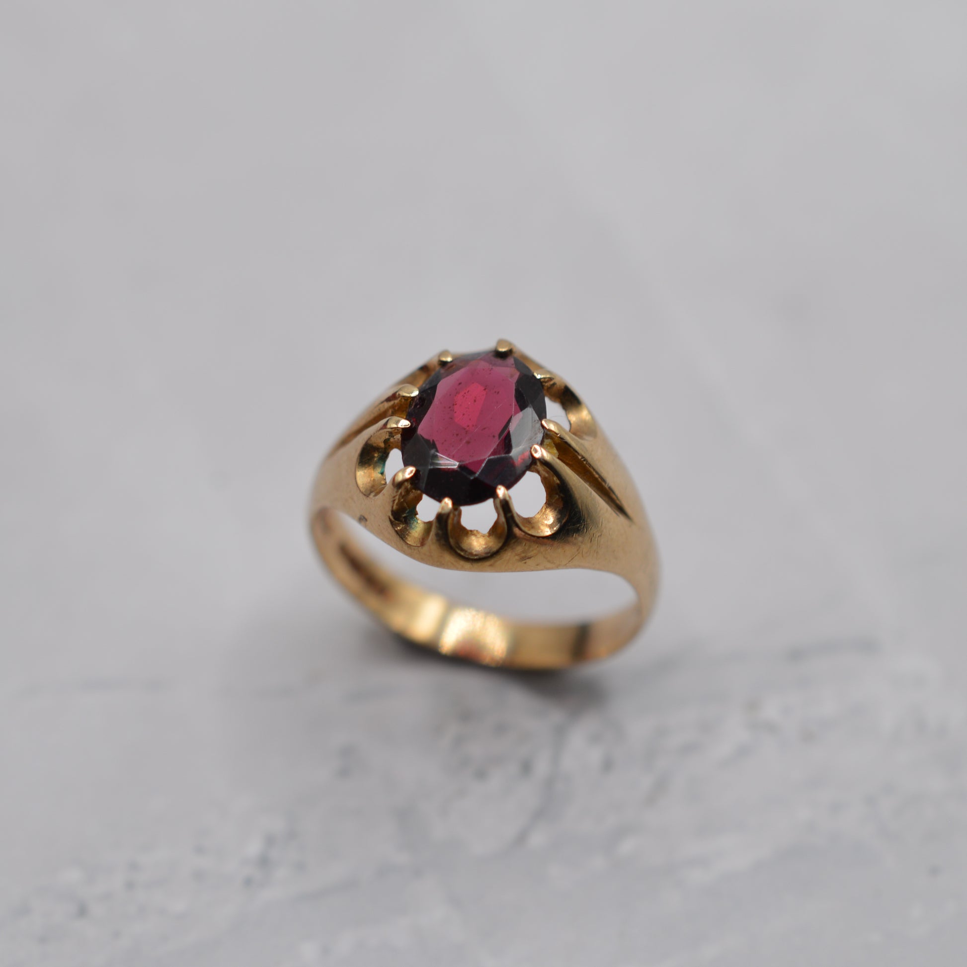 A beautiful and chunky 1970s 9ct gold garnet ring. This vintage beauty features an oval-cut garnet in a rich shade of crime (likely rhodolite garnet), placed in a classic buttercup claw setting, with pierced detailing around the gallery and thick sculpted shoulders. An absolutely wonderful unisex statement ring that's perfect for everyday wear or special occasions.