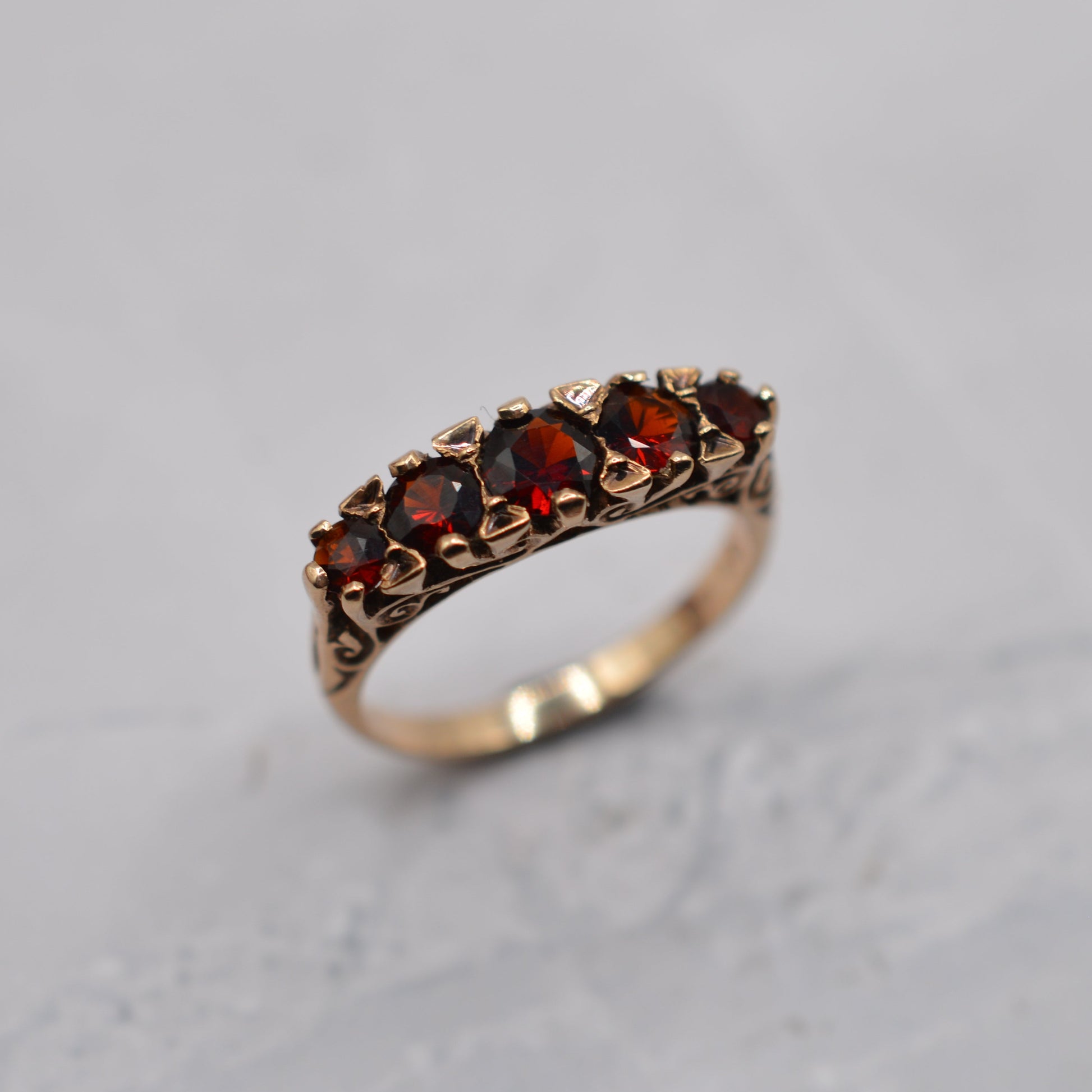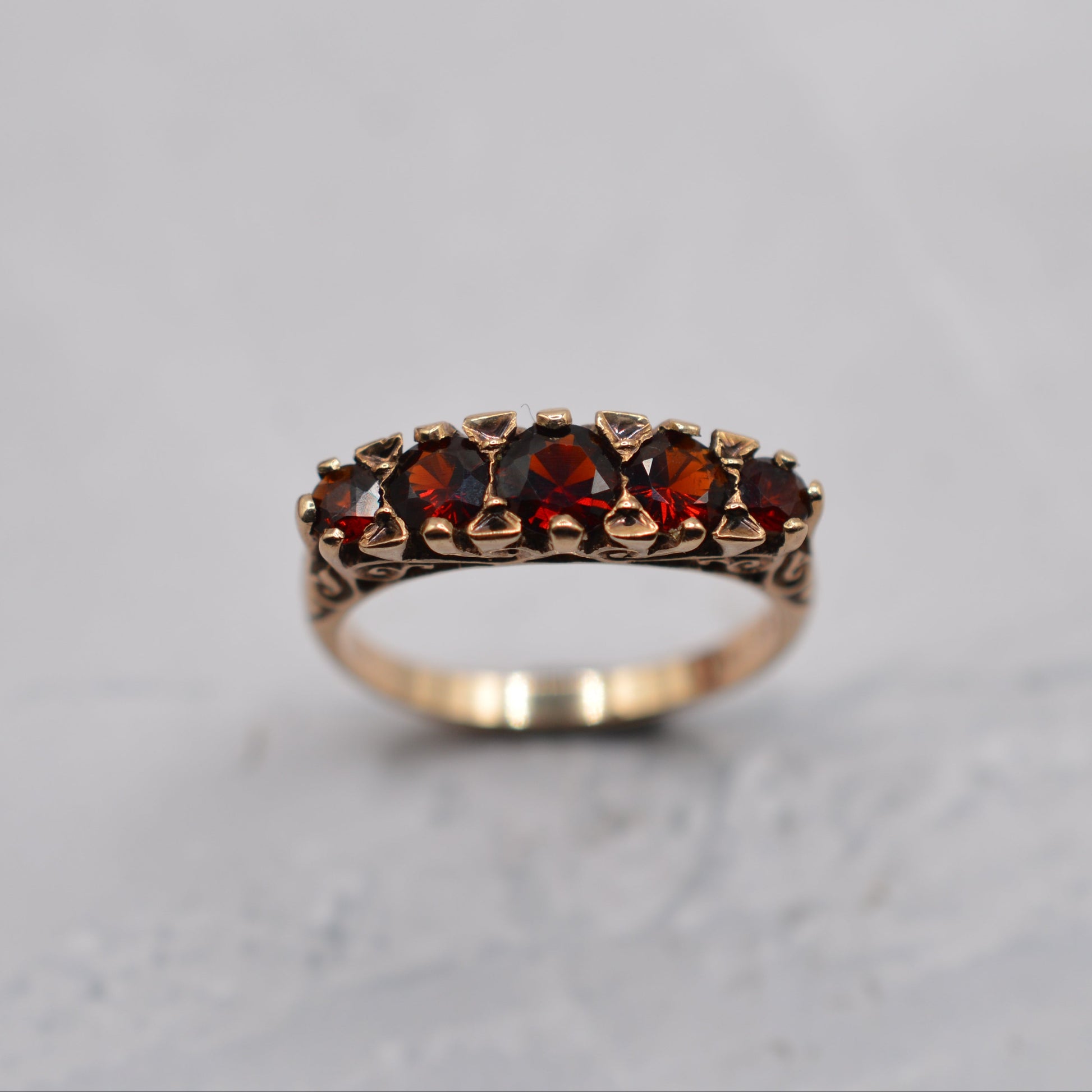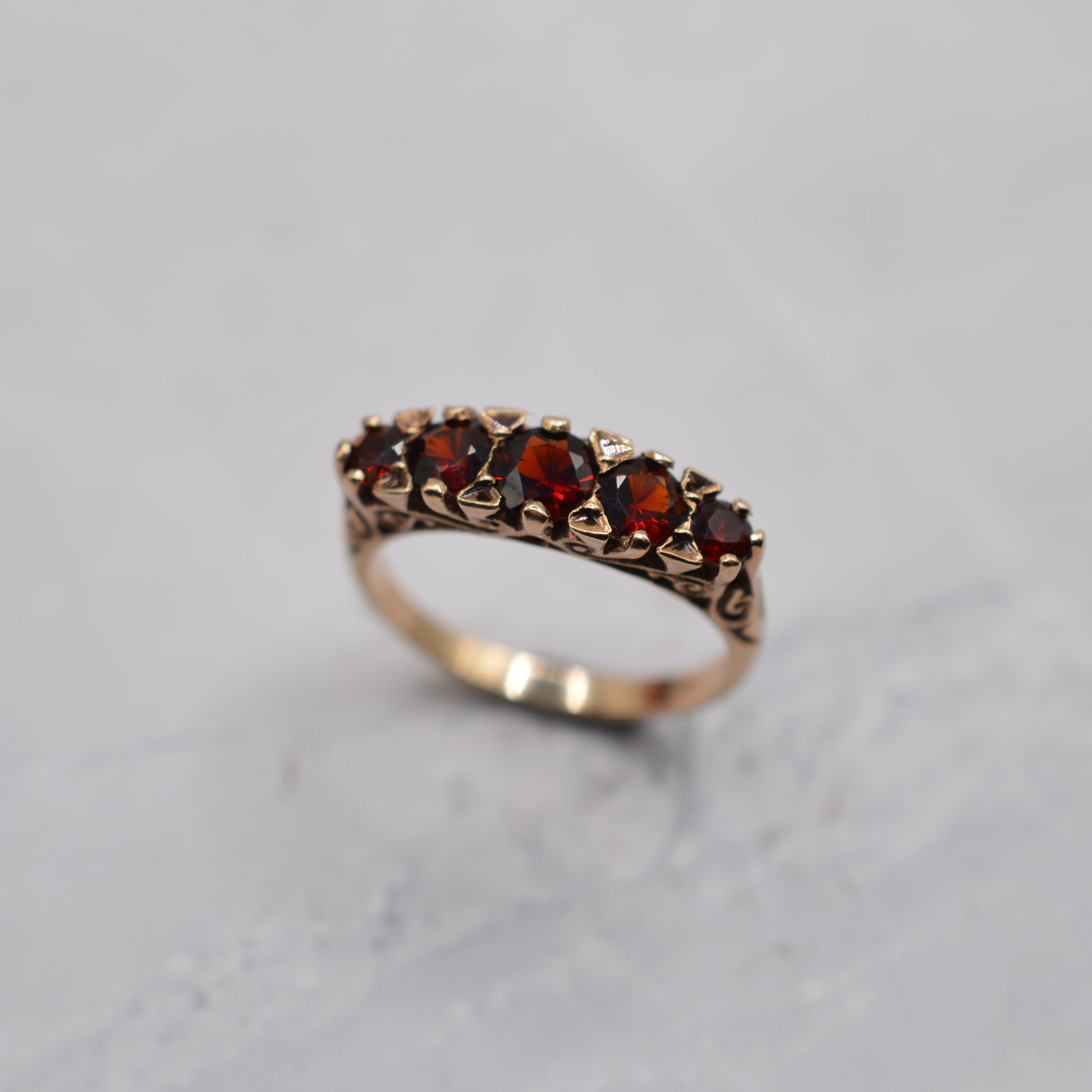 A gorgeous 1960s 9ct gold garnet five-stone ring. This beautiful vintage piece features five graduated round garnets, the largest at the centre measuring approx. 4mm. The gemstones are wonderfully well-matched in a rich, deep fiery red with lovely sparkle and set above a Victorian-inspired swirl-pierced gallery, while the band is wonderfully thick and in a luminous yellow gold.