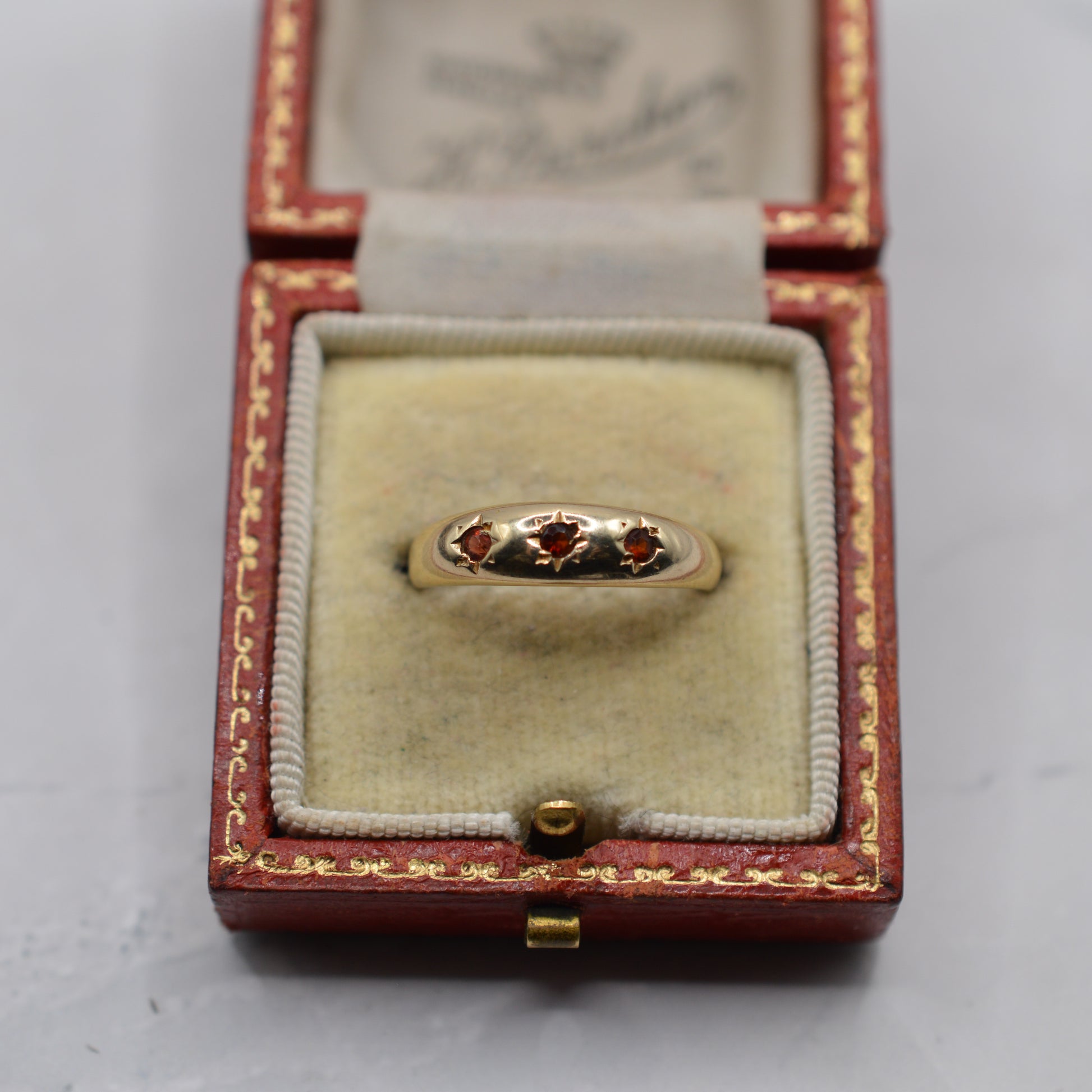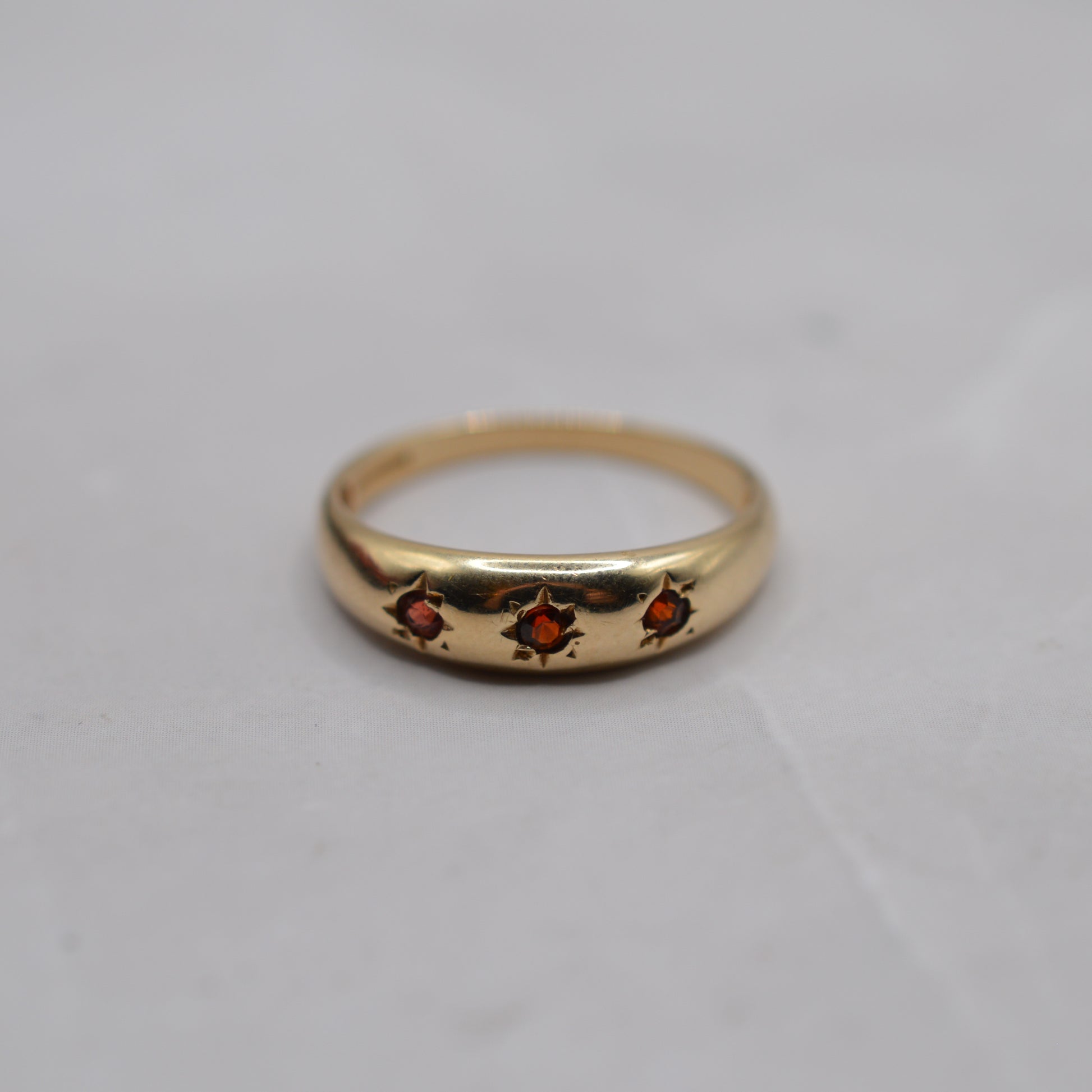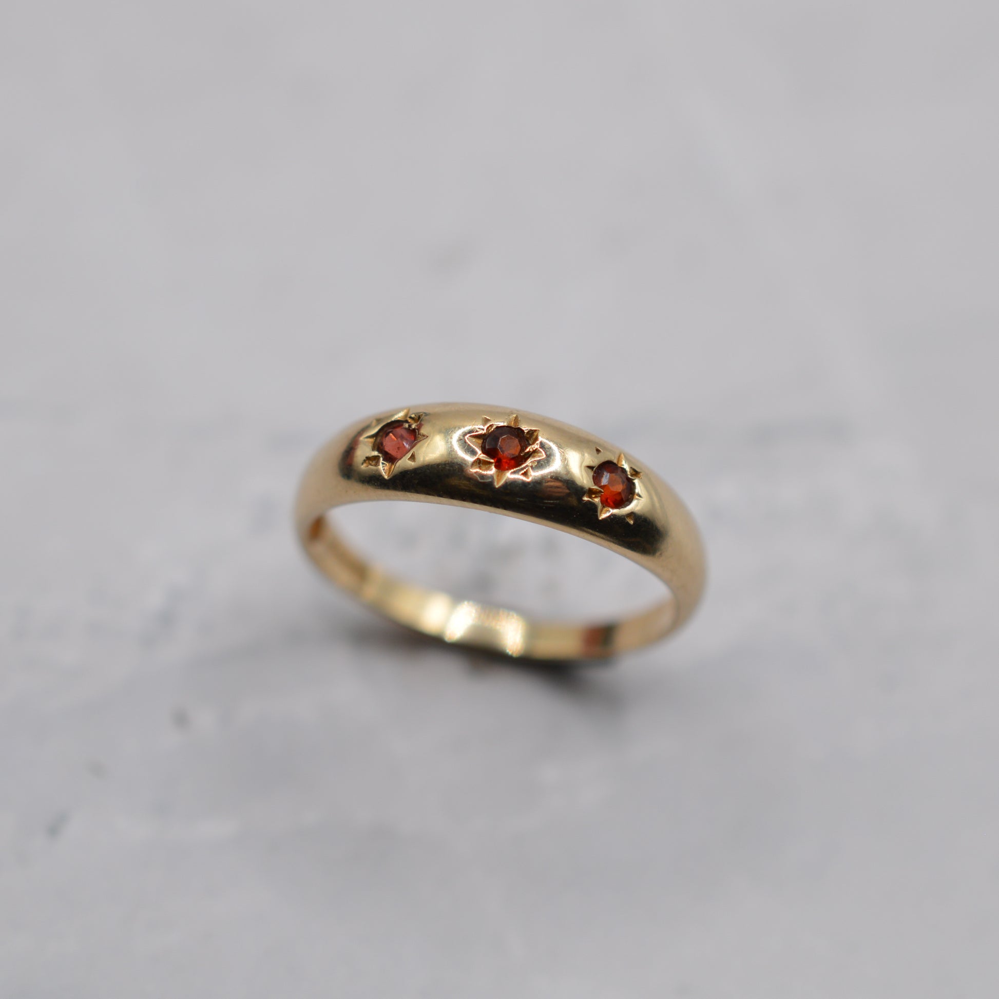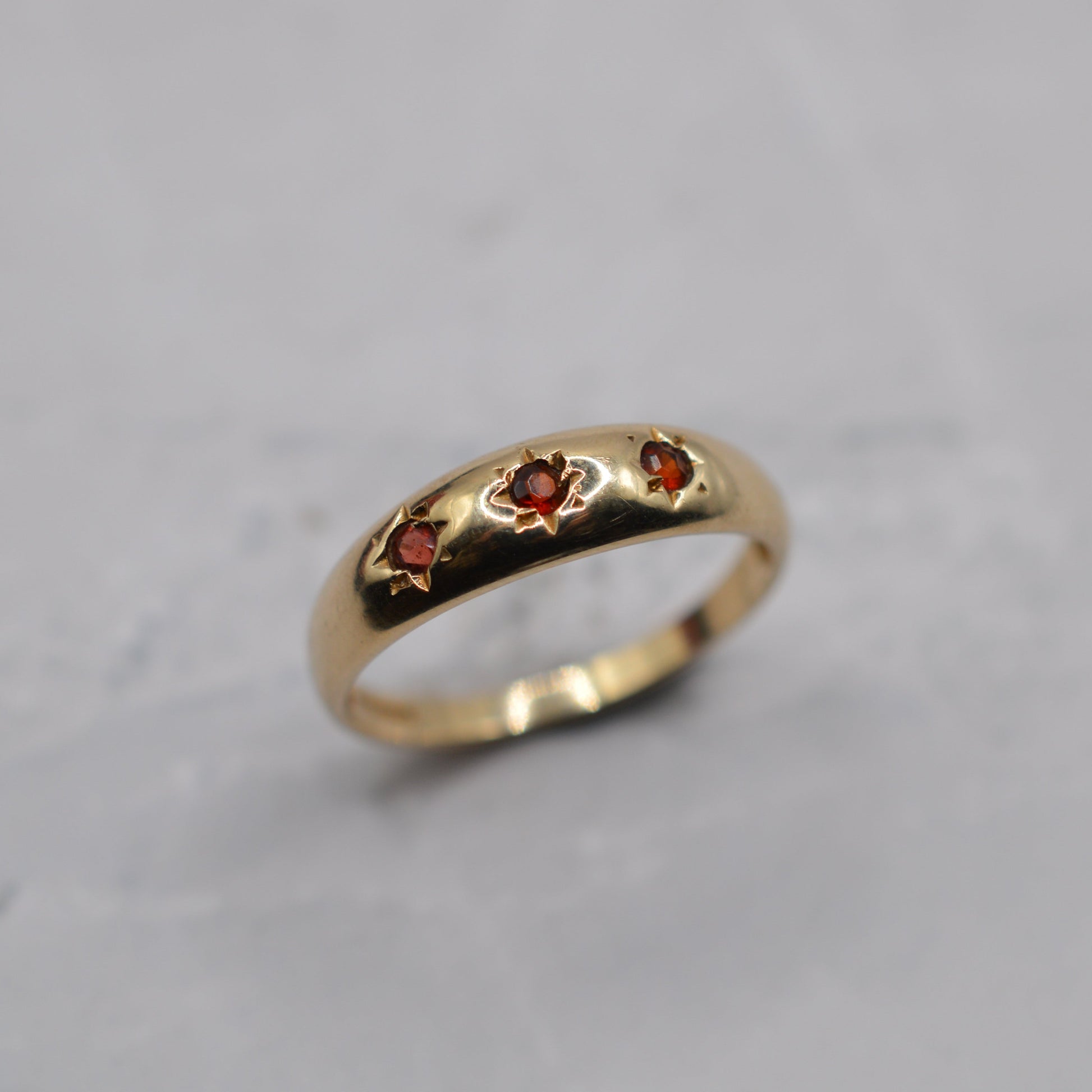 A rather sweet 9ct gold garnet trilogy gypsy ring. This charming piece features three little round garnets in a rich deep red, each star-set into the shiny yellow gold band. Measuring approximately 4mm wide at its widest point, it makes a wonderful stacking ring or a gorgeous everyday ring for any garnet lover.