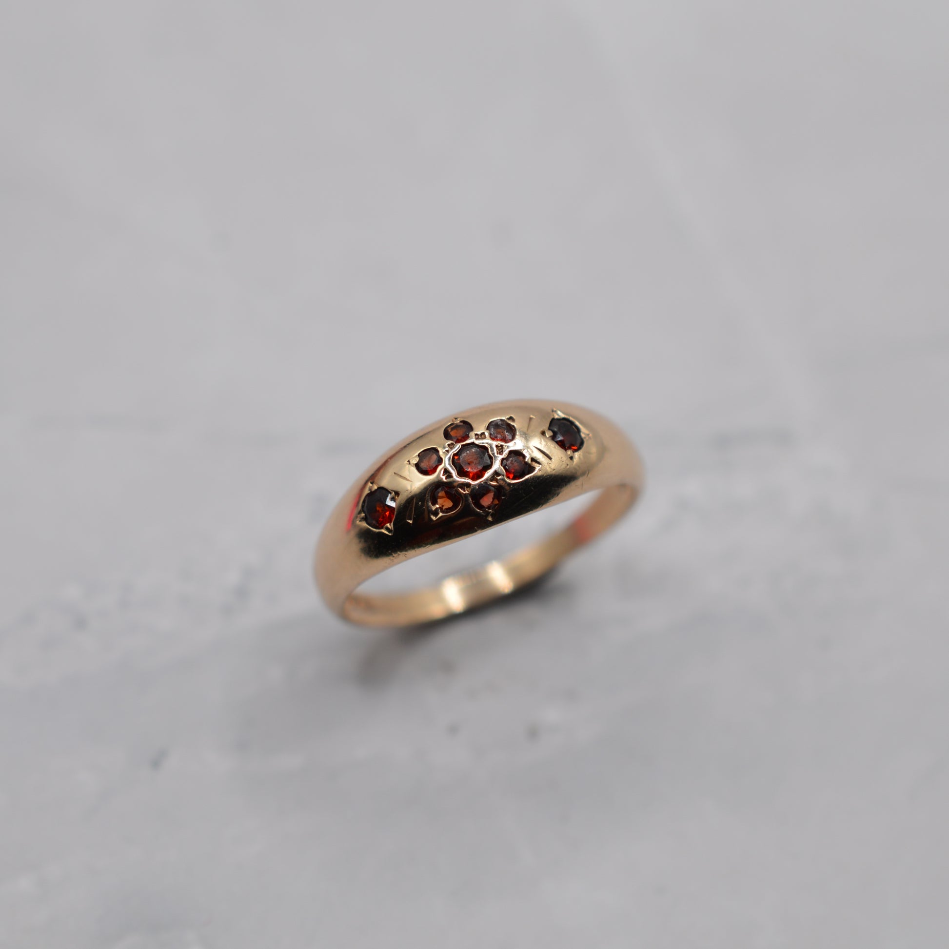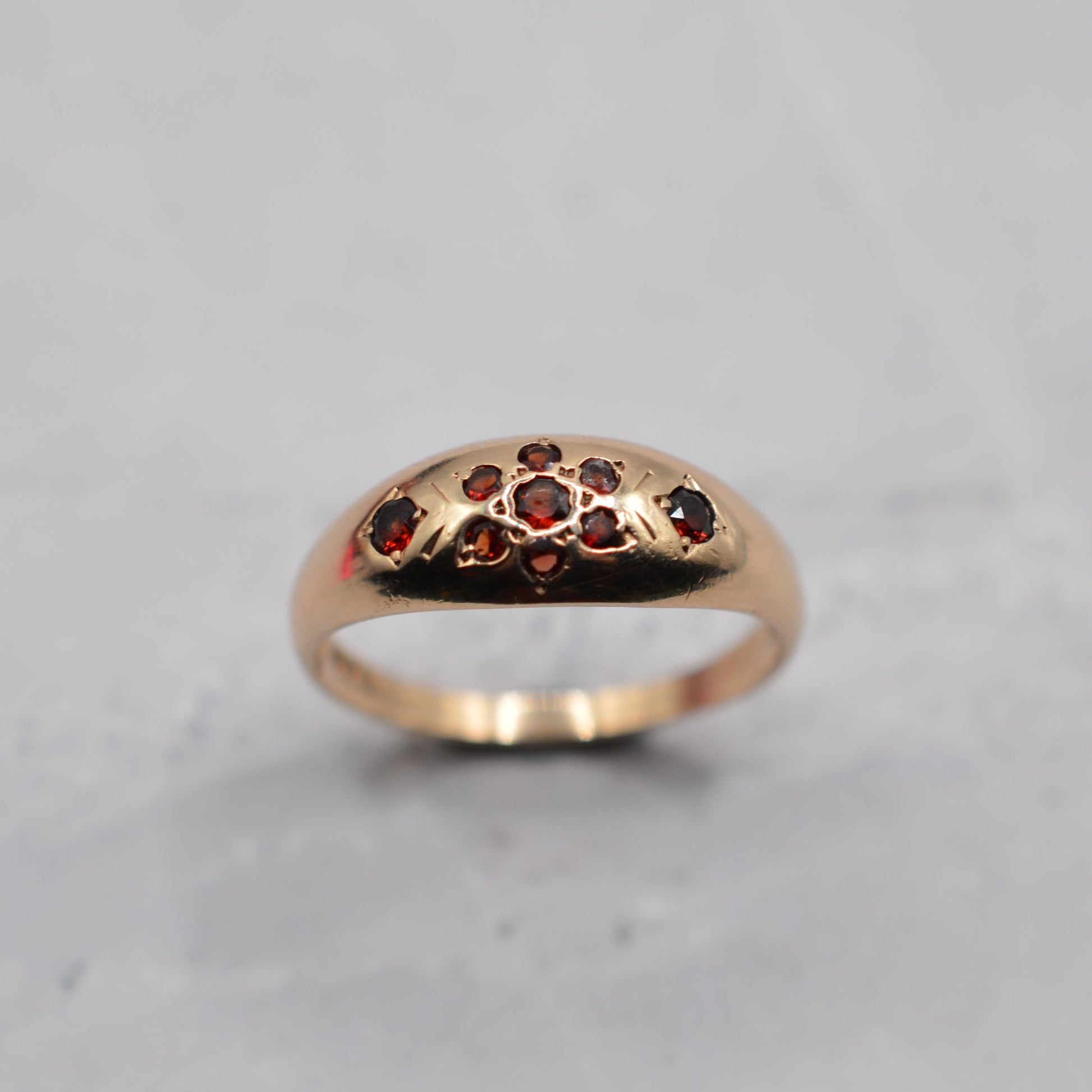 An adorable and quirky 9ct gold garnet dome ring. This charming piece features a beautifully polished gold dome with a floral cluster gypsy-set into the centre, with the flower made of rich red fiery garnets (7 to the ‘flower’ and then an additional garnet flanking the flower on each side). It's an adorable and slightly whimiscal, cottagecore ring that looks gorgeous worn alone or stacked with other bands.