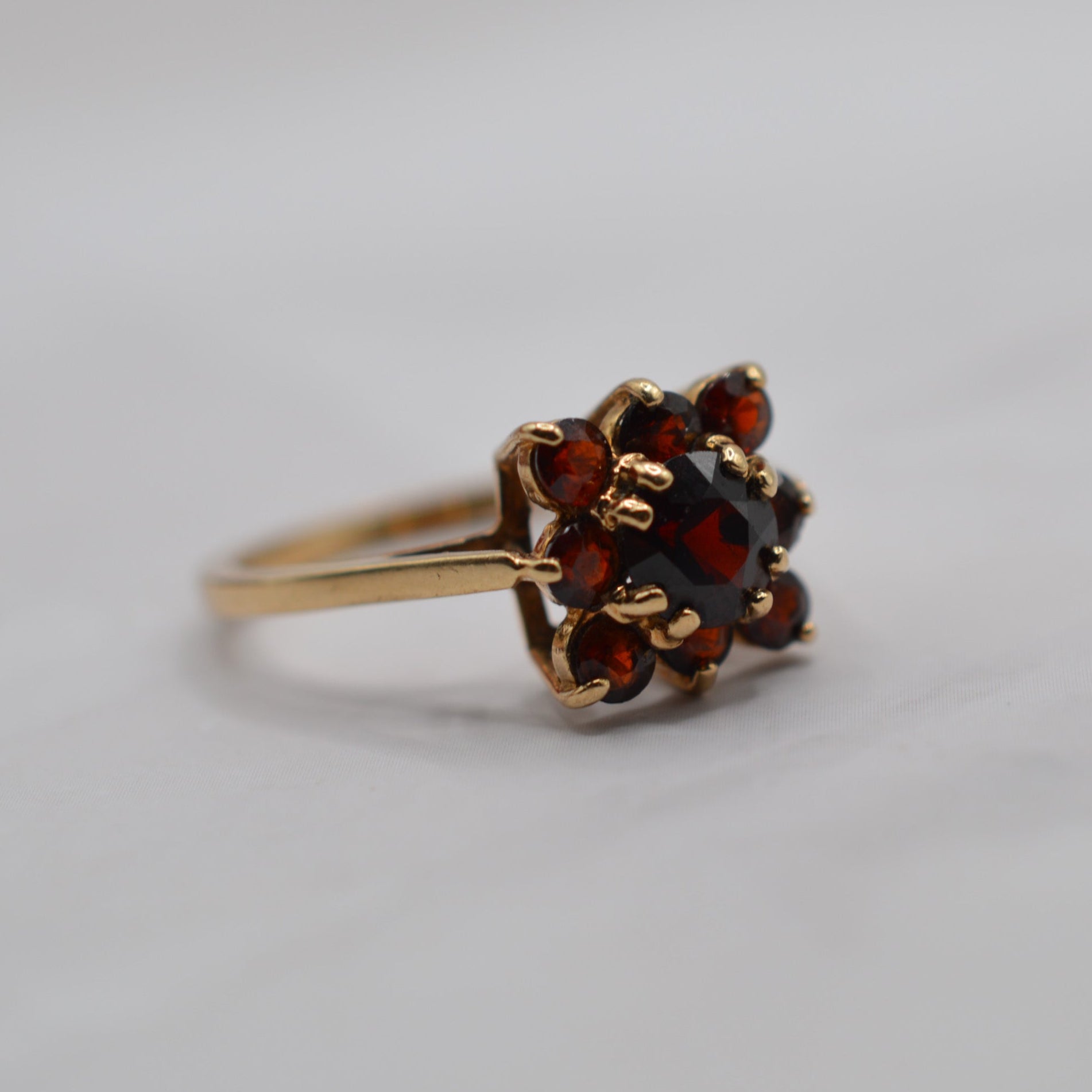A stunning and very unique vintage 9ct gold garnet cluster ring from the 1970s! This fabulous statement piece features a large central round garnet, surrounded by eight additional round garnets, forming a bold square-shaped cluster arrangement. The deep fiery red garnets sparkle beautifully, making this a striking, eye-catching piece with a gorgeous vintage charm.