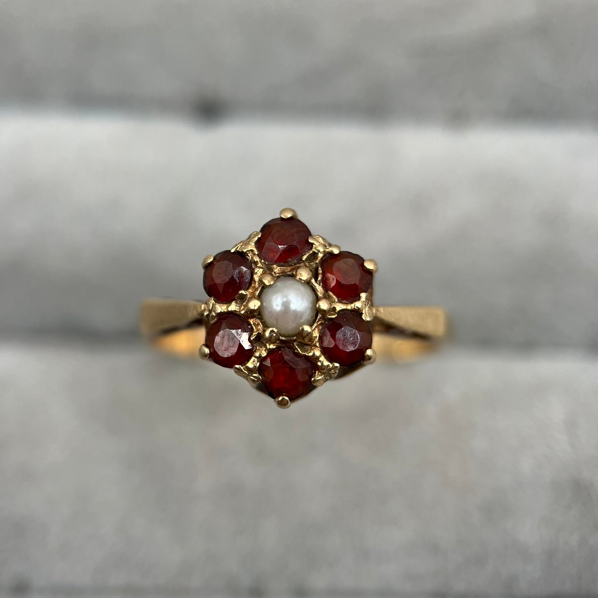 An adorable and charming vintage 9ct gold garnet & pearl floral cluster ring! This sweet piece features a lovely white pearl at the centre, framed by a ring of six round garnets in a warm, glowing shade of red. The floral design gives it a classic boho/hippie vibe, making it a perfect everyday piece for the upcoming spring & summer.
