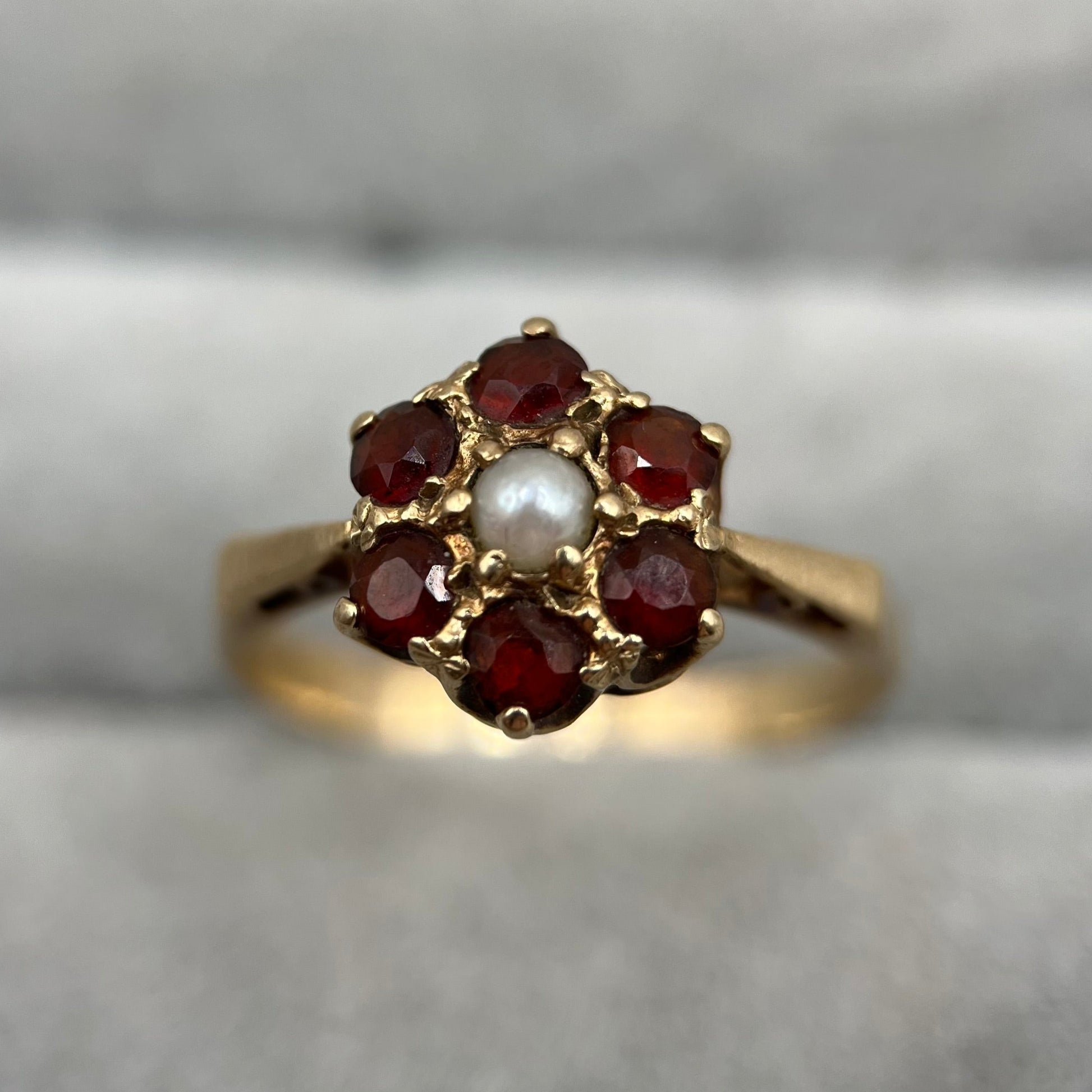 Vintage 9ct Gold Garnet & Pearl Floral Cluster Ring