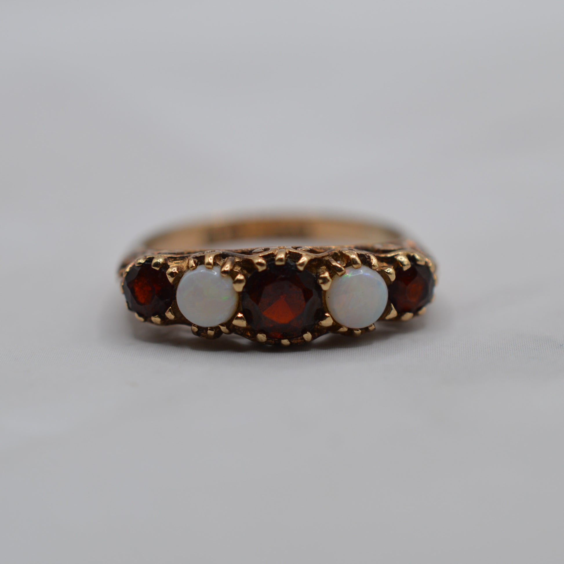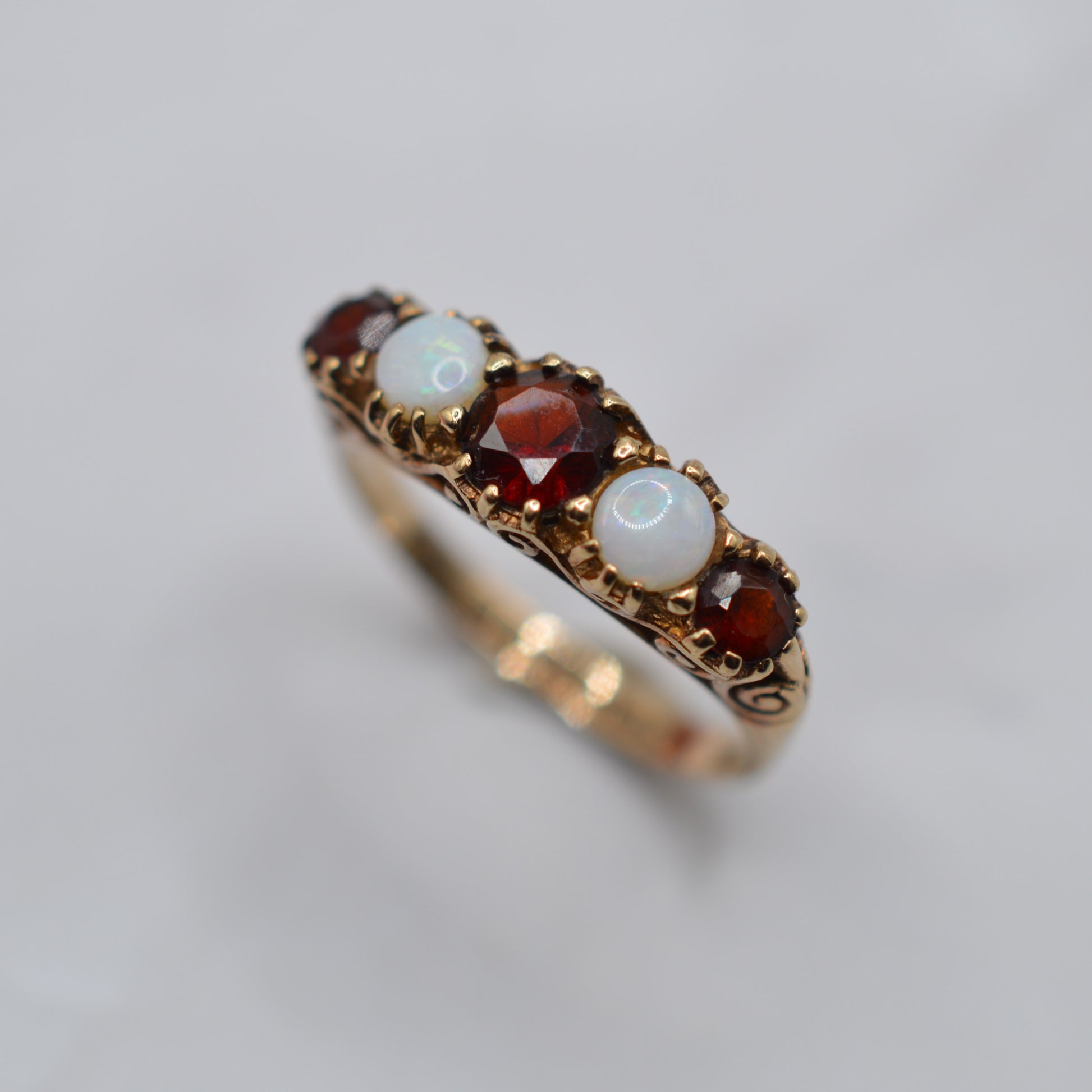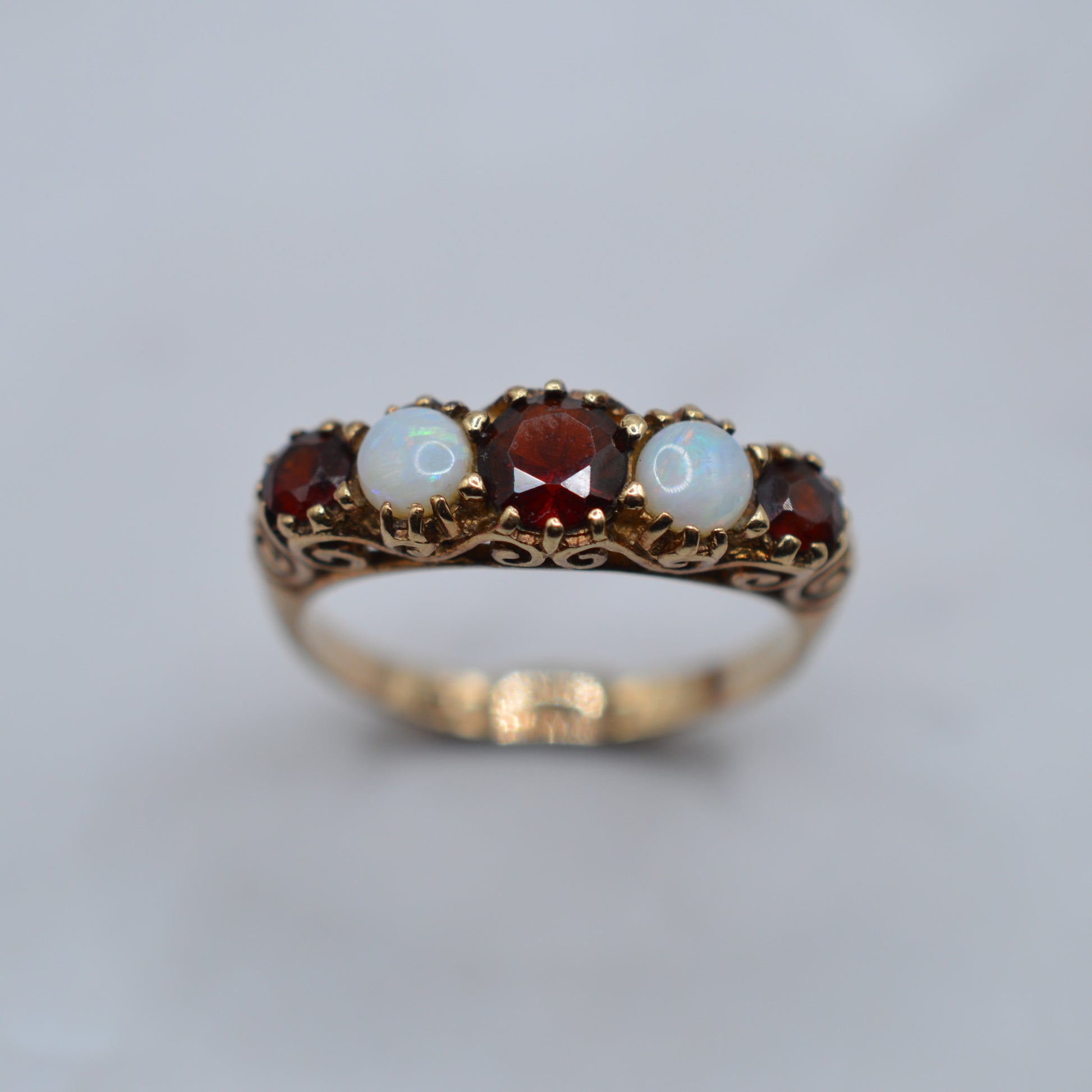 A rather elegant vintage 9ct gold five-stone opal and garnet ring! This beautiful 1990s piece features an alternating row of opals and garnets, the opals glowing with lovely colour play and the garnets in a rich, warm red. The stones are set in a classic boat-style setting with a swirl-pierced gallery, giving it a romantic, Victorian-inspired aesthetic.