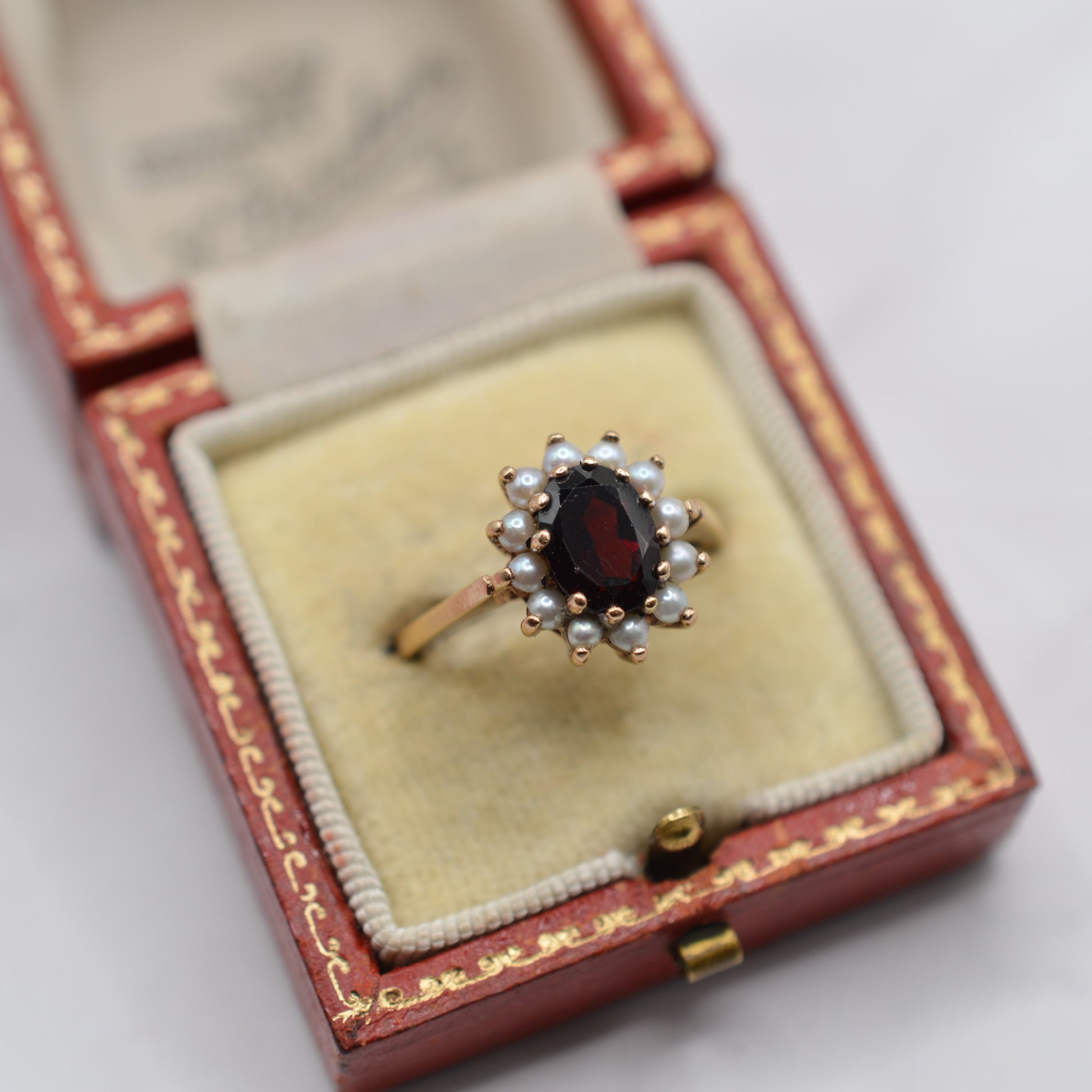 A complimentary ring box will be provided, making this lovely garnet and pearl ring a perfect gift or a glamorous addition to your vintage collection.