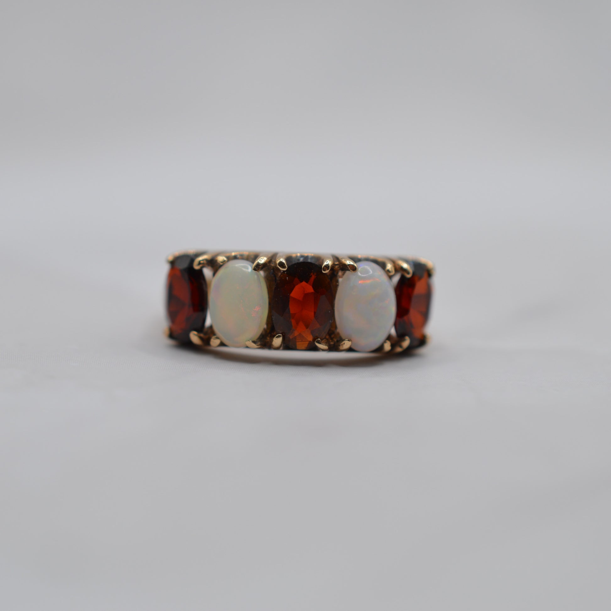 1970s Vintage 9ct Gold Garnet & Opal Five-Stone Ring