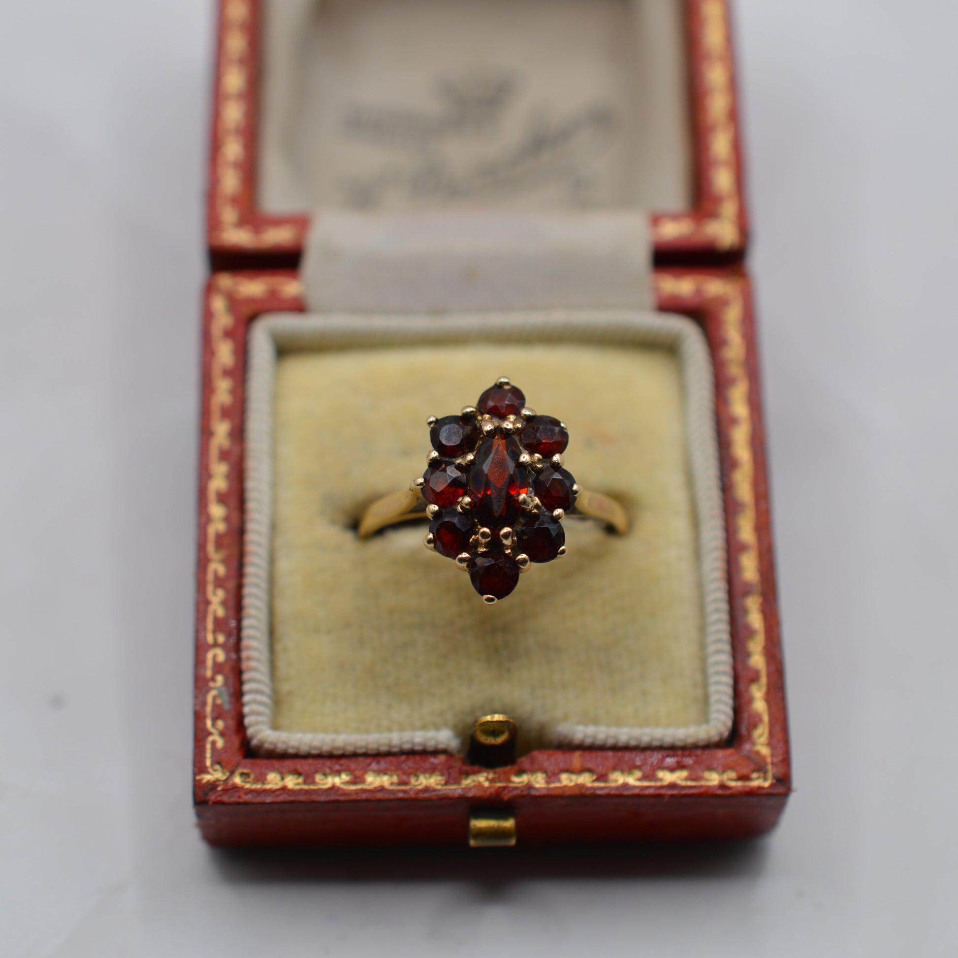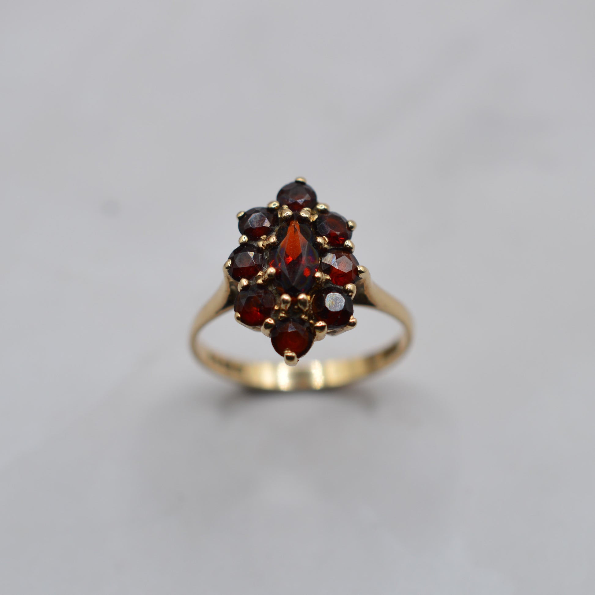 A rather lovely 9ct gold garnet cluster ring in a classic marquise shape. This striking 1970s piece features a marquise-cut garnet at the centre, surrounded by a halo of eight round garnets, all in a deep, rich shade of red. Such a lovely gemstone cluster!