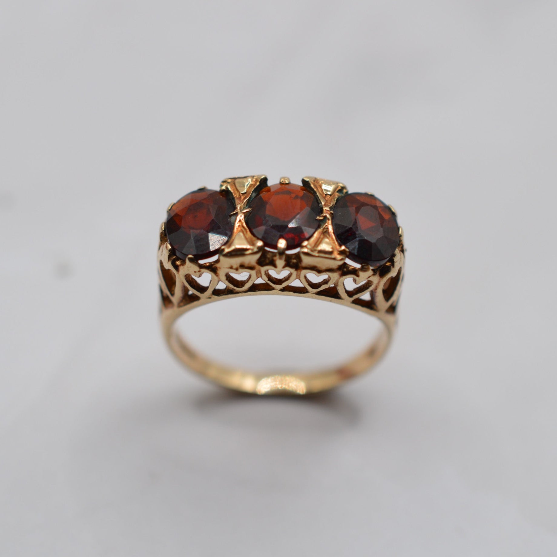 1970s Chunky Vintage 9ct Gold Garnet Trilogy Ring with Heart-Pierced Gallery