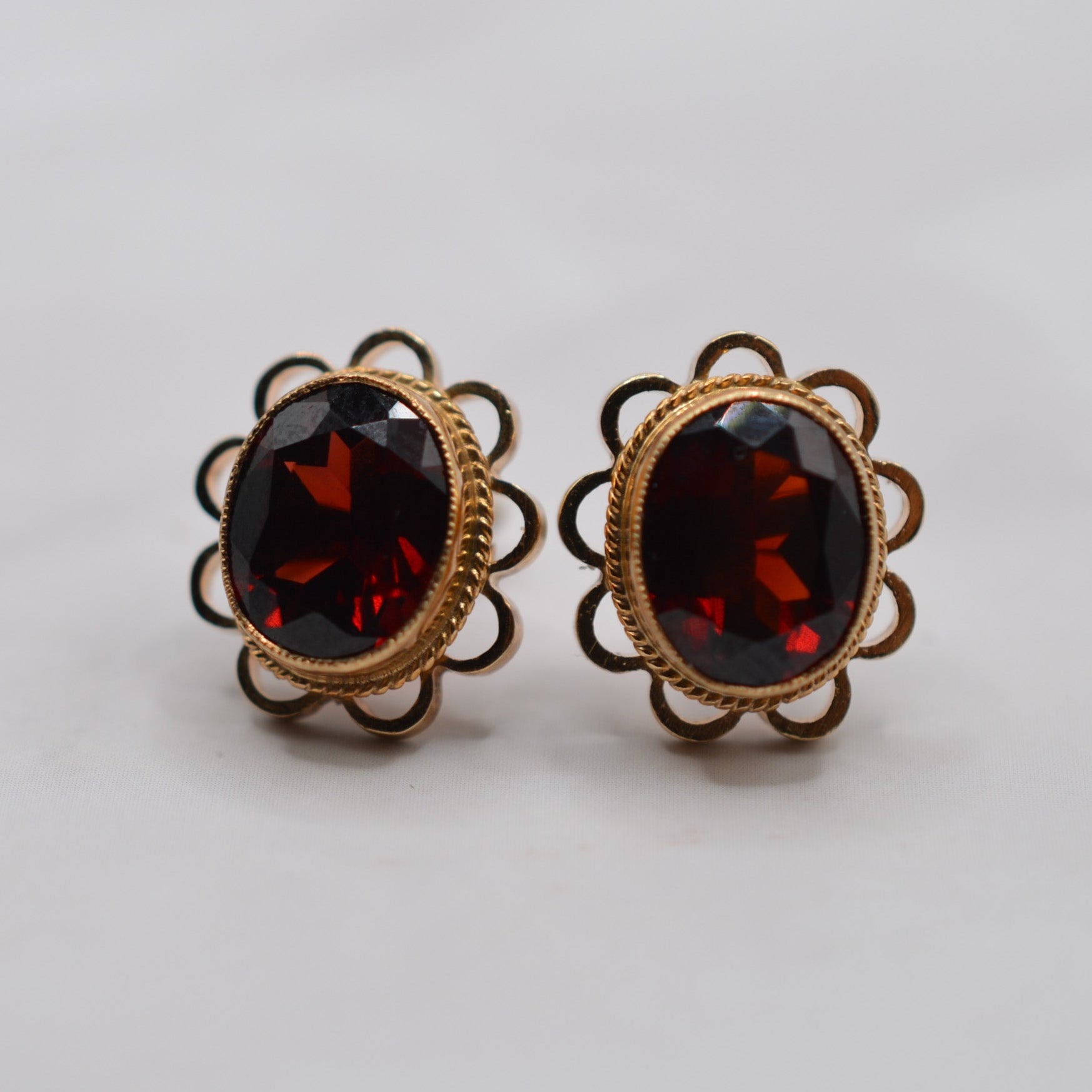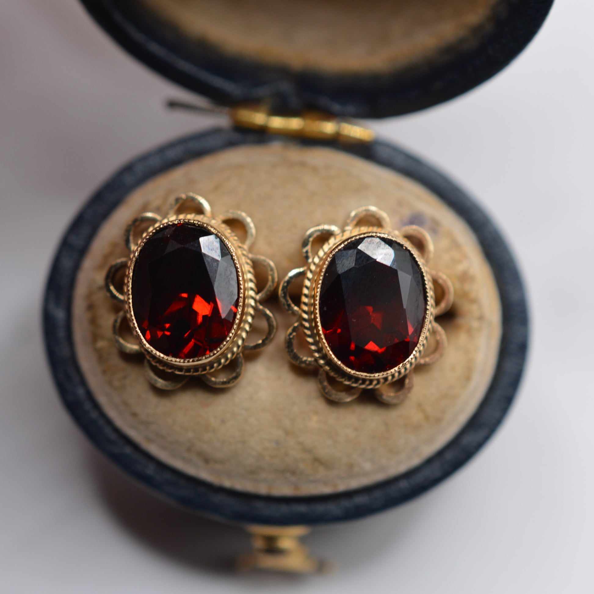 A beauuuuutiful and eye-catching pair of large 9ct gold garnet stud earrings! Each stud features an oval-shaped garnet in a fiery shade of red, framed by a luxurious scallop-edge gold border. These are beautifully bold earrings - chunky, heavy and luxurious, perfect for those looking for a pair of statement studs. The garnets are well-matched and have deep brilliance and sparkle, making them utterly dazzling.