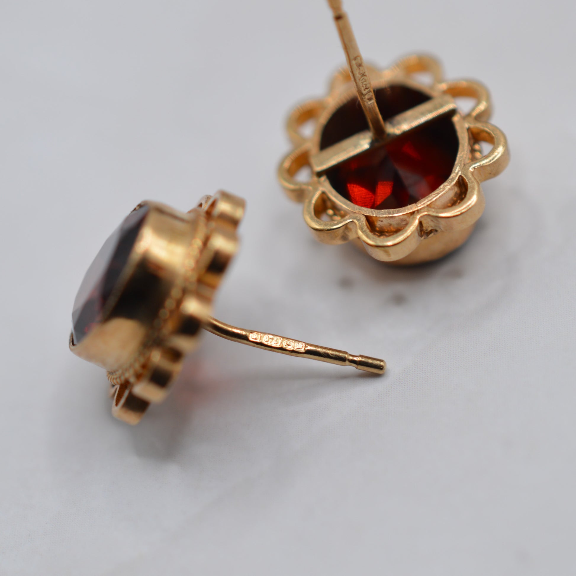 1990s Large 9ct Gold Garnet Stud Earrings with Scallop Edging