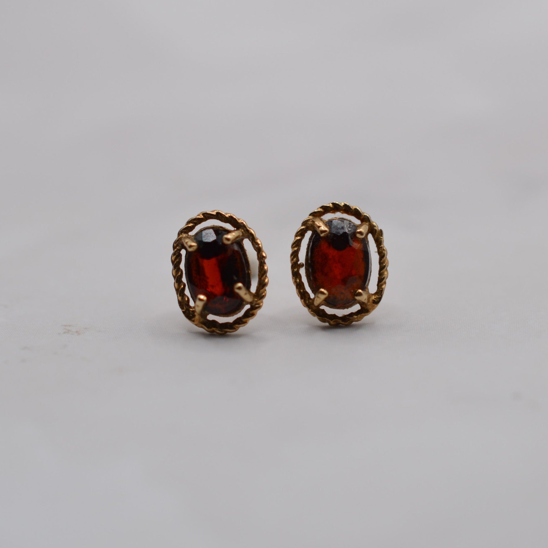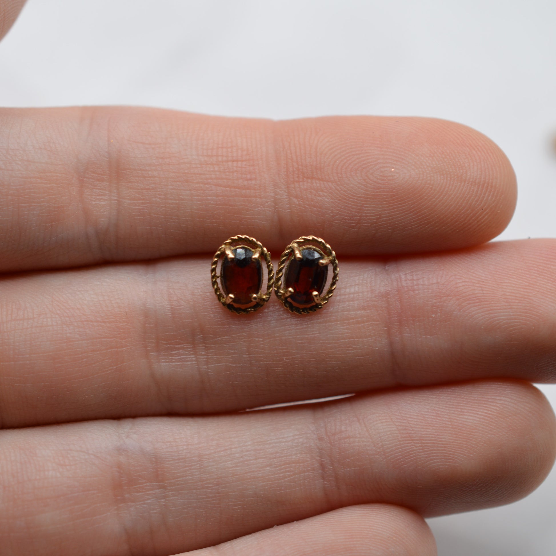 A very sweet pair of vintage 9ct gold garnet stud earrings These charming little 1960s earrings each feature an oval-cut garnet in a warm shade of red, framed by a decorative rope-twist border. Petite and pretty, they’re perfect for everyday wear, adding a subtle pop of colour with mid-century charm.