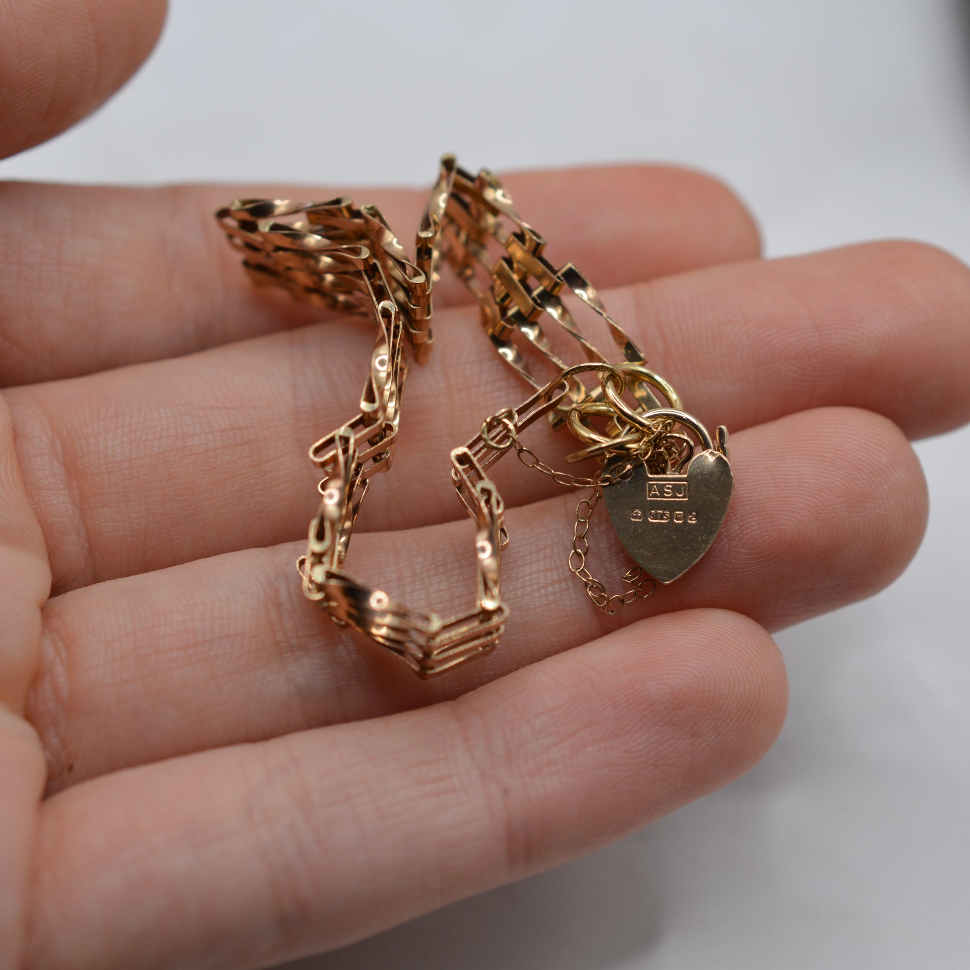 1980s 9ct Gold Gate Link Bracelet with Heart Padlock & Safety Chain (7")
