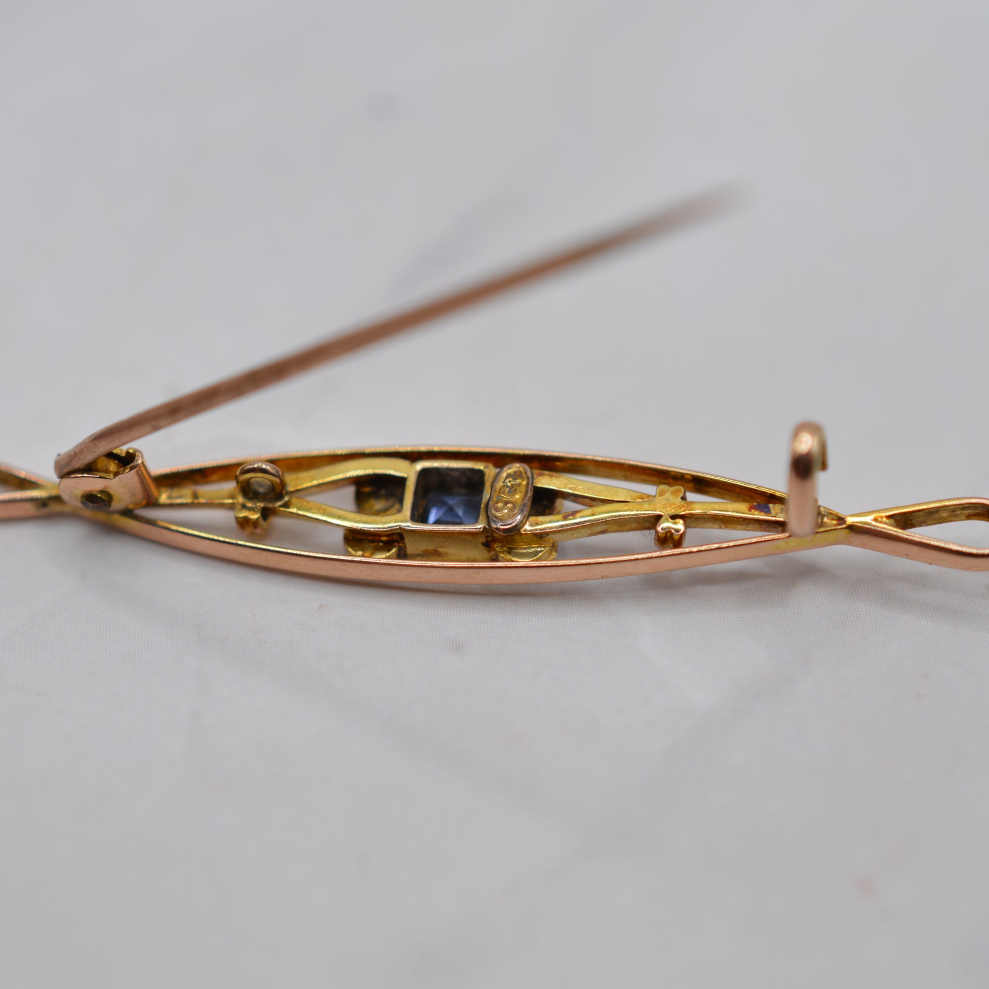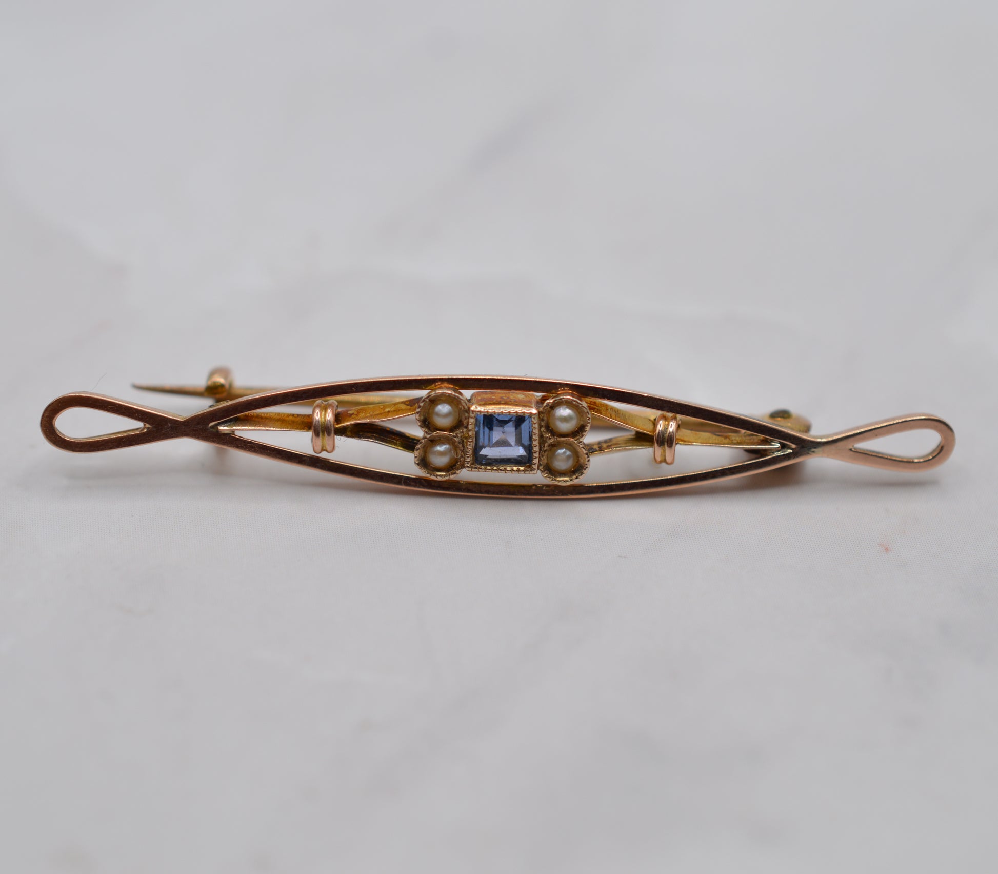 A gorgeous little antique Edwardian 9ct gold brooch featuring blue topaz and seed pearls. This elegant openwork design centres on a square-cut blue topaz with excellent clarity and a lovely warm shade of blue, flanked by two little white seed pearls either side for contrast. Crafted in yellow-rose gold (somewhere between the two!), the brooch measures approx. 46mm across and is stamped 9ct on the reverse. It's a truly charming Edwardian piece perfect for adding a touch of antique elegance to coats, blouses or scarves.