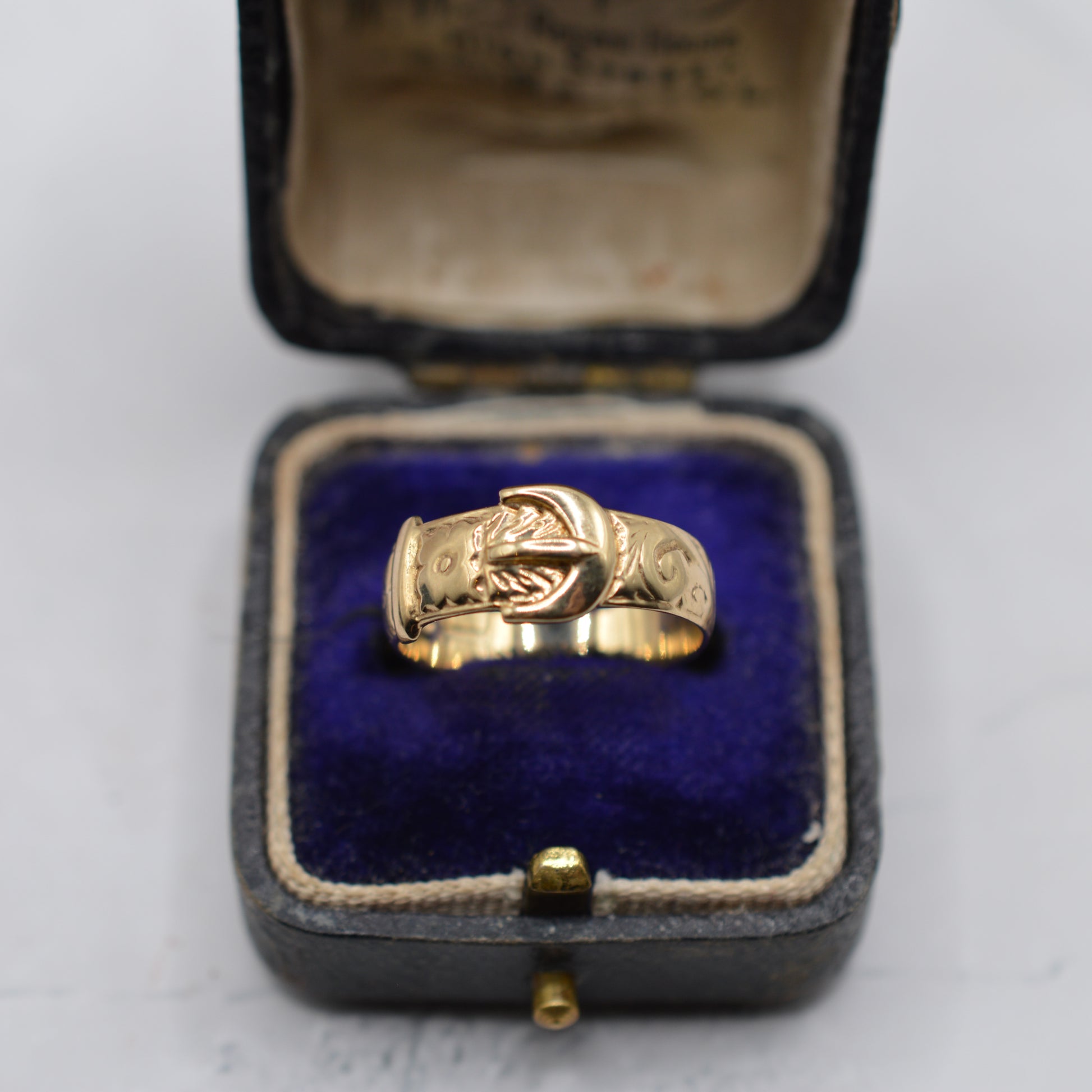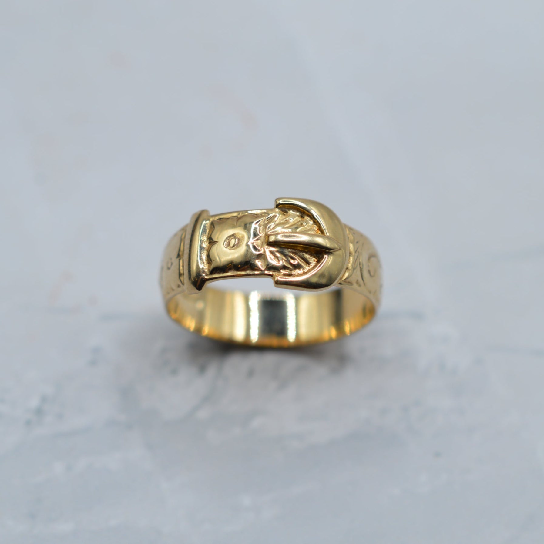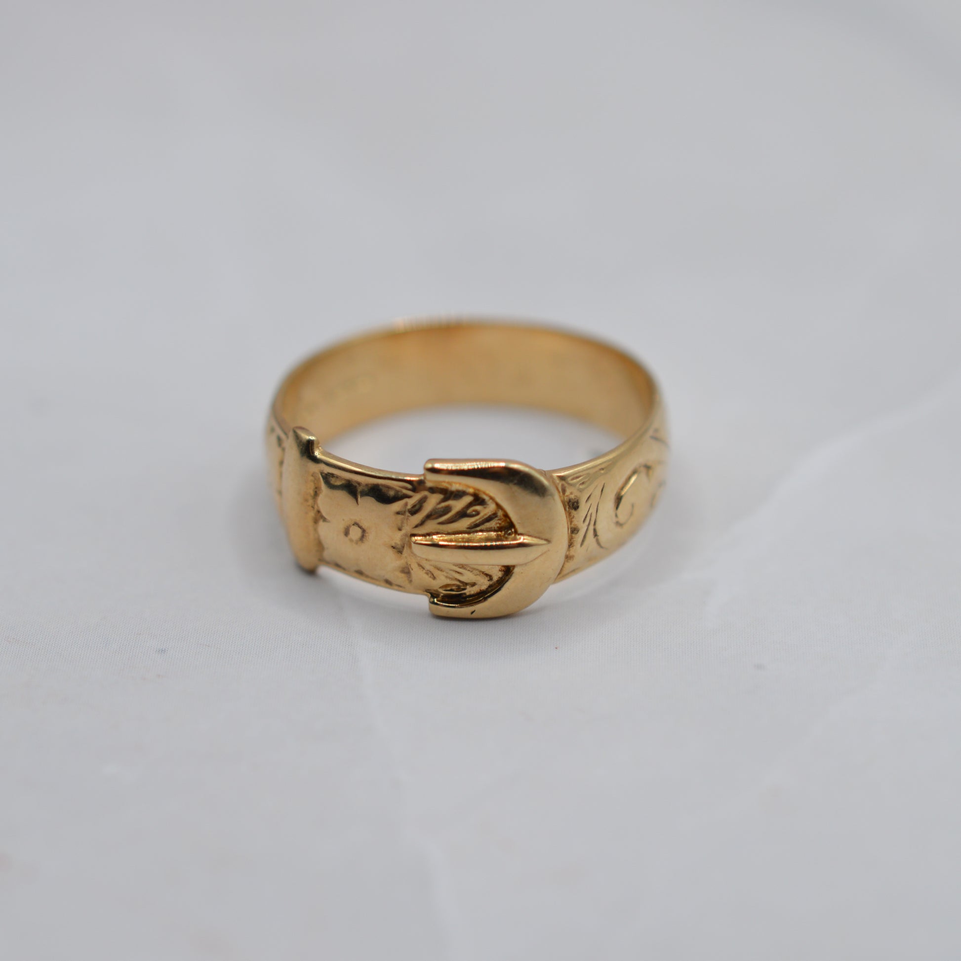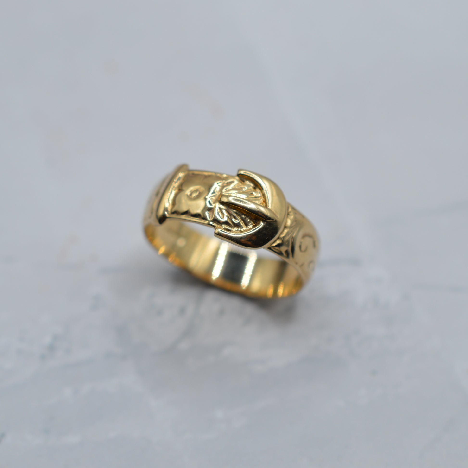 A fabulous vintage 9ct gold buckle ring! This eye-catching statement piece features a classic belt-and-buckle design adorned with beautiful swirl and flower engravings across the band, adding a touch of Western & boho charm. A chunky ring with a 6mm band (approx.) that's sure to get compliments!